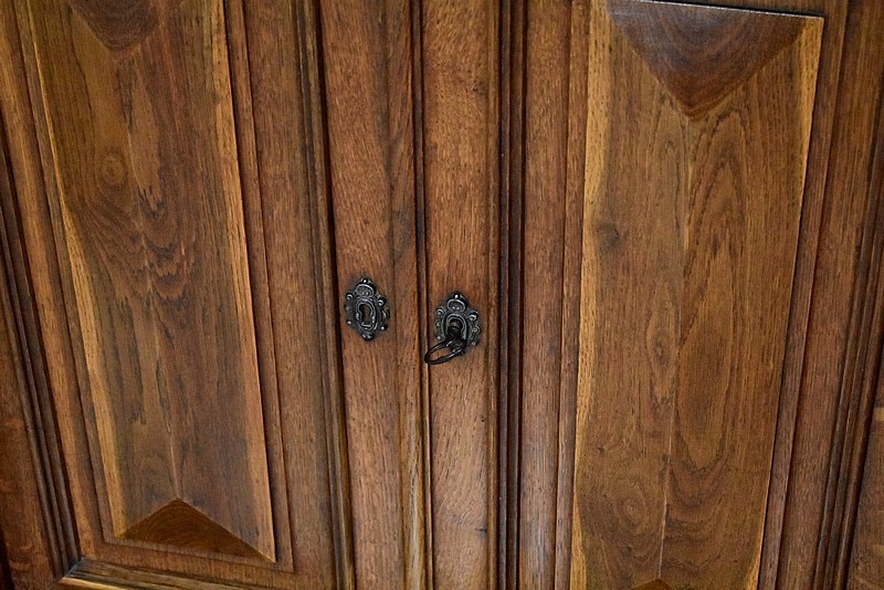 Les deux portes sont encadrées de deux colonnes détachées moulurées et baguées et en dessous, est disposée une petite étagère à épices à décor de balustres.