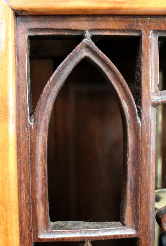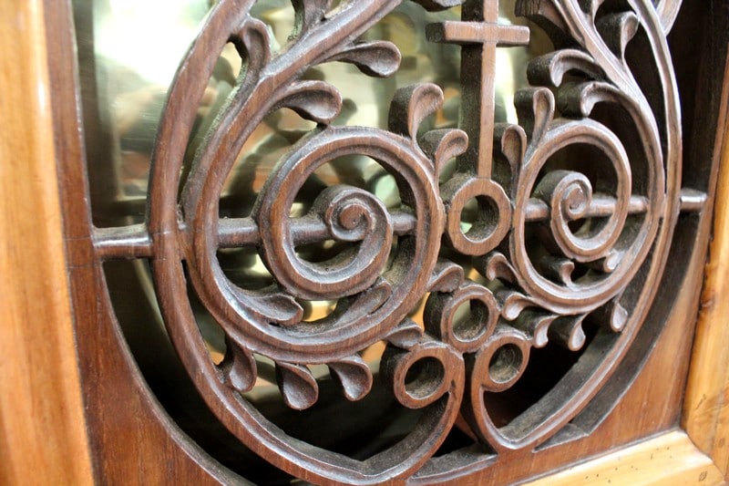 Au milieu, une porte ajourée ouvrant par un bouton en Laiton, est agrémentée d’une Sculpture en Acacia Découpé, représentant les Ogives Catholiques Gothiques. Elle abrite un Balancier à Lyre en Laiton, en état de fonctionnement.