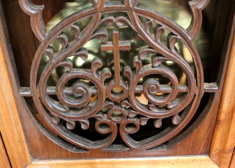 Cet ensemble est sommé d’un Généreux Fronton, avec Consoles Latérales Dentelées et taillées en enroulements. Au centre, une Corniche en Chapeau de Gendarme épouse une petite porte Vitrée renfermant la tête d’Horloge. Cette dernière est enjolivée d’une scène religieuse en Laiton, représentant quatre personnages et un mouton.