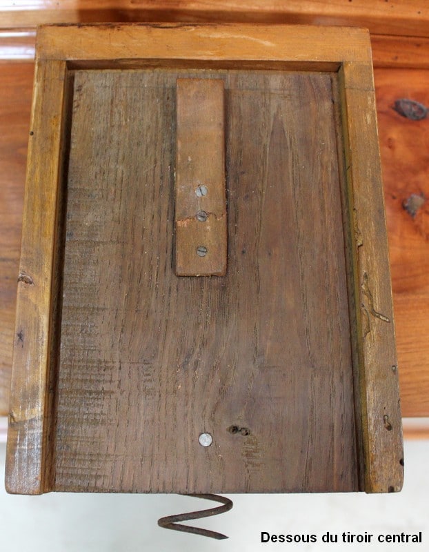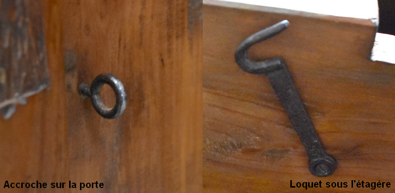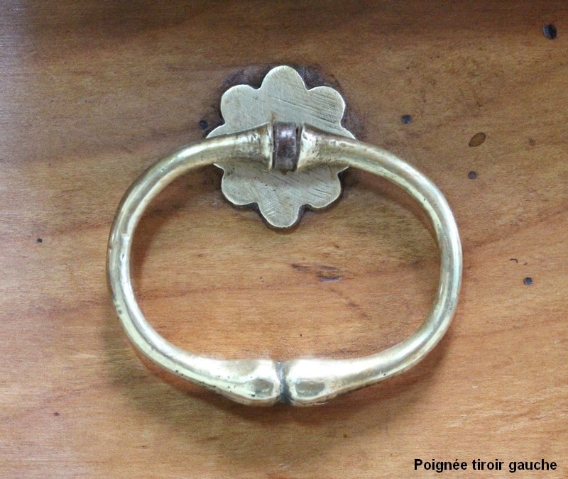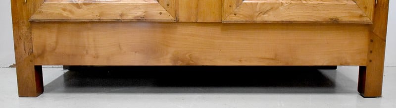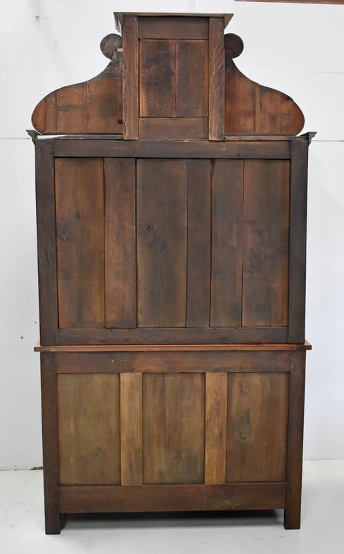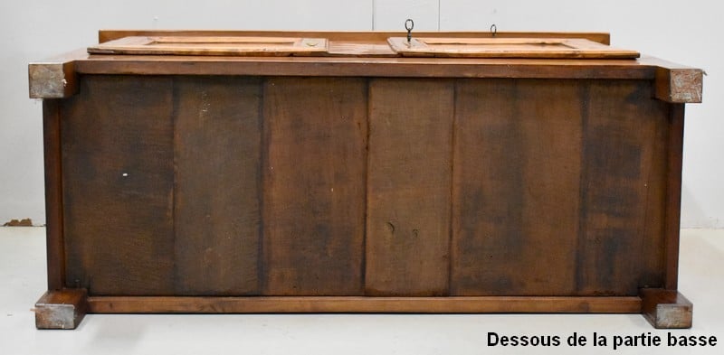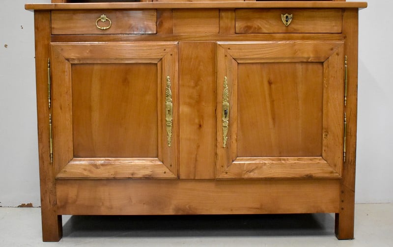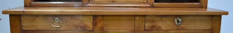 La partie basse de ce Buffet Deux Corps est composée de deux portes avec panneaux en Merisier et encadrements en Frêne. Elles sont pourvues d’entrées en Laiton, et de serrures en état de fonctionnement accompagnées de leurs clefs. L’intérieur est équipé d’une étagère posée sur tasseaux fixes. En ceinture, ce Meuble propose deux tiroirs. Celui de gauche est doté d’une poignée de tirage fixée sur un motif floral, celui de droite d’une entrée de serrure en forme d’écusson. Toutes ces garnitures sont d’Origine. Un dernier tiroir est dissimulé au milieu des deux autres. Il se dévoile à l’aide d’un poussoir accessible depuis l’intérieur de la partie basse.