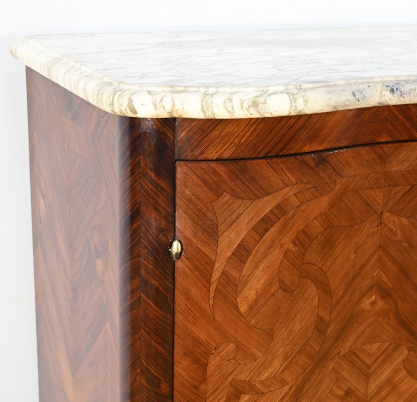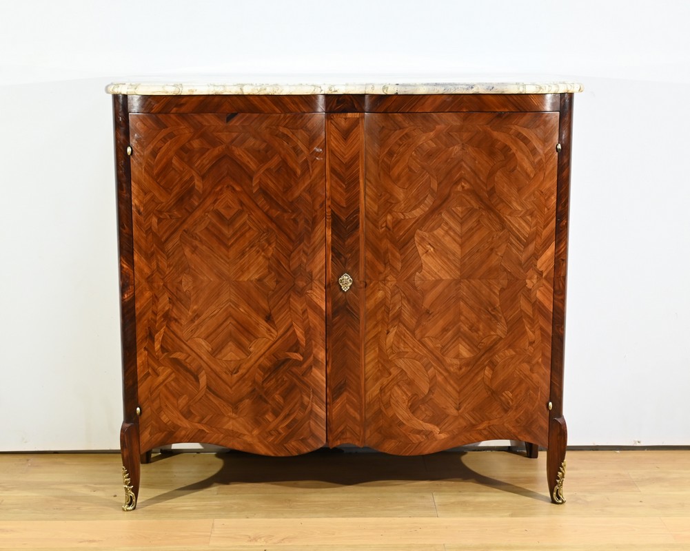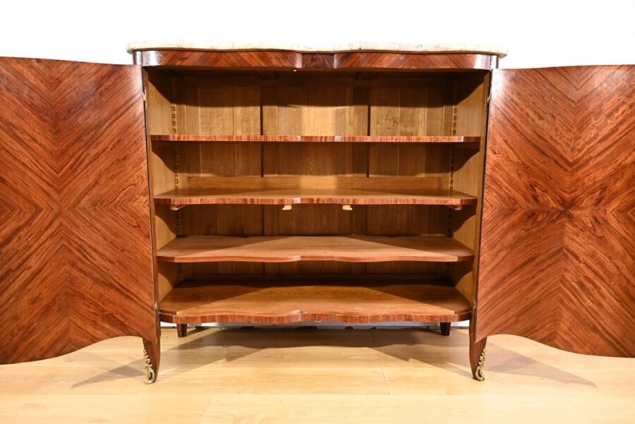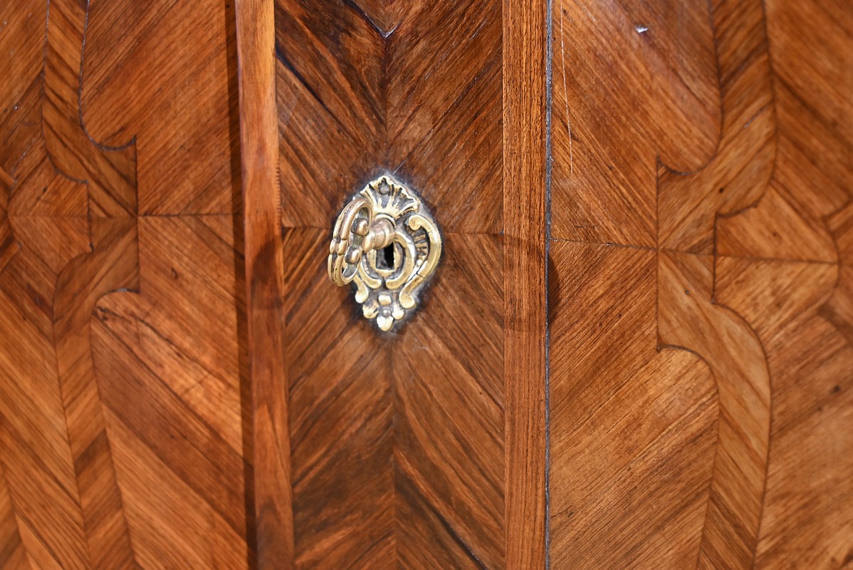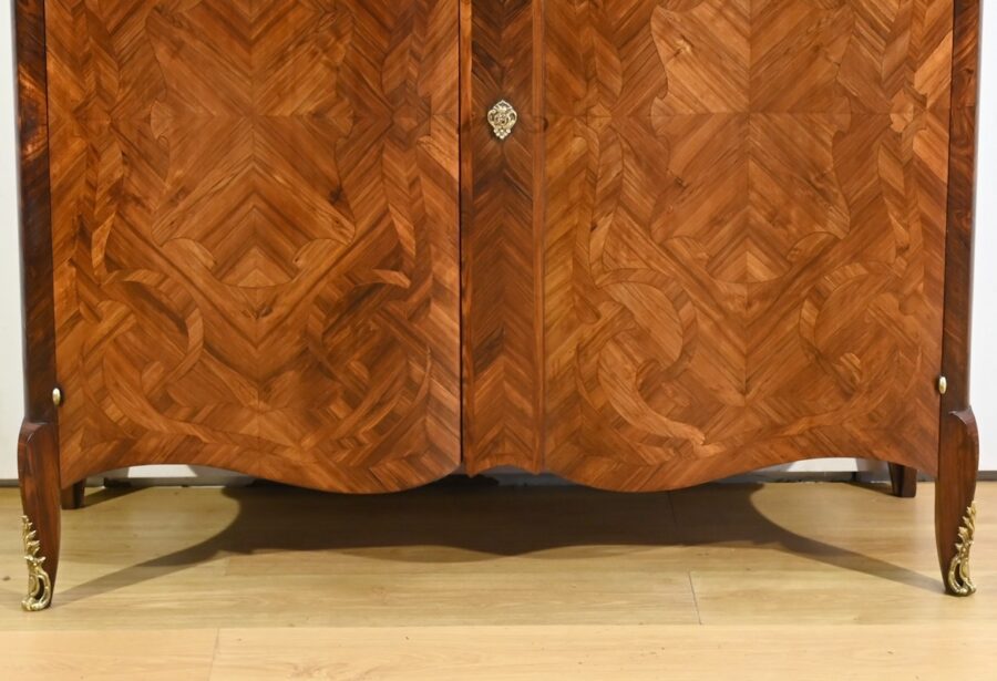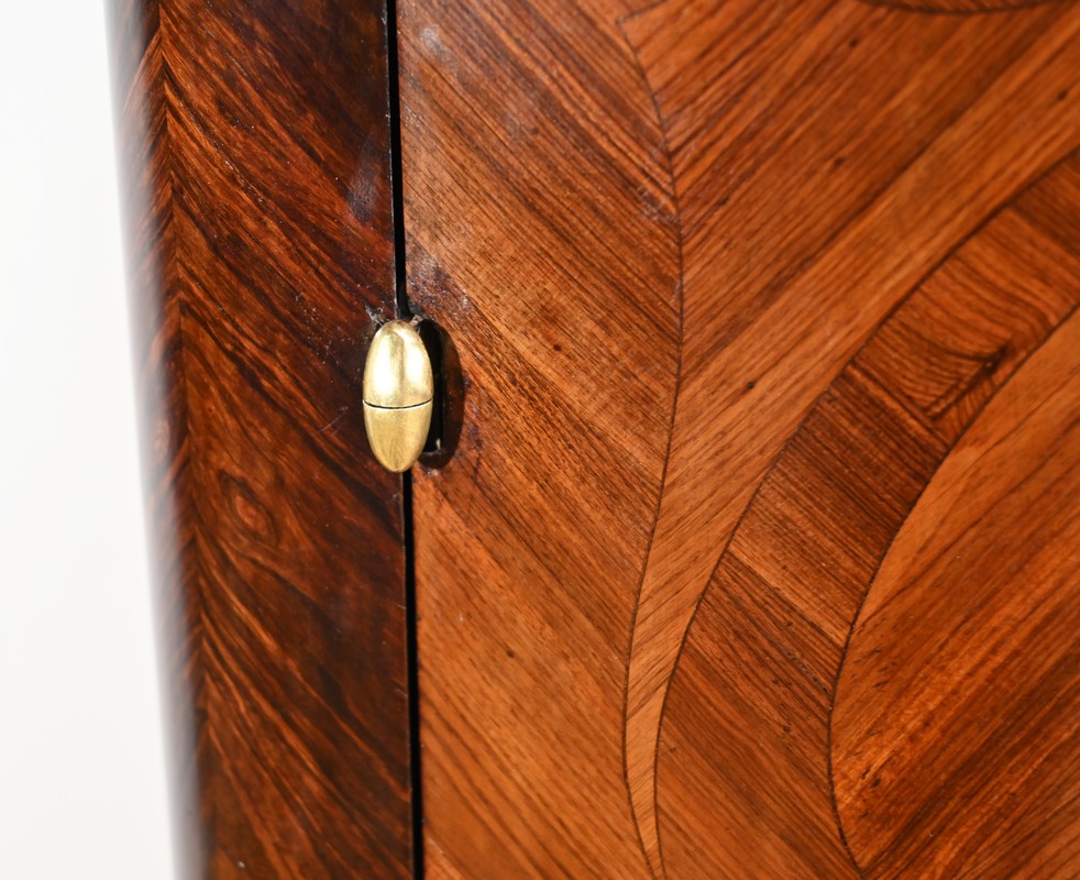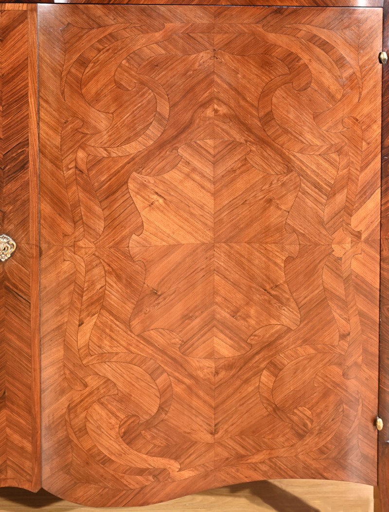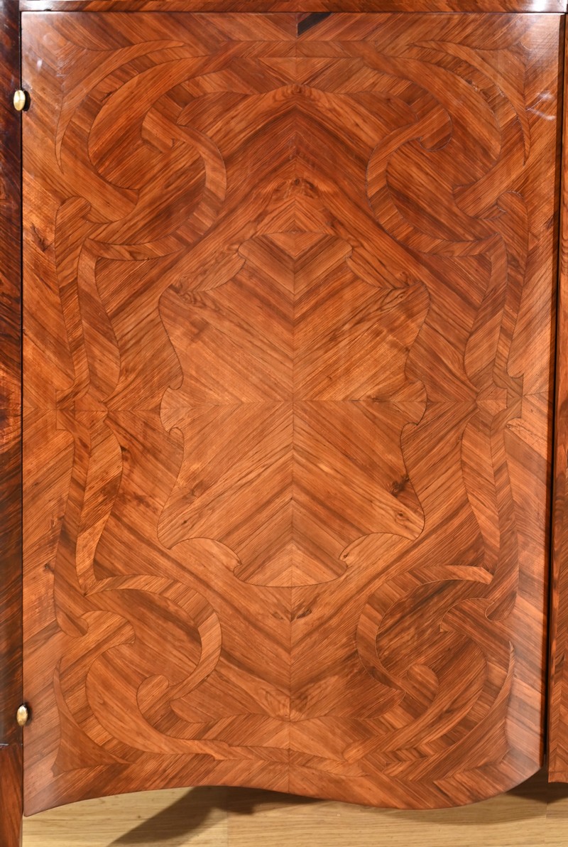 Ce meuble ouvre par deux portes, chacune est mouvementée, en placage de bois de rose et palissandre disposé en quatre-feuilles, incrustée de motifs marquetées.