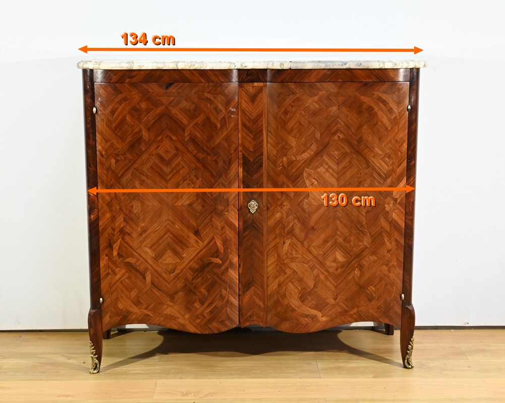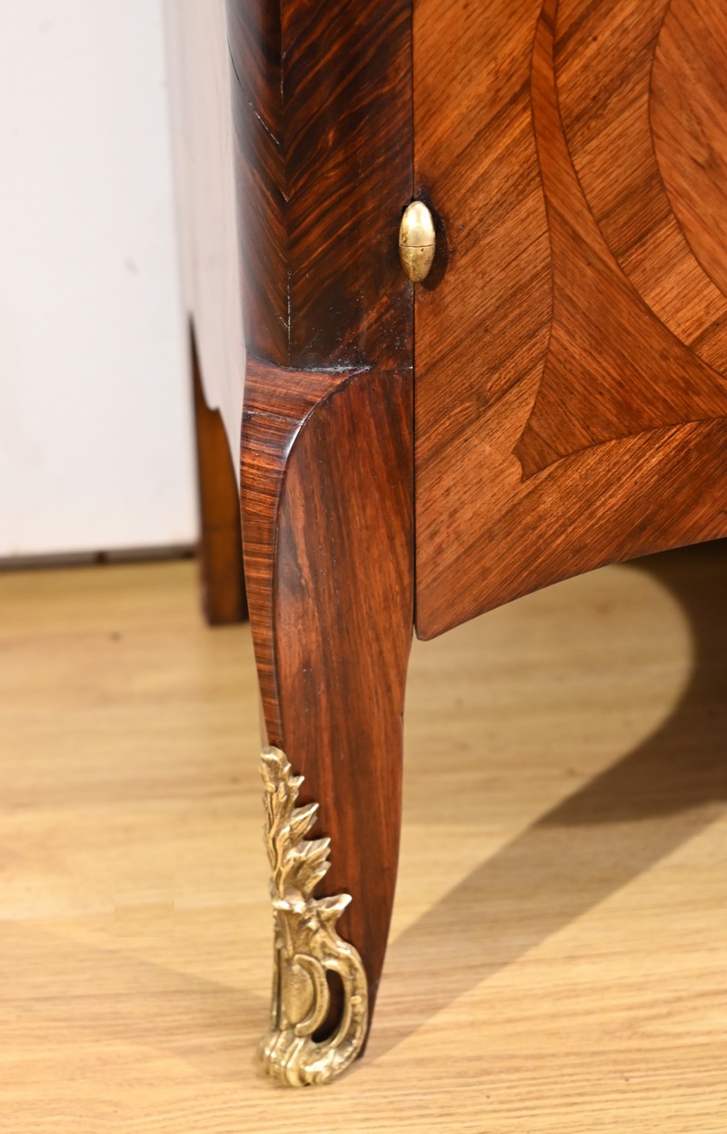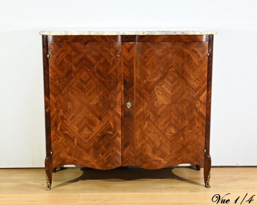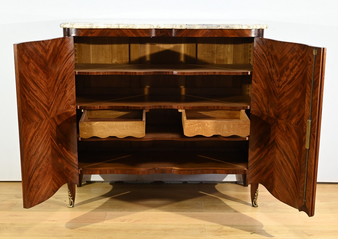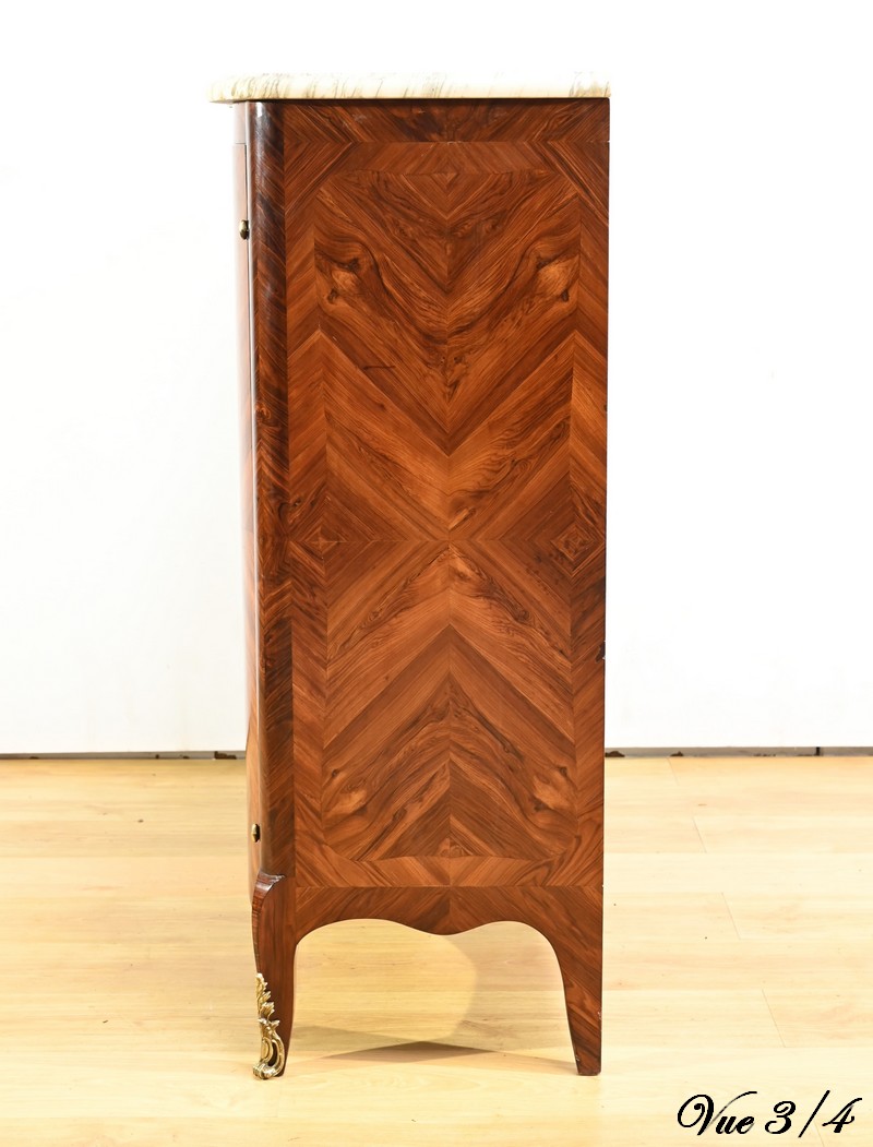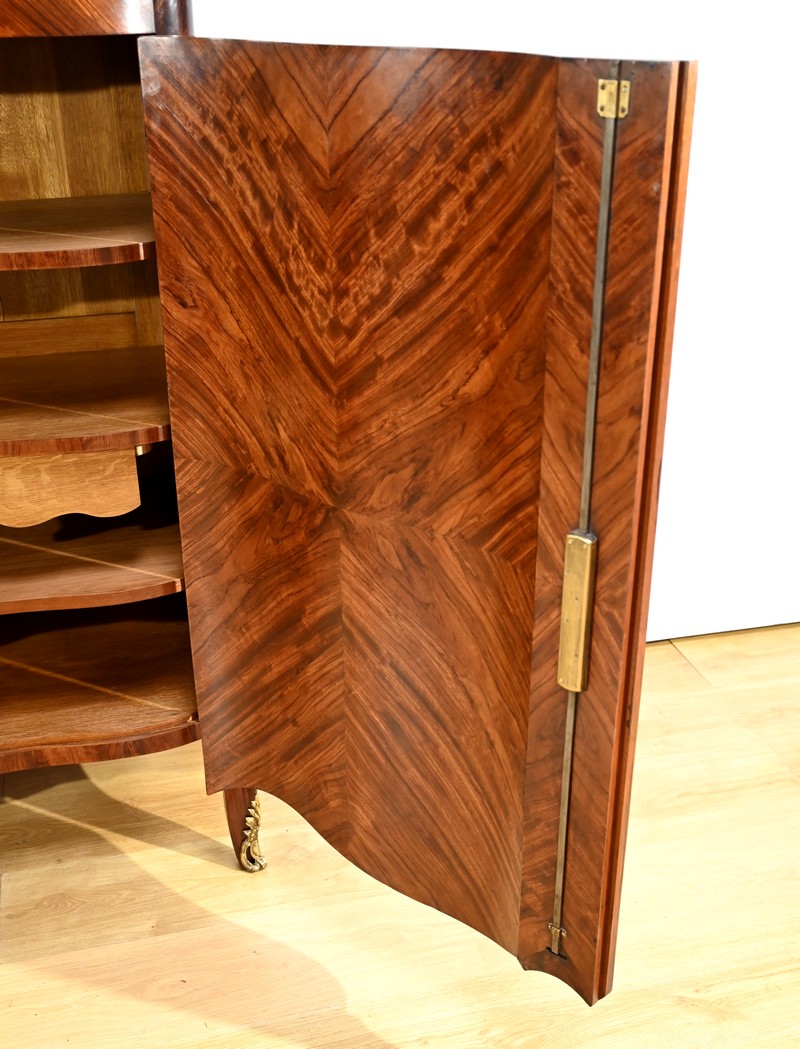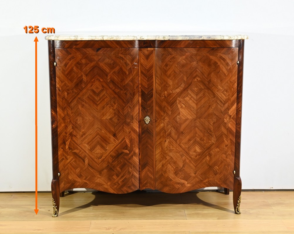 Ce meuble ouvre par deux portes, chacune est mouvementée, en placage de bois de rose et palissandre disposé en quatre-feuilles, incrustée de motifs marquetées.