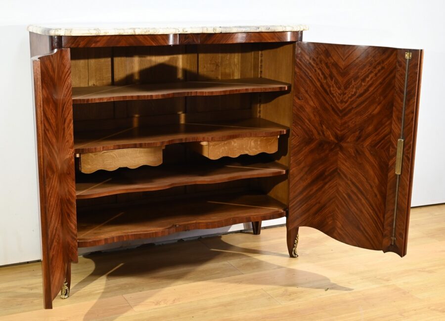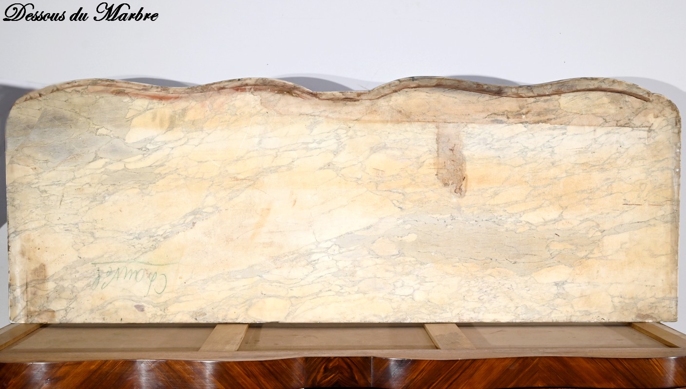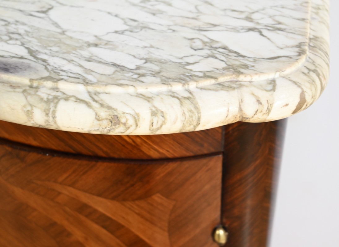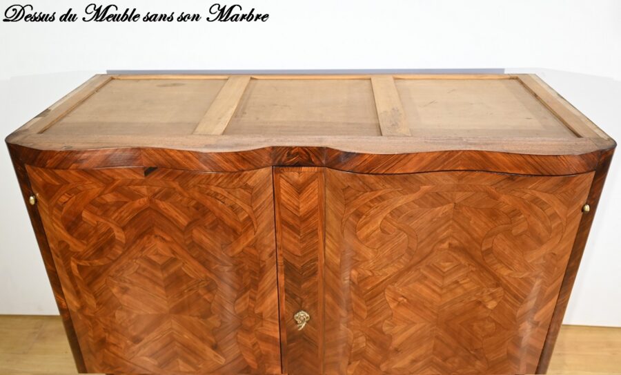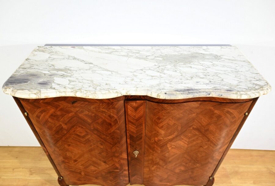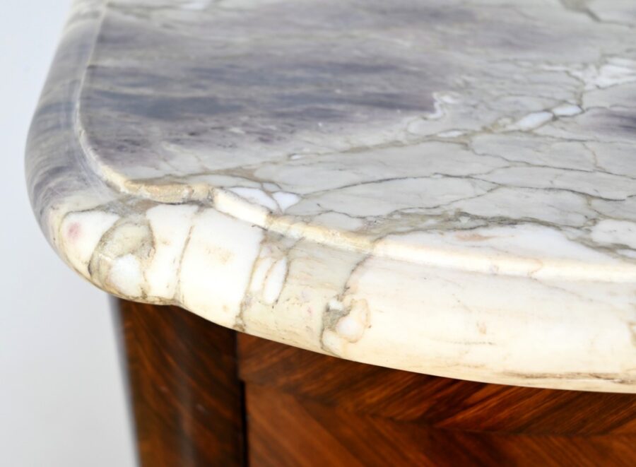Ce meuble est sommé d’un marbre blanc et légèrement violet aux veines grises, d’une épaisseur de 3 cm, avec bec-de-corbin.