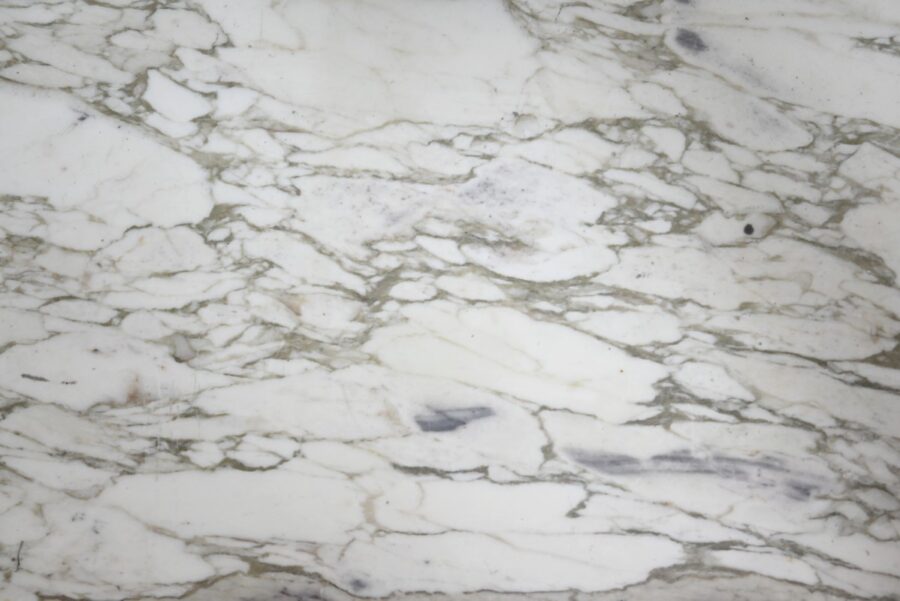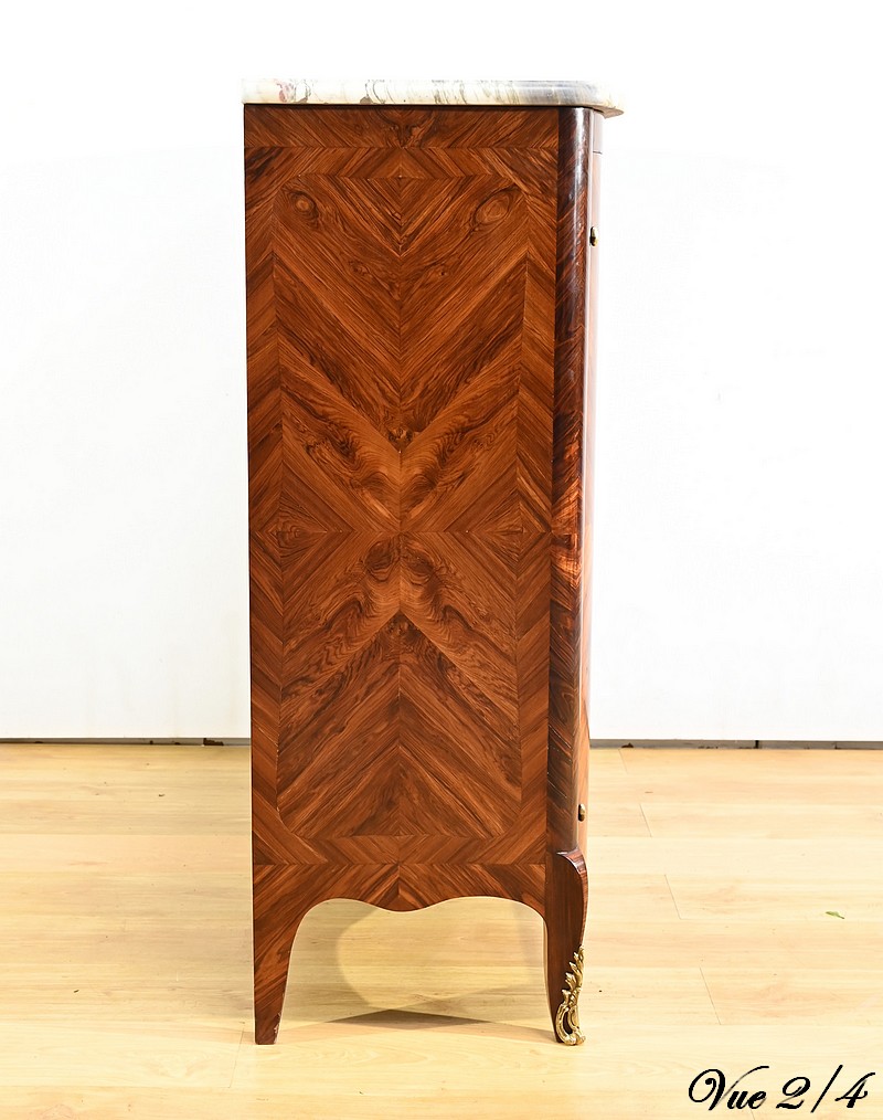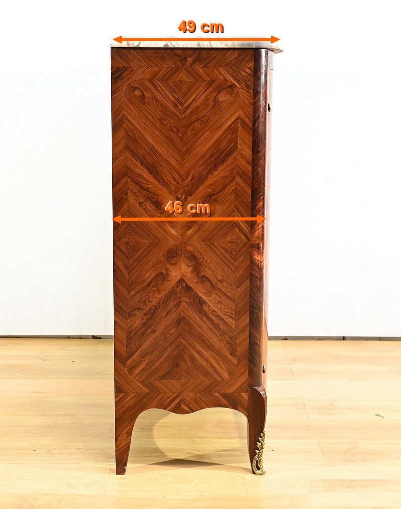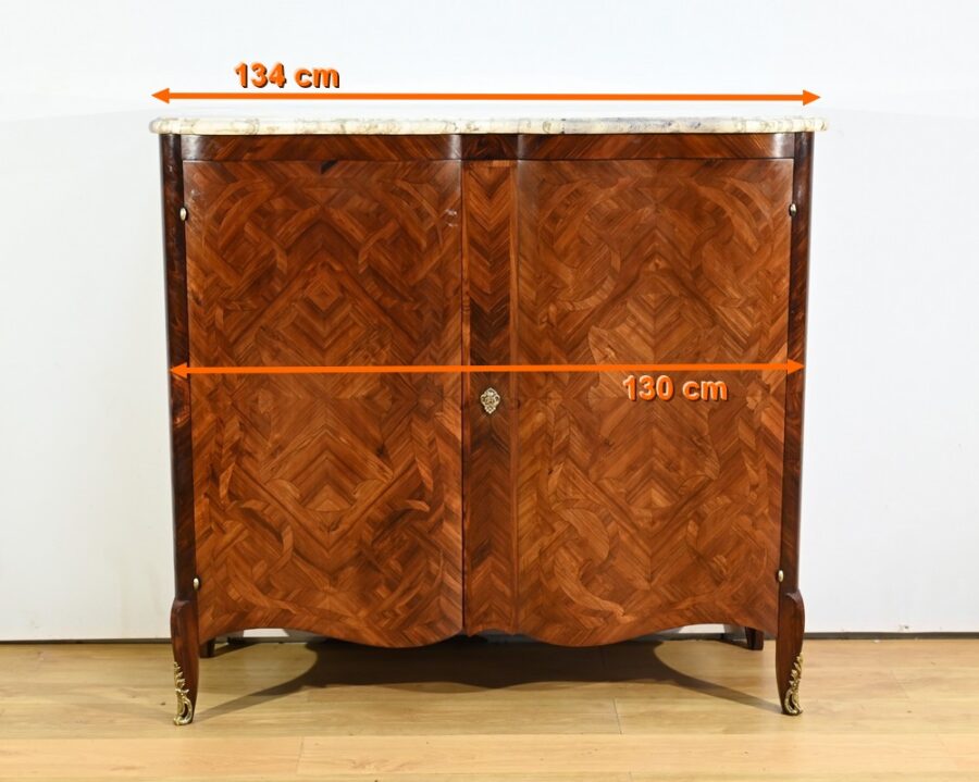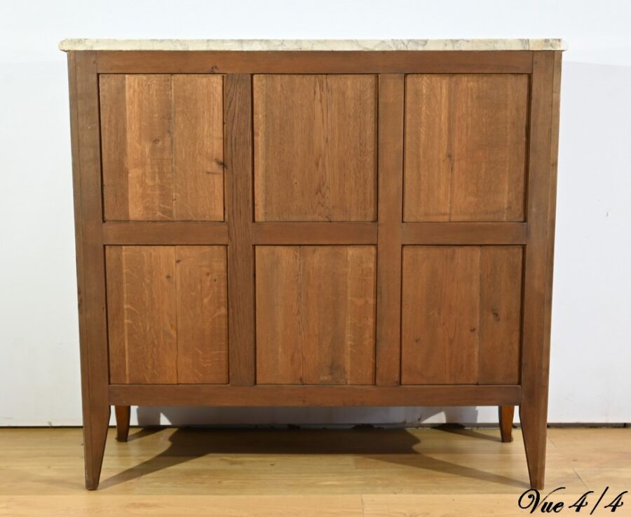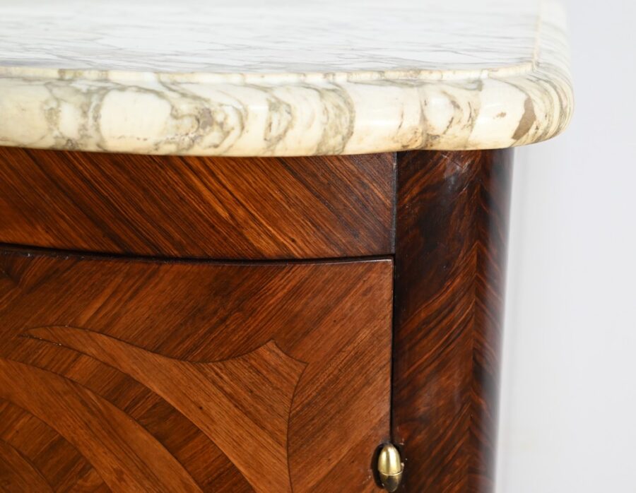 Ce meuble est sommé d’un marbre blanc et légèrement violet aux veines grises, d’une épaisseur de 3 cm, avec bec-de-corbin.