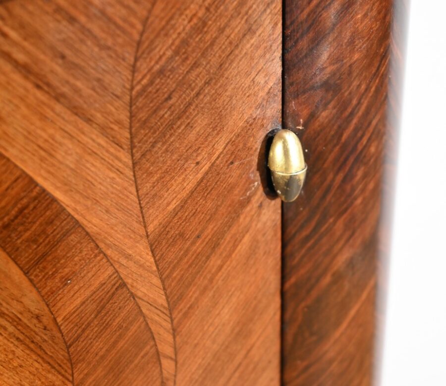 Au centre, le pilastre en quatre-feuilles, placage disposé en développé, comporte une serrure fonctionnelle, avec entrée et clé d’origine.
