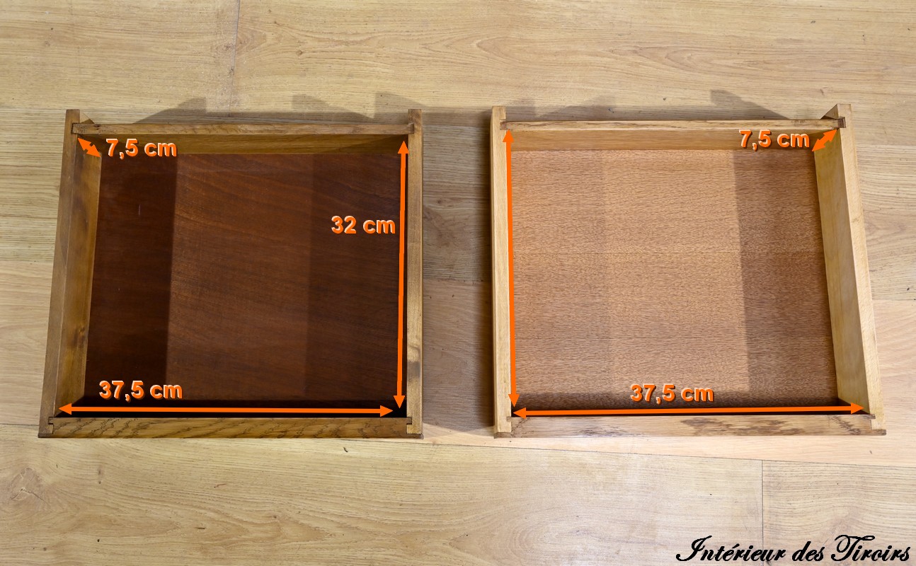L’intérieur propose trois étagères en chêne, montées sur crémaillères, avec chants découpés et plaqués à la verticale, agrémentées de deux tiroirs.