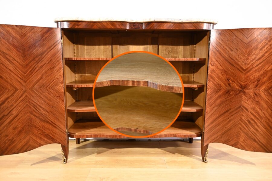 Le revers des portes est en placage d’acajou, là encore disposé en quatre-feuilles.