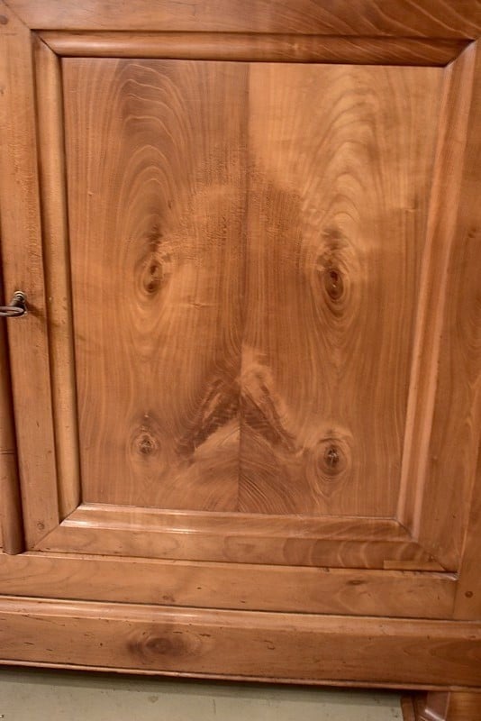 Buffet d’appui en merisier blond ouvrant à 2 portes – dont les panneaux centraux sont en placage pour mettre en valeur les nœuds du bois – et 2 tiroirs fermant à clé. Entrées de serrures filets en laiton très sobres.