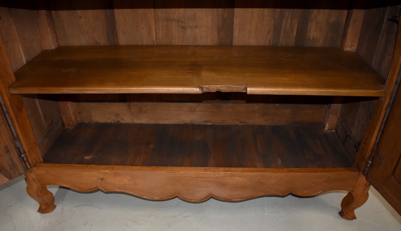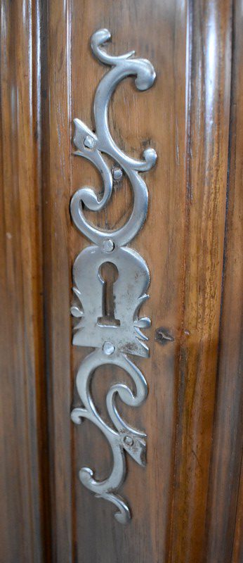 Ce Meuble est ouvrant en façade par deux portes indépendantes, Joliment travaillées en Moulures à Défoncement et Panneaux à plate-bande. Chacune est équipée d’un Gond et d’une Entrée ouvragée en Fer. Celle de Gauche est factice, tandis que celle de Droite est accompagnée de sa Clé et de sa Serrure d’Origine.