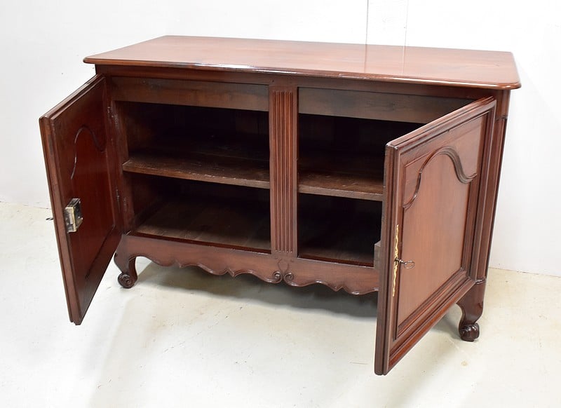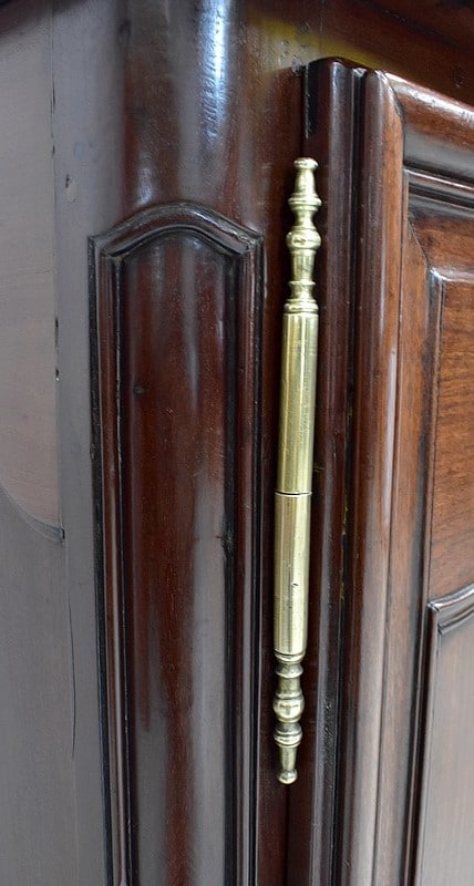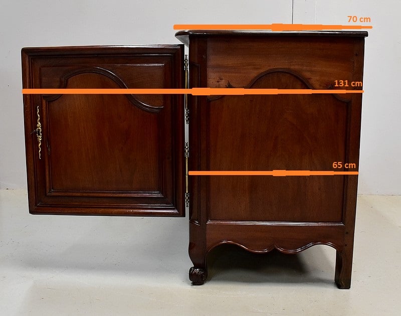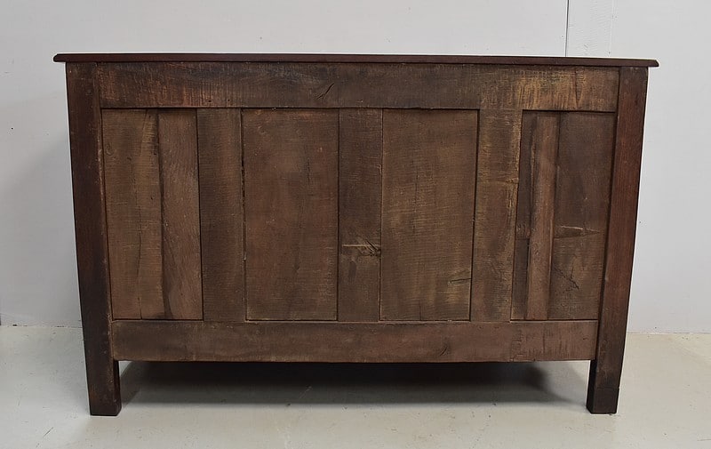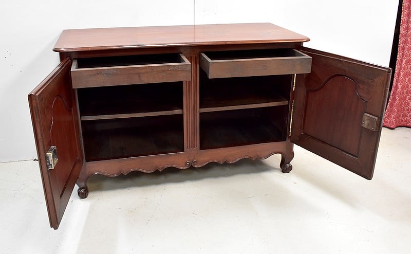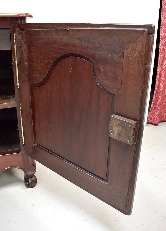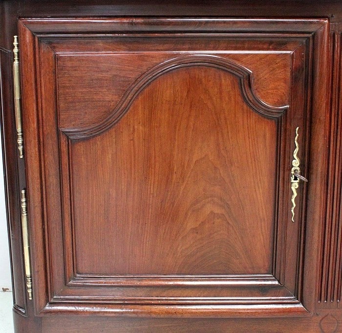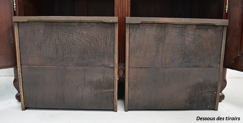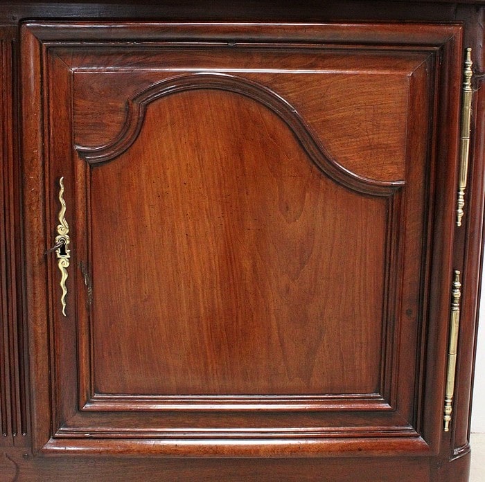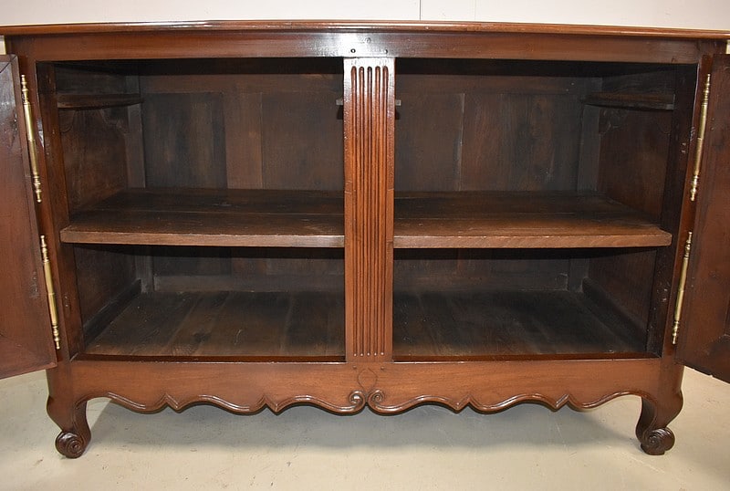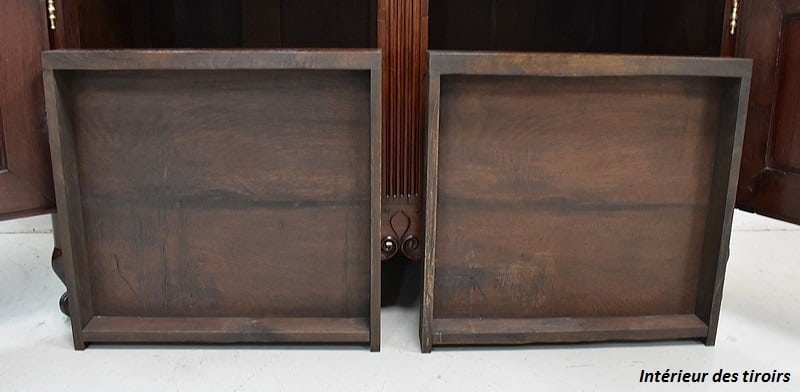 Ce meuble ouvre par deux portes indépendantes, aux façades à Défoncement et encadrements moulurés. Elles sont séparées par un pilastre central fixe, à cannelures verticales. Chacun de ces vantaux est maintenu par des fiches en Bronze, est doté d’une entrée de serrure du même alliage et d’un verrou en état de fonctionnement. Le meuble est fourni avec ses deux clés. Le tout est d’origine. Ces deux portes dévoilent un même espace de rangement, compartimenté par la présence d’une étagère de 60 cm de profondeur posée sur tasseaux fixes. L’intérieur de ce Buffet propose également en partie haute deux tiroirs assemblés à larges Queues d’Arondes.