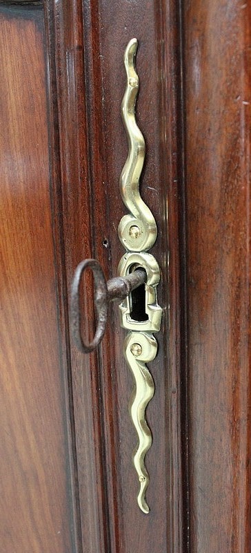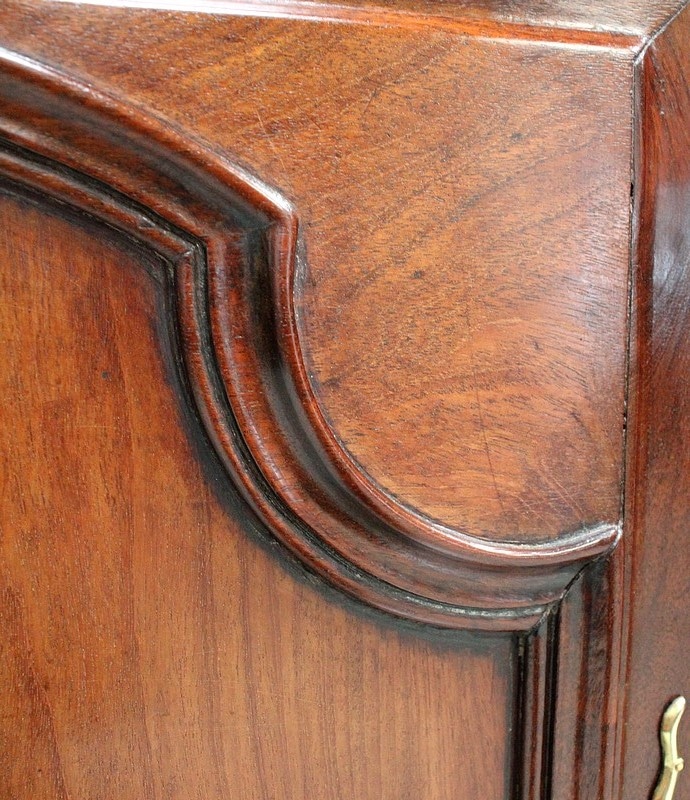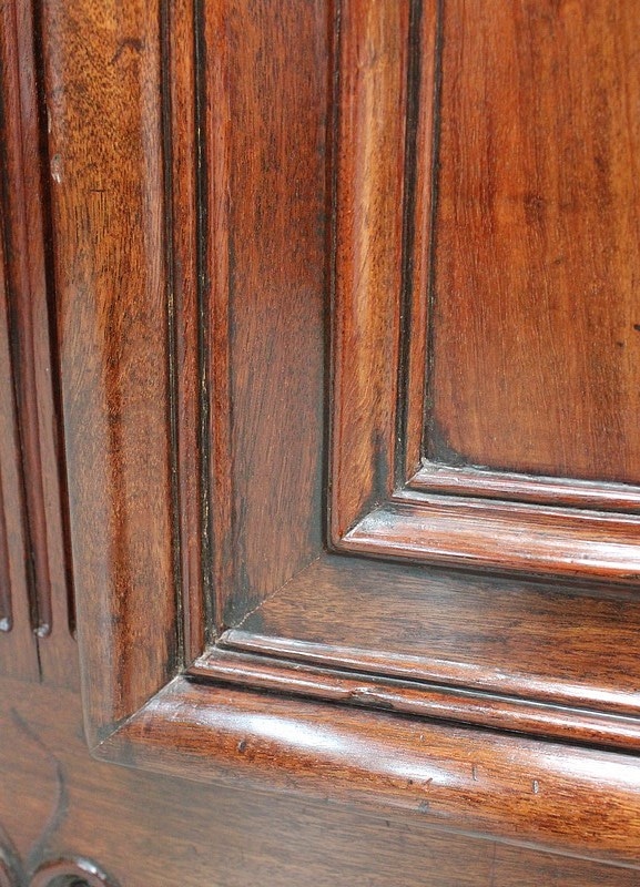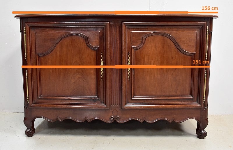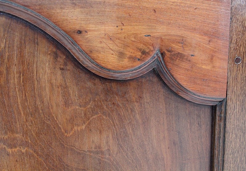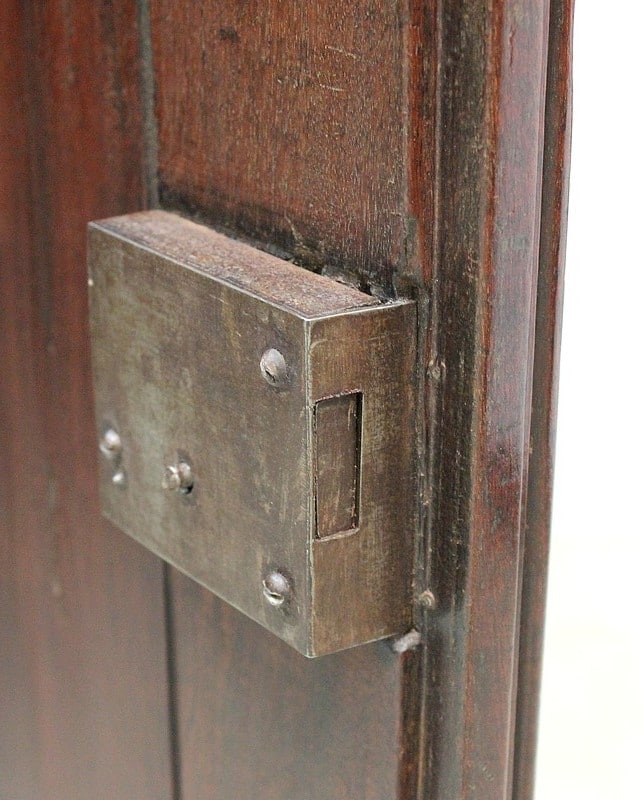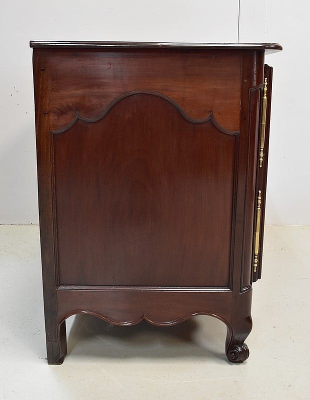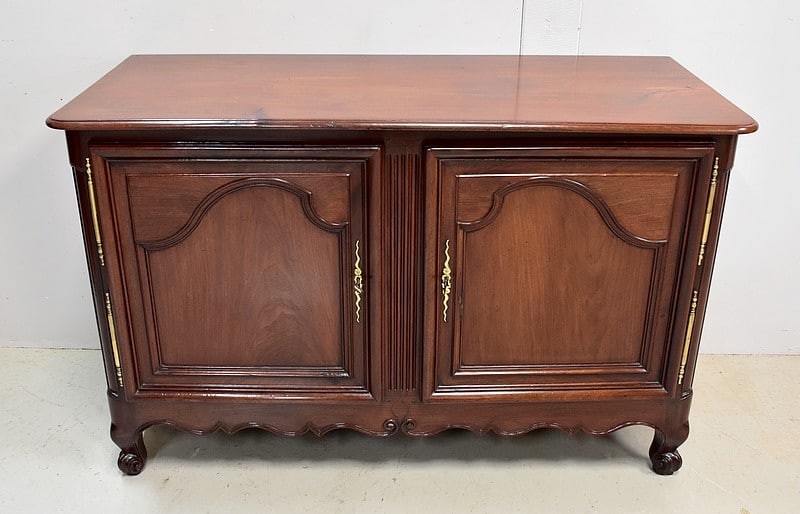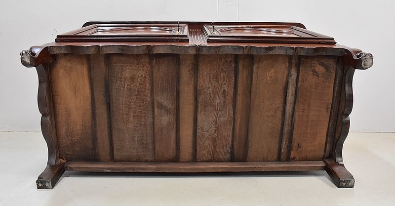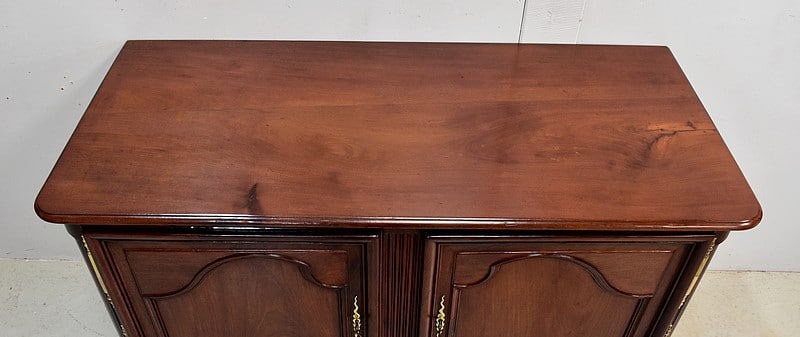 Ce meuble ouvre par deux portes indépendantes, aux façades à Défoncement et encadrements moulurés. Elles sont séparées par un pilastre central fixe, à cannelures verticales. Chacun de ces vantaux est maintenu par des fiches en Bronze, est doté d’une entrée de serrure du même alliage et d’un verrou en état de fonctionnement. Le meuble est fourni avec ses deux clés. Le tout est d’origine. Ces deux portes dévoilent un même espace de rangement, compartimenté par la présence d’une étagère de 60 cm de profondeur posée sur tasseaux fixes. L’intérieur de ce Buffet propose également en partie haute deux tiroirs assemblés à larges Queues d’Arondes.