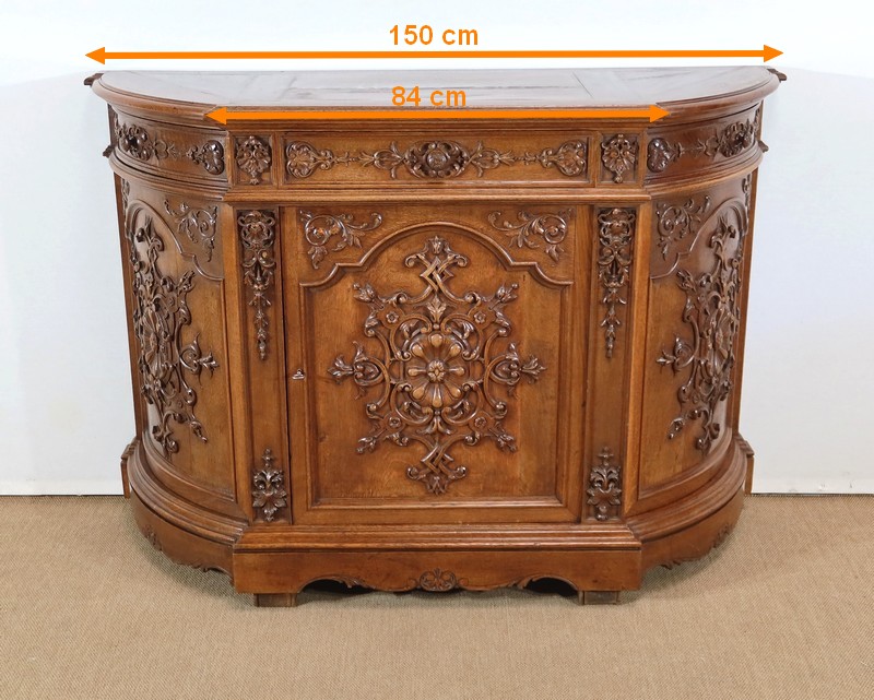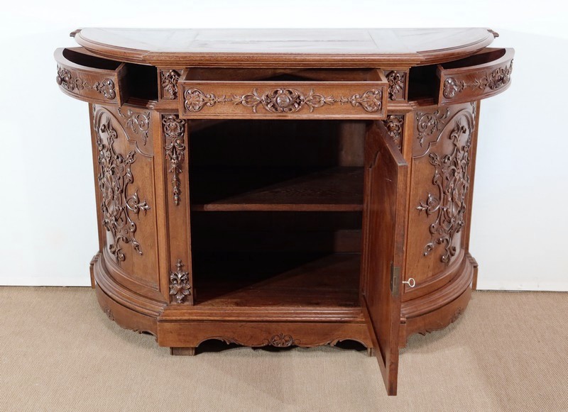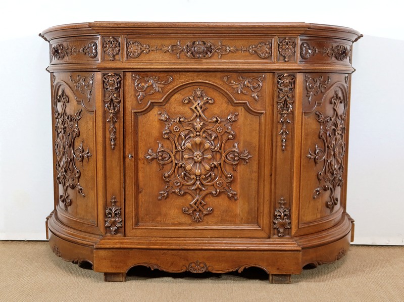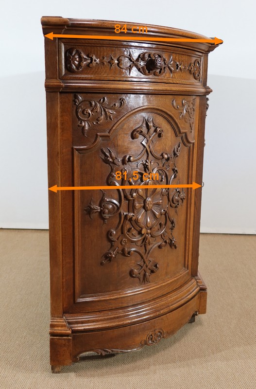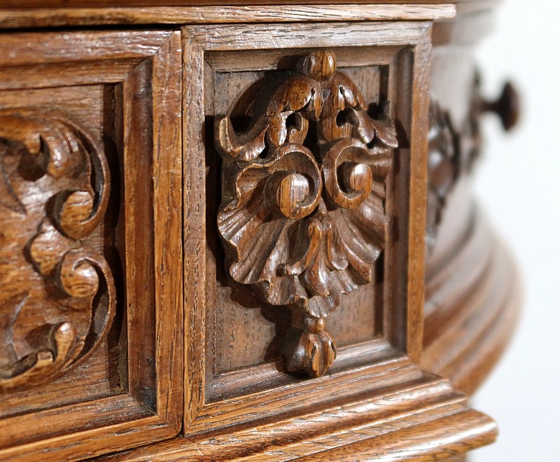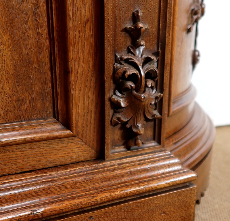 Cette façade, ainsi que les côtés arrondis de ce meuble, présentes d’importants décors sculptés. Les encadrements à défoncement sont moulurés façon chapeau de gendarme en partie haute, et garnis de motifs de rinceaux, de volutes et de fleurs dans les angles supérieurs.