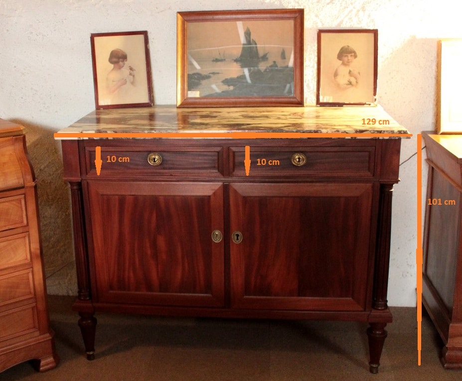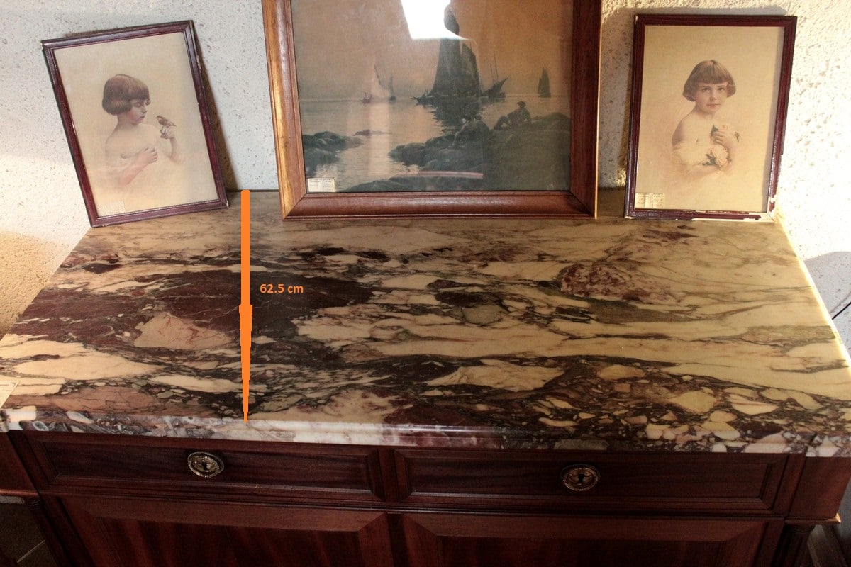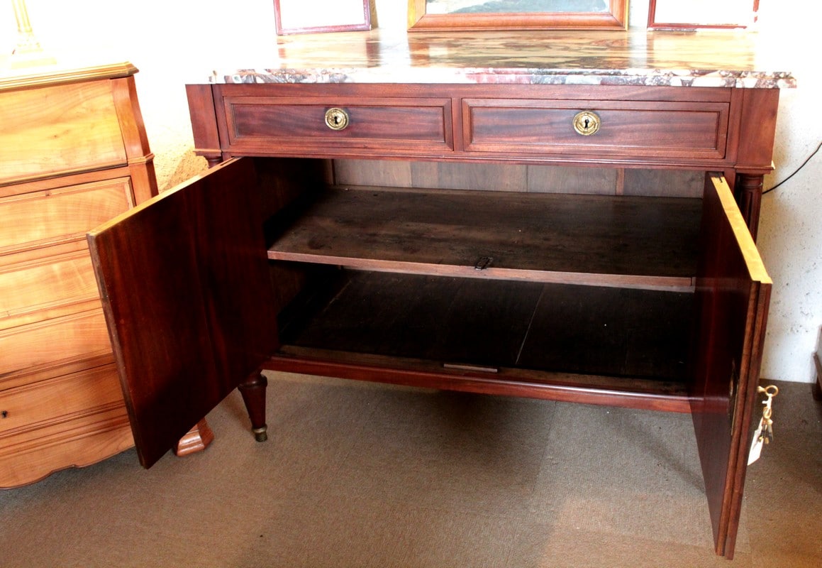 Buffet de style Louis XVI en acajou avec dessus de marbre veiné blanc/gris/bordeaux. Il ouvre par 2 tiroirs dans la ceinture et 2 portes. Les poignées et entrées de serrures sont en bronze. Il repose sur 4 pieds fuselés terminés par des sabots de bronze.