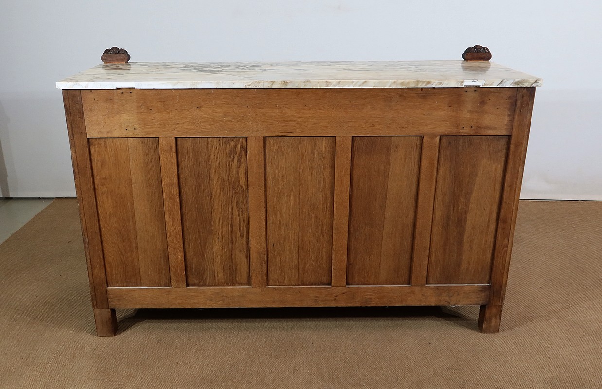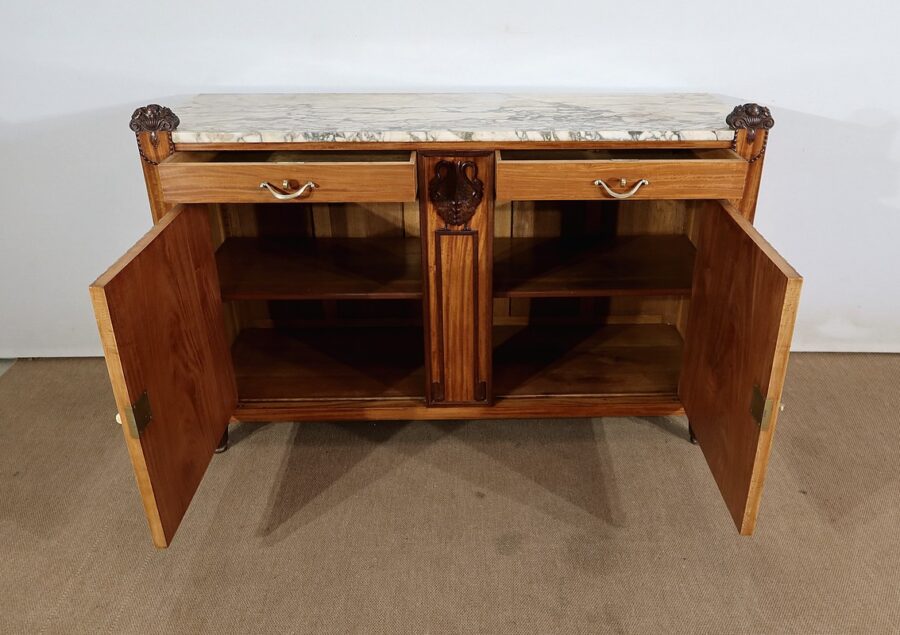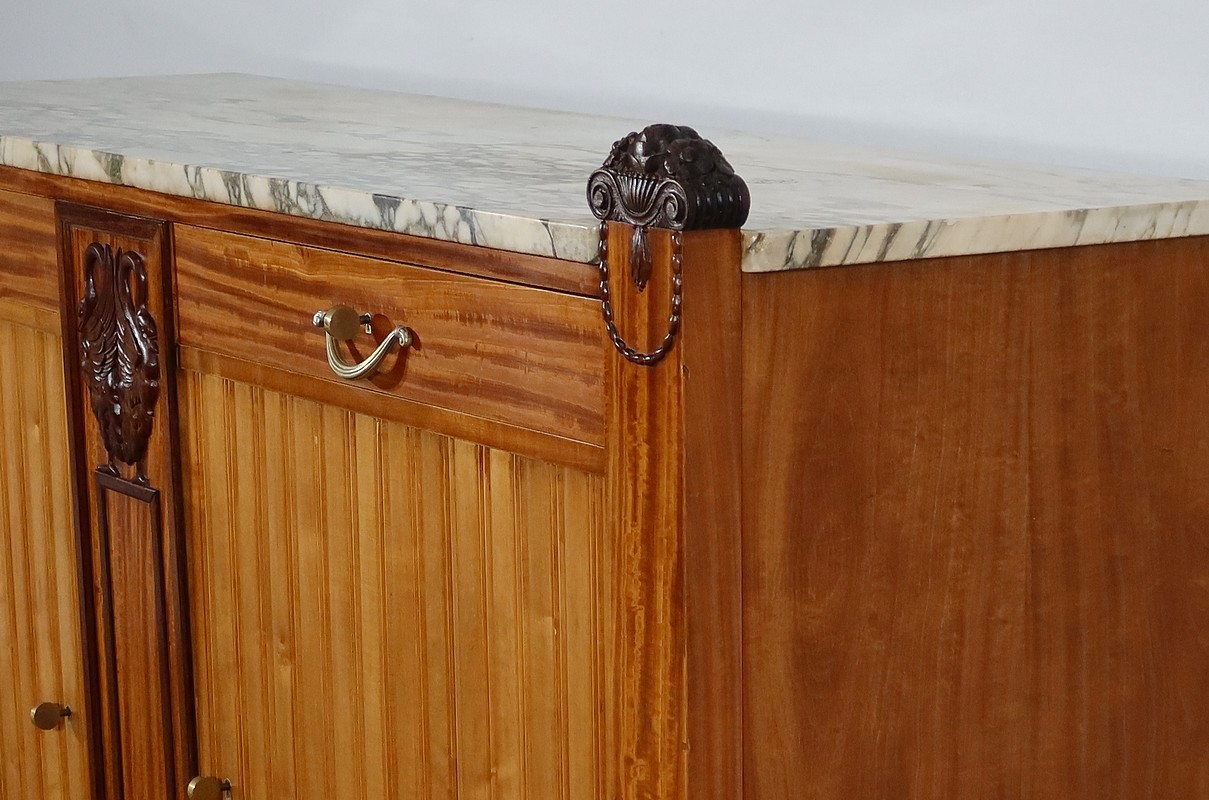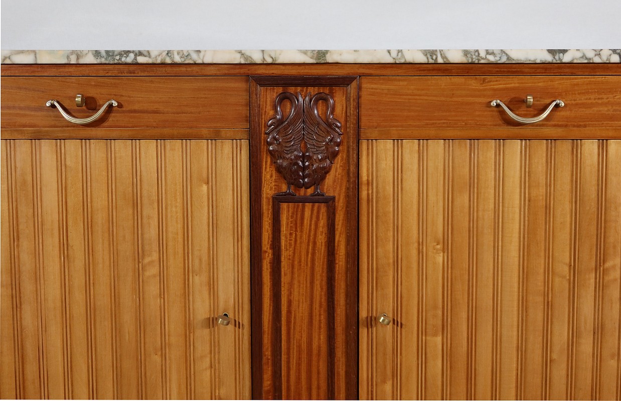 Rare meuble Art Déco de Fabrication Parisienne sommé d’un épais marbre aux tons nuancés et d’ornementations sculptées.