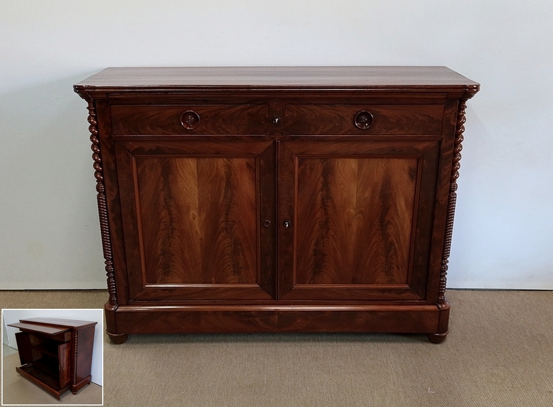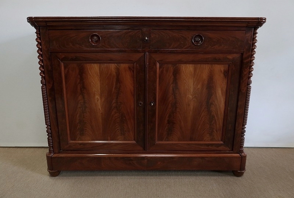 Buffet en Acajou conçu au début du XIXe siècle, composé d’un dessus de bois en placage de ronce d’acajou doté dans son pourtour d’une double moulure en demi-rond avec ressaut aux angles.