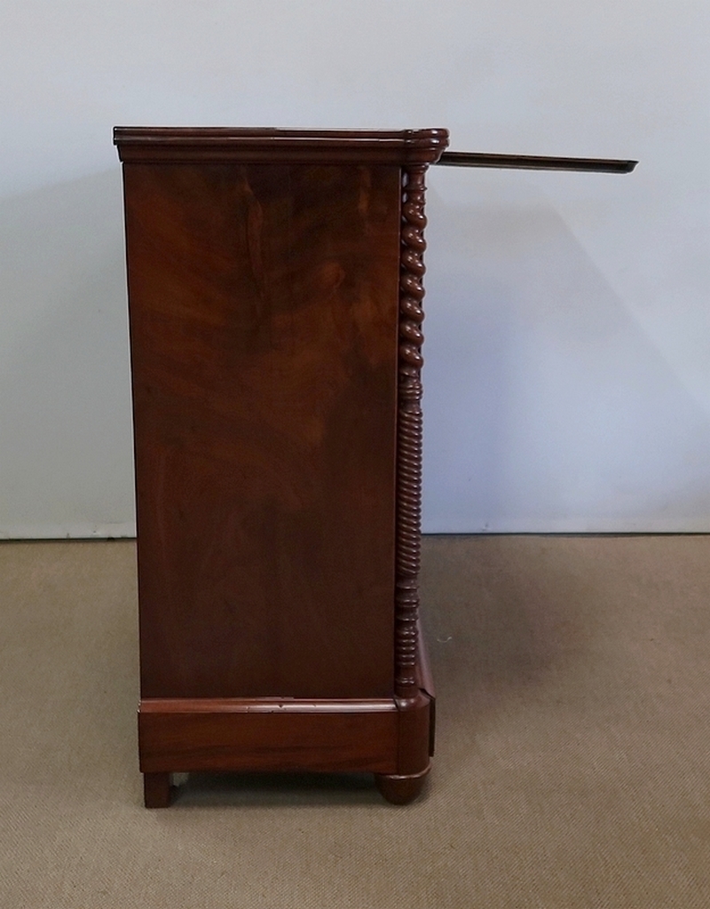 En dessous, dissimulée, nous avons une tablette en placage d’acajou de fil se tirant grâce à deux encoches avec butée.
