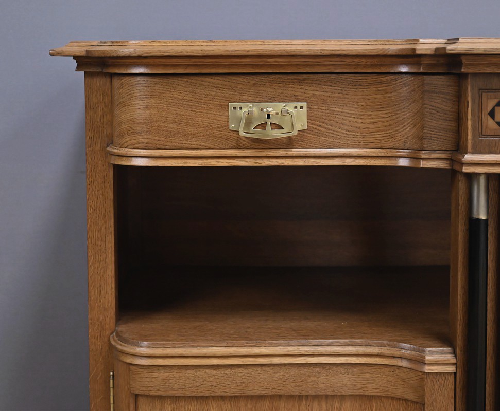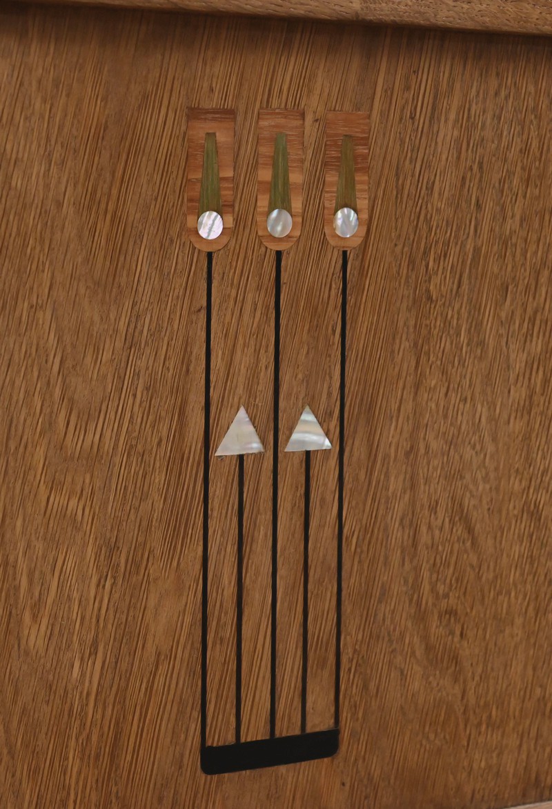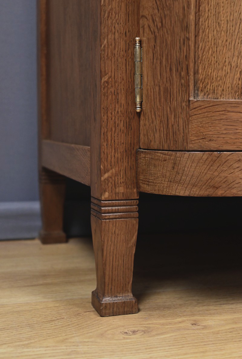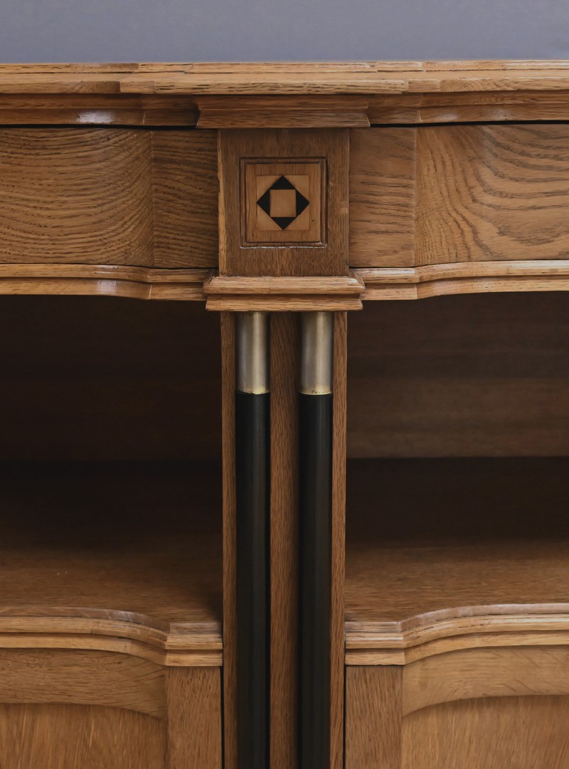 L’ensemble dégage une impression de sobriété sophistiquée, où la chaleur du chêne, la précision du placage et les accents métalliques s’équilibrent dans un esprit à la fois Art Déco et fidèle à l’influence de Serrurier‑Bovy. Un meuble qui allie élégance, structure et sens du détail.