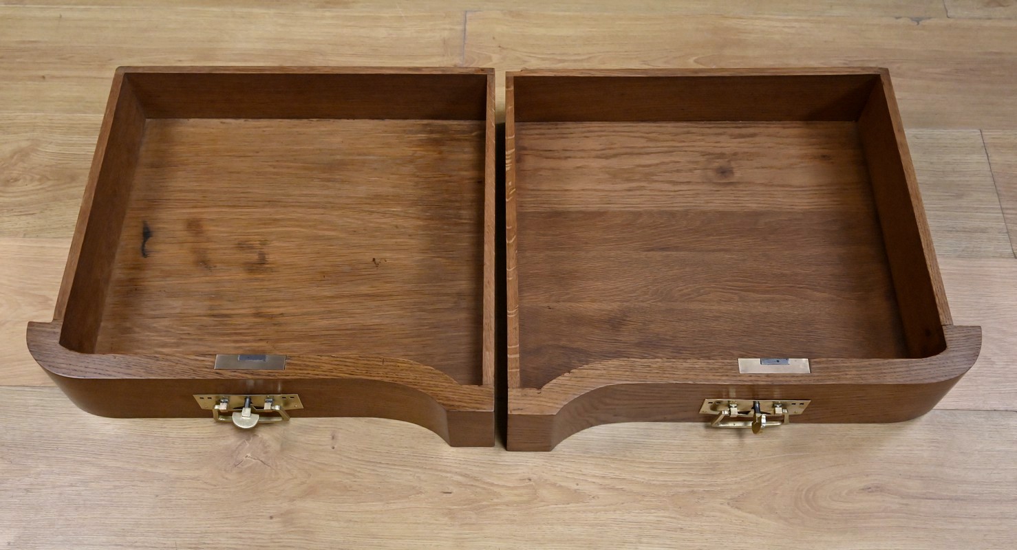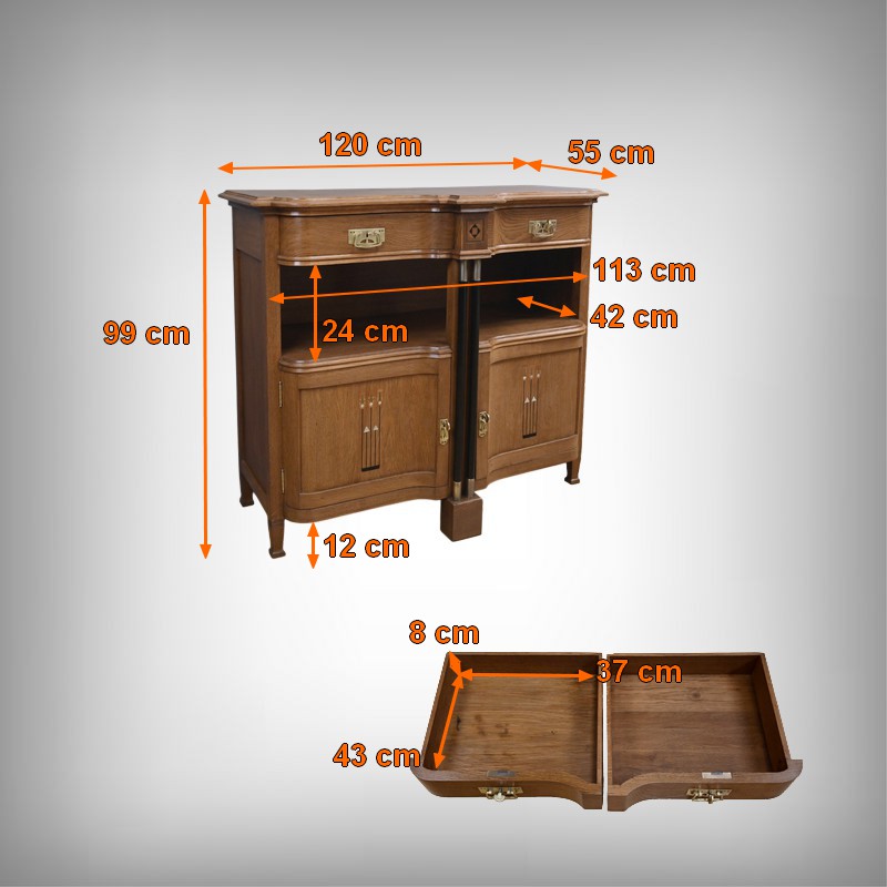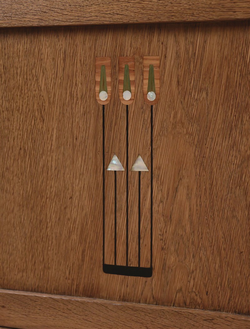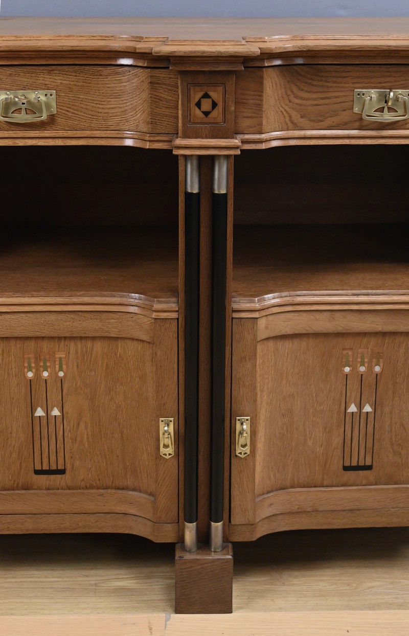L’ensemble dégage une impression de sobriété sophistiquée, où la chaleur du chêne, la précision du placage et les accents métalliques s’équilibrent dans un esprit à la fois Art Déco et fidèle à l’influence de Serrurier‑Bovy. Un meuble qui allie élégance, structure et sens du détail.