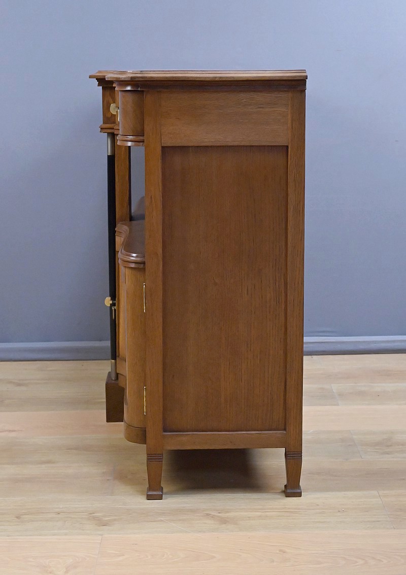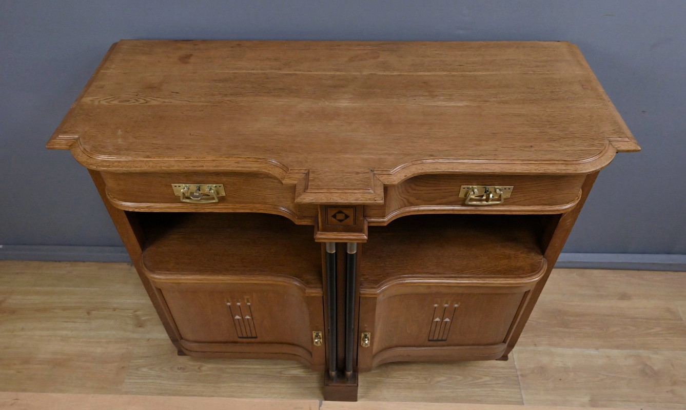 Rare desserte en chêne, inspirée des créations de Gustave Serrurier‑Bovy, conjuguant rigueur géométrique et raffinement décoratif. Sa silhouette se distingue par un ressaut central qui anime la façade et affirme son caractère architectural. Cette avancée est formée notamment de deux colonnettes en bois noirci, chacune ponctuée de bagues en laiton en partie haute et basse — un détail emblématique de l’esthétique de Serrurier‑Bovy, où le dialogue entre bois et métal doré occupe une place essentielle.