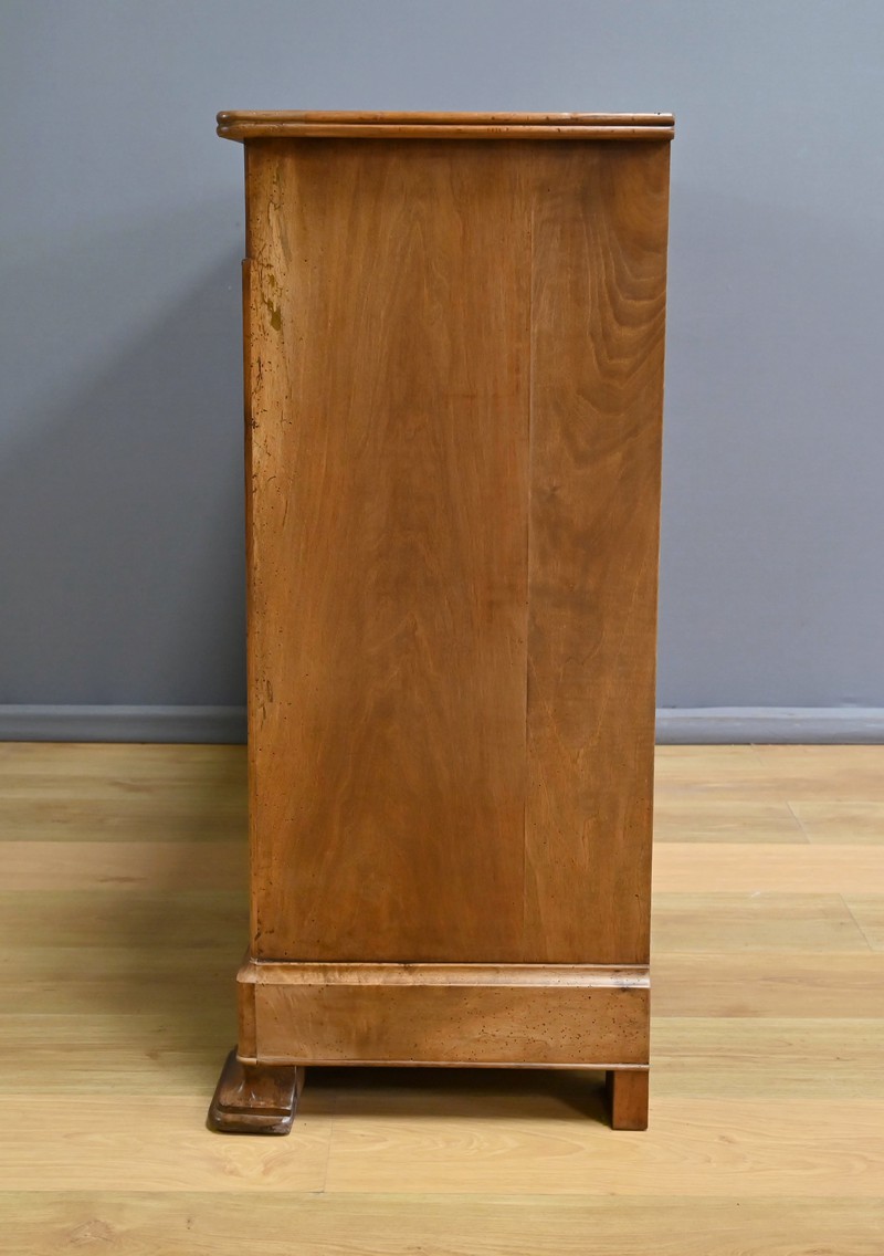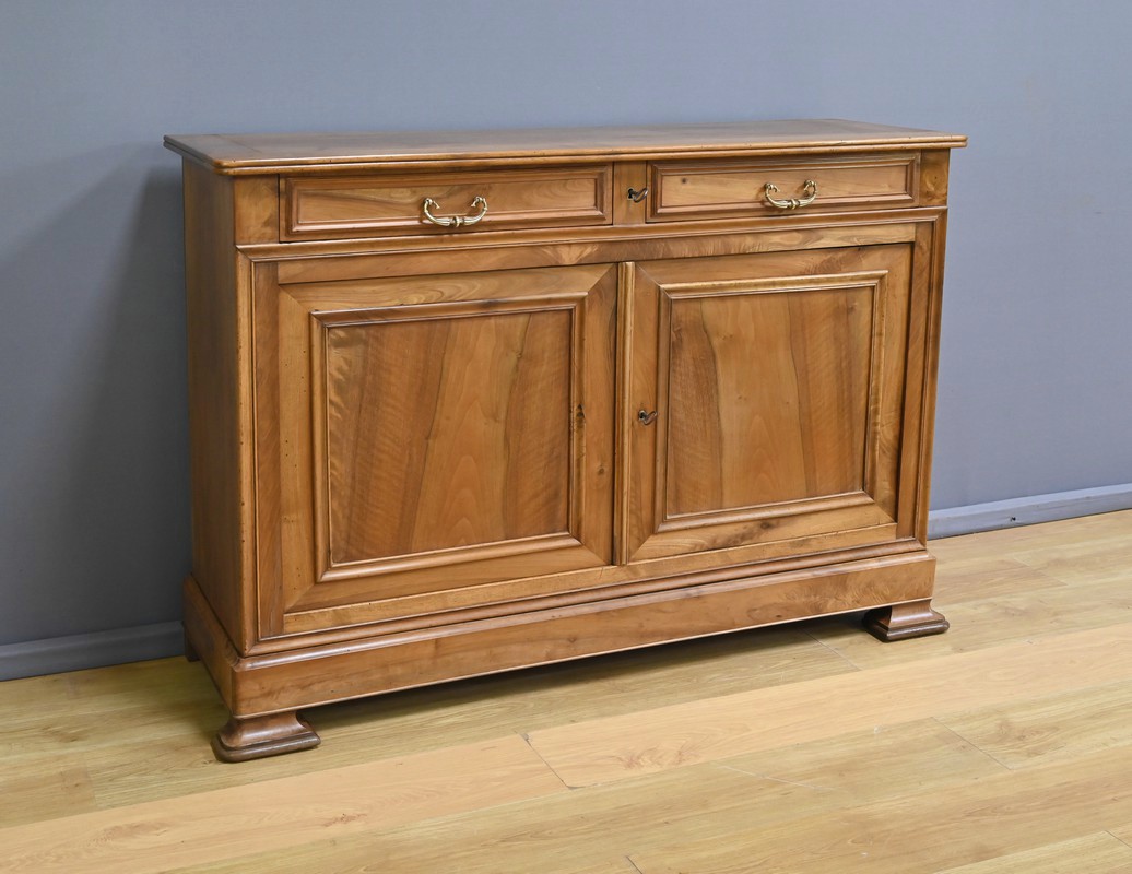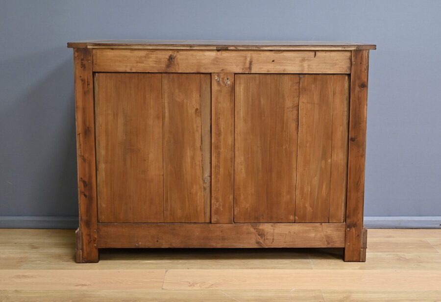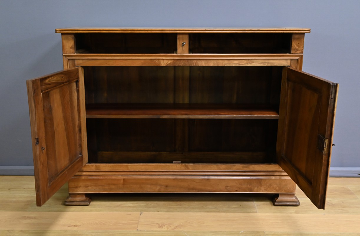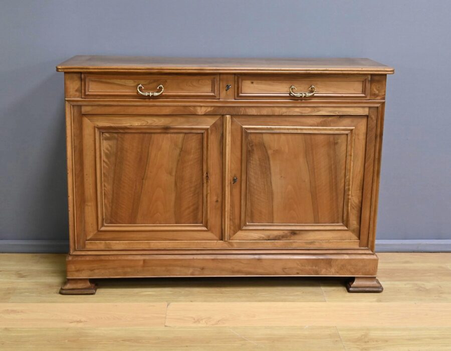 Buffet en noyer massif réalisé dans le style Louis-Philippe, se caractérisant par sa faible profondeur. Son plateau présente des angles antérieurs légèrement arrondis qui adoucissent sa silhouette. Il est doté de deux tiroirs en ceinture, dont les façades sont moulurées et les poignées tombantes en bronze finement ciselé. Le système de serrure à double mécanisme est fonctionnel et accompagné de sa clé. Sous les tiroirs, deux portes encadrées de moulures s’ouvrent sur un espace de rangement doté d’une étagère. La porte de droite est équipée d’une serrure en état de fonctionnement, également fournie avec sa clé. Le bas du buffet est souligné par une plinthe à doucine, et l’ensemble repose sur des pieds sabots à l’avant et droits à l’arrière, apportant stabilité et raffinement.