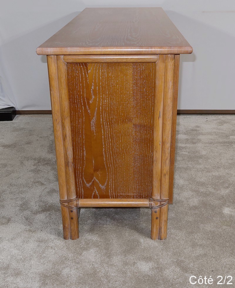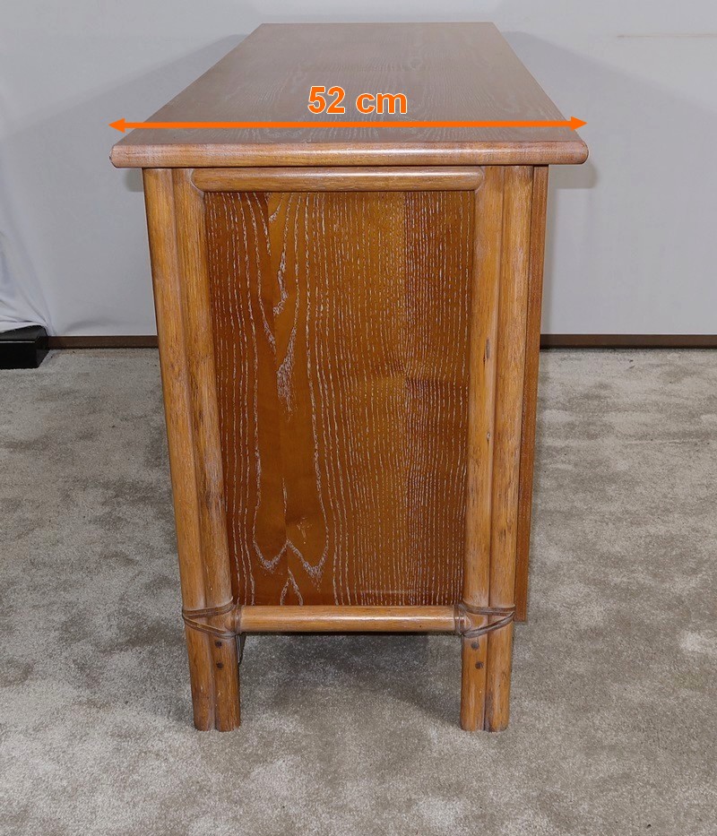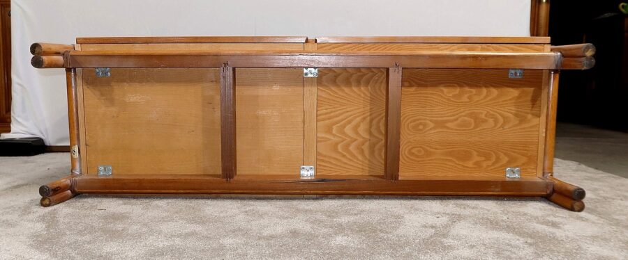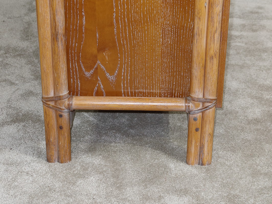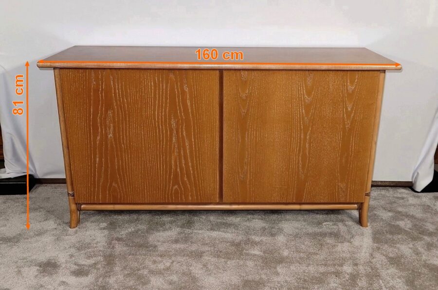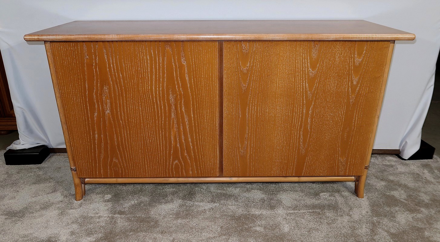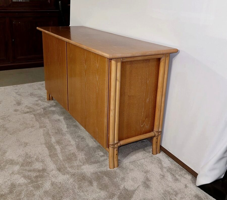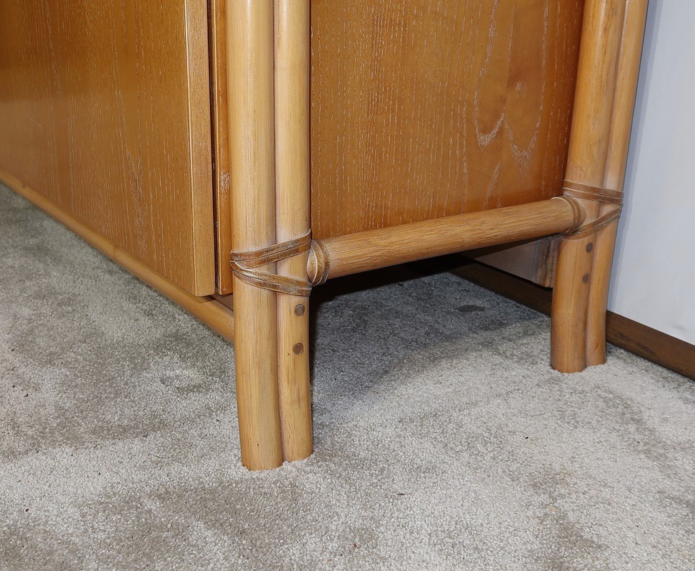 Outre sa couleur et son style, ce meuble a pour particularité d’avoir des pieds et une traverse basse sculptés en forme de bambous, formant un cadre original sur chaque côté.