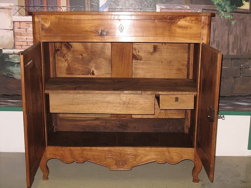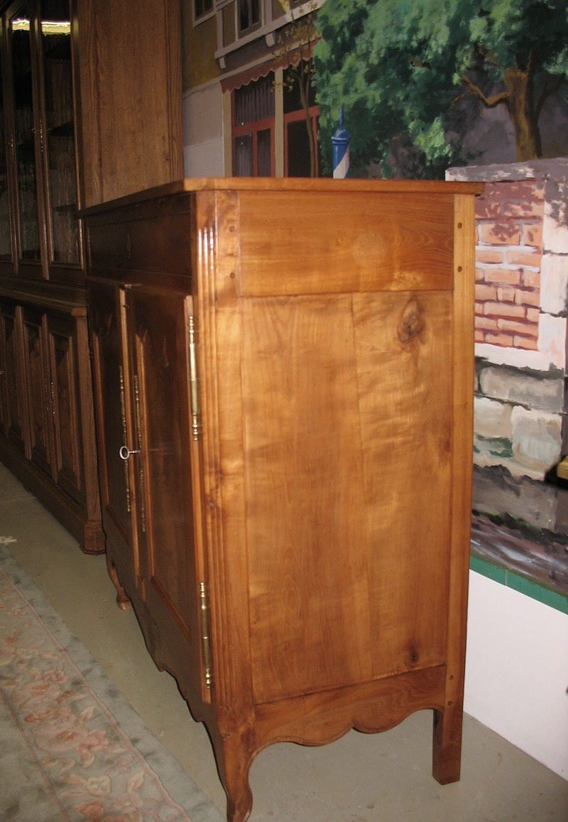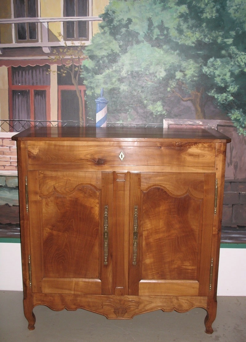 Buffet Louis XV à hauteur d’appui en merisier ouvrant par 2 portes. Un faux tiroir se dessine en partie haute tandis qu’une sculpture orne la traverse basse.