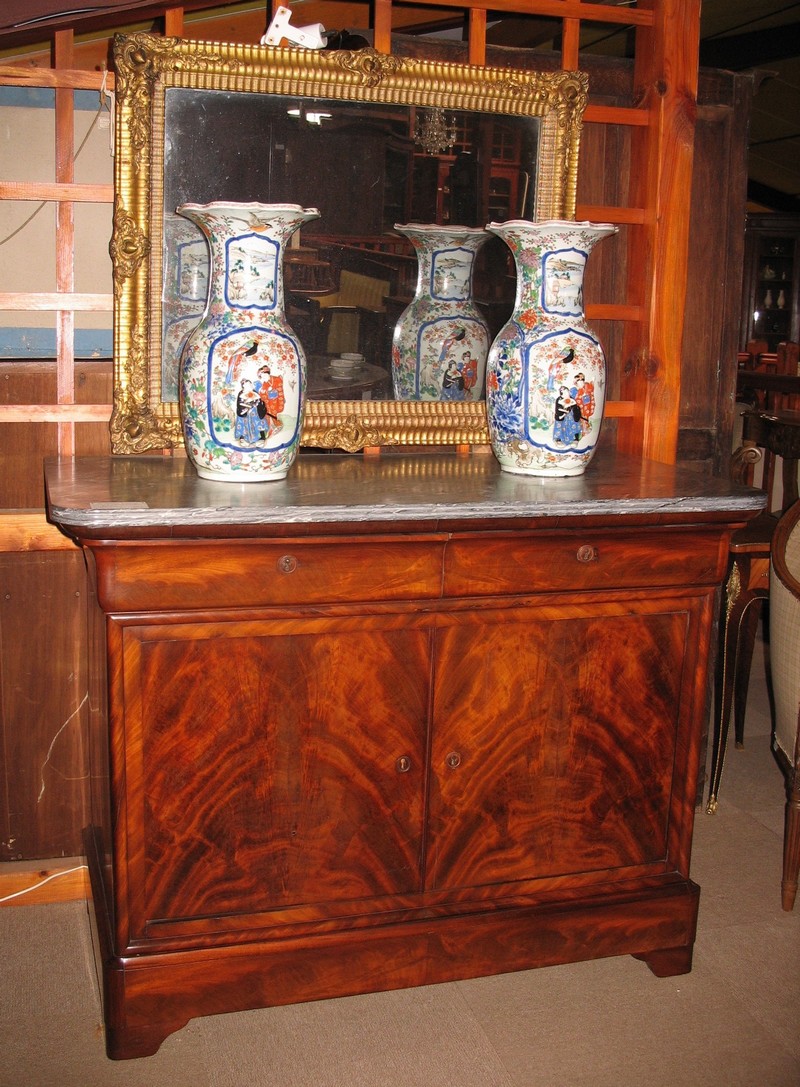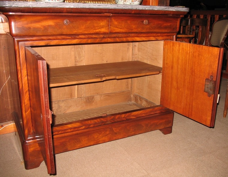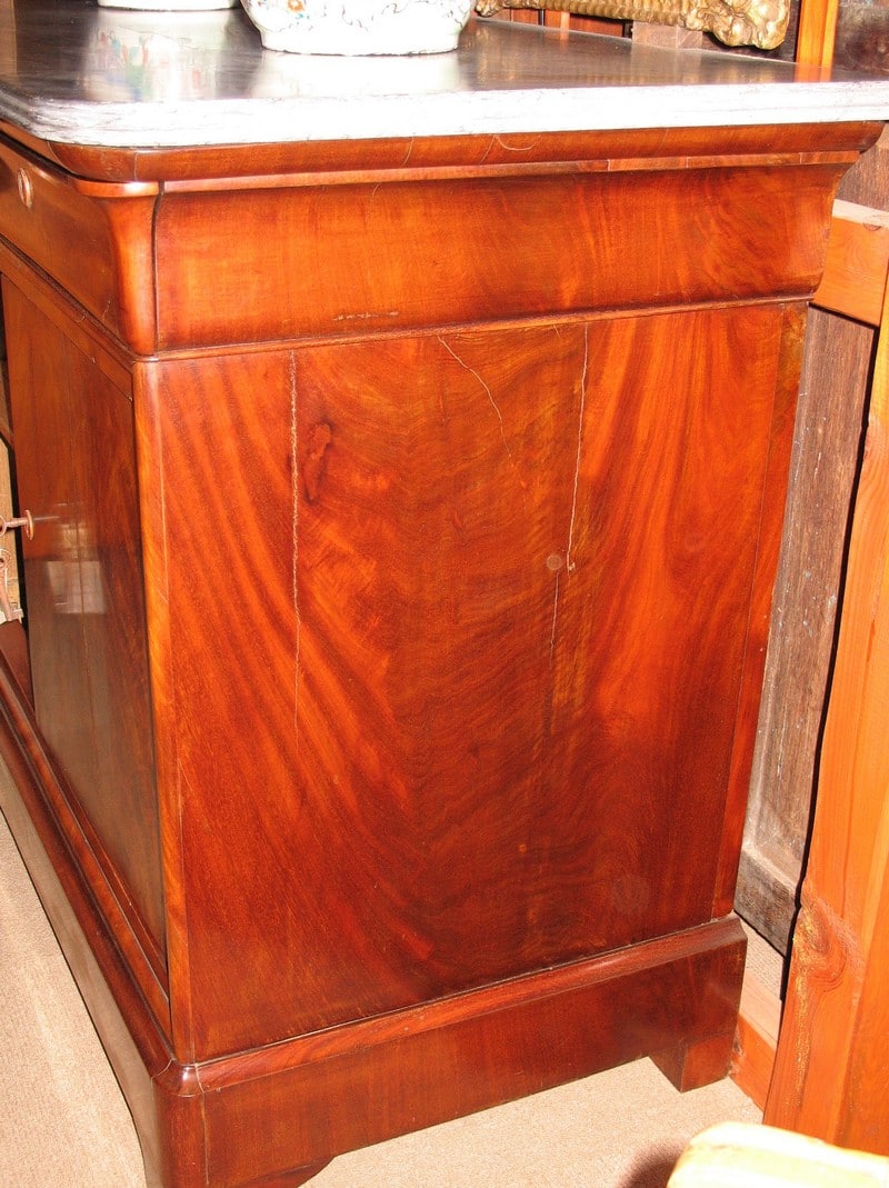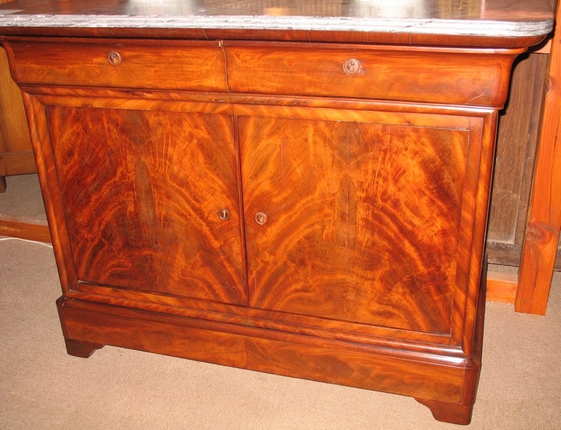 Buffet Louis-Philippe en acajou, ouvrant par 2 portes et 2 tiroirs à doucine. Le dessus est en marbre gris Ste Anne mouluré sur le champ. Région Nantaise. Milieu du XIXe (1850).