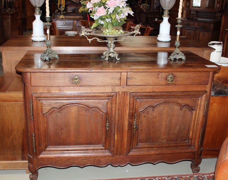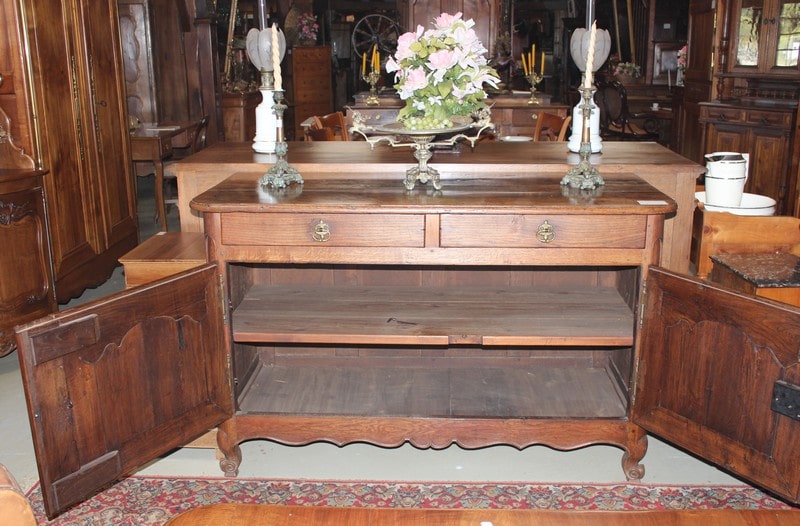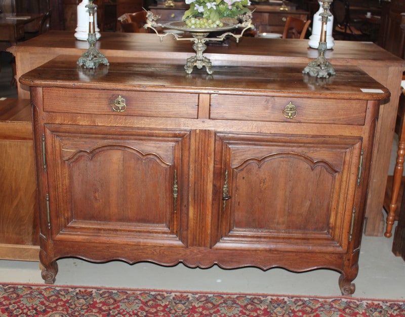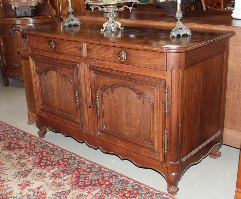 Buffet Louis XIV / Louis XV de propriété en chêne ouvrant par 2 portes et 2 tiroirs, et reposant sur 4 pieds à enroulement. Les poignées, fiches et entrées de serrure sont en cuivre. Région Nantaise. Époque : fin XVIIIe.