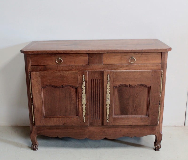 Buffet bas de style Louis XV en châtaignier ouvrant par 2 portes à découpe et 2 tiroirs avec anneaux de tirage en cuivre.