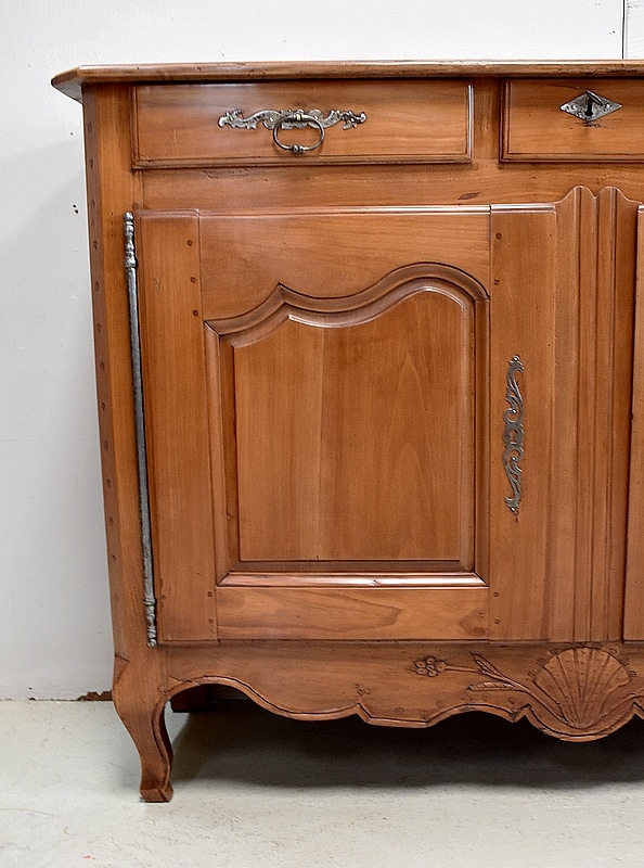 Charmant Buffet Louis XV en Merisier massif, avec Dessus Bois finement Mouluré dans son Pourtour et aux Angles avant Coupés.
