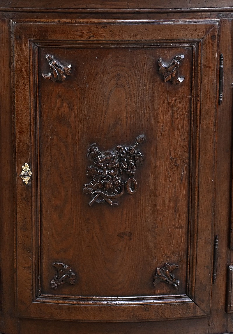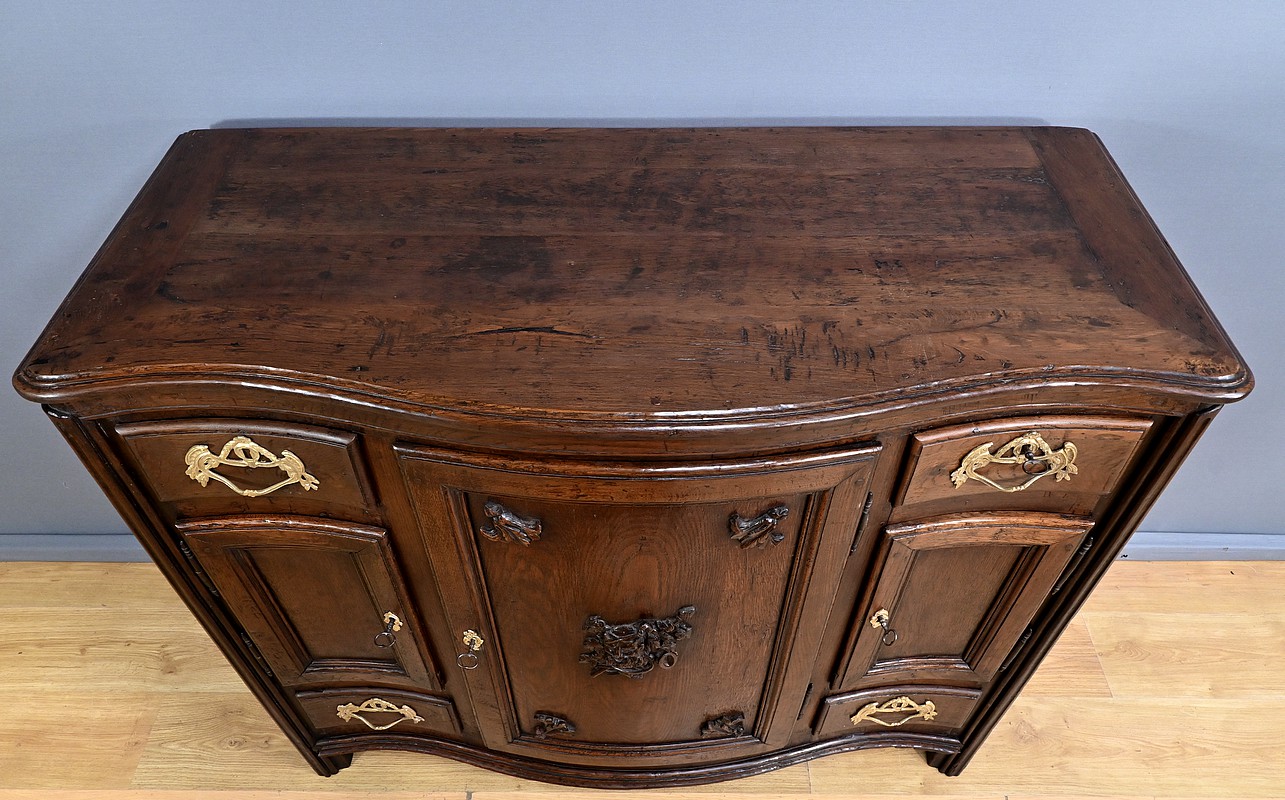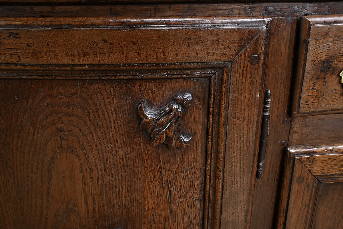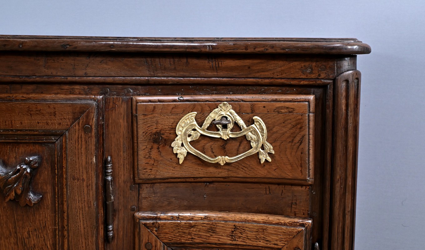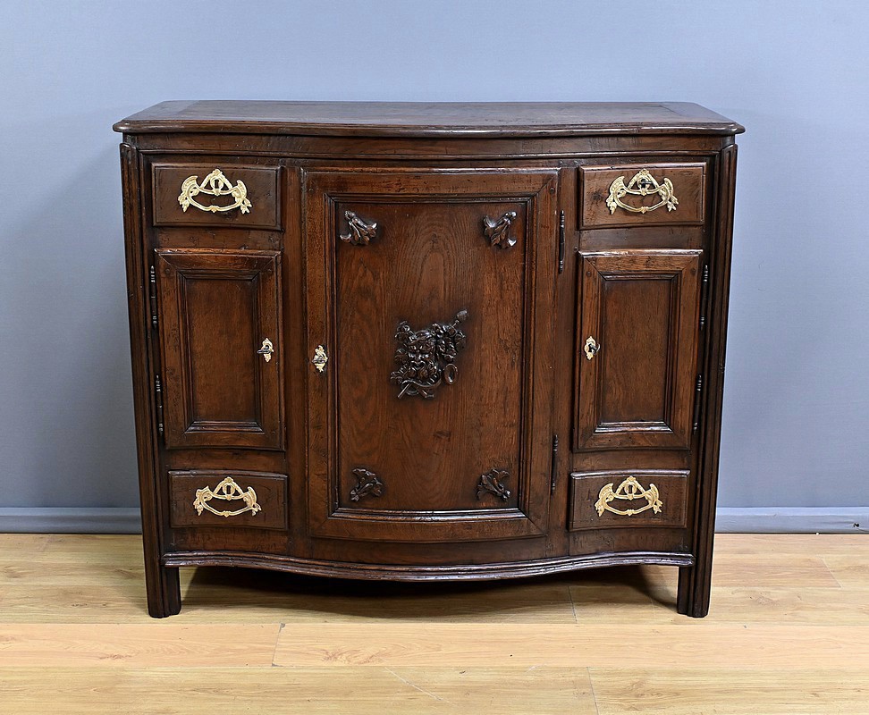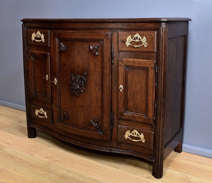 Ce magnifique buffet régional en chêne est une pièce de mobilier élégante et fonctionnelle qui apportera une touche de charme rustique à votre intérieur. Ce buffet à la façade bombée et mouvementée présente une finition soignée avec des détails sculptés et des poignées en bronze doré, ajoutant une note de sophistication à son allure traditionnelle. Il offre un espace de rangement généreux grâce à ses deux portes latérales moulurées, ses quatre tiroirs et sa grande porte centrale sculptée d’un grotesque au centre. Chaque porte est disposée sur gonds en fer et équipée d’une serrure fonctionnelle, d’une belle entrée en bronze accompagnée d’une clé. Les montants arrondis sont droits et cannelés. On appréciera ce buffet pour sa grande capacité de rangement et son authenticité.