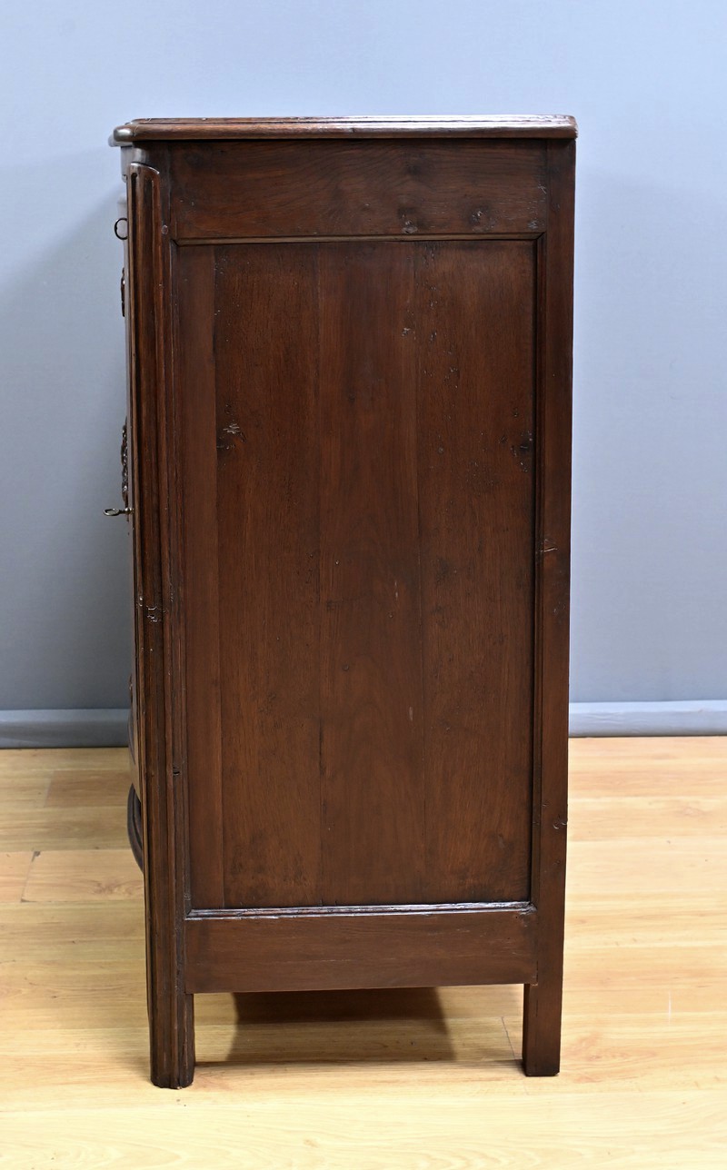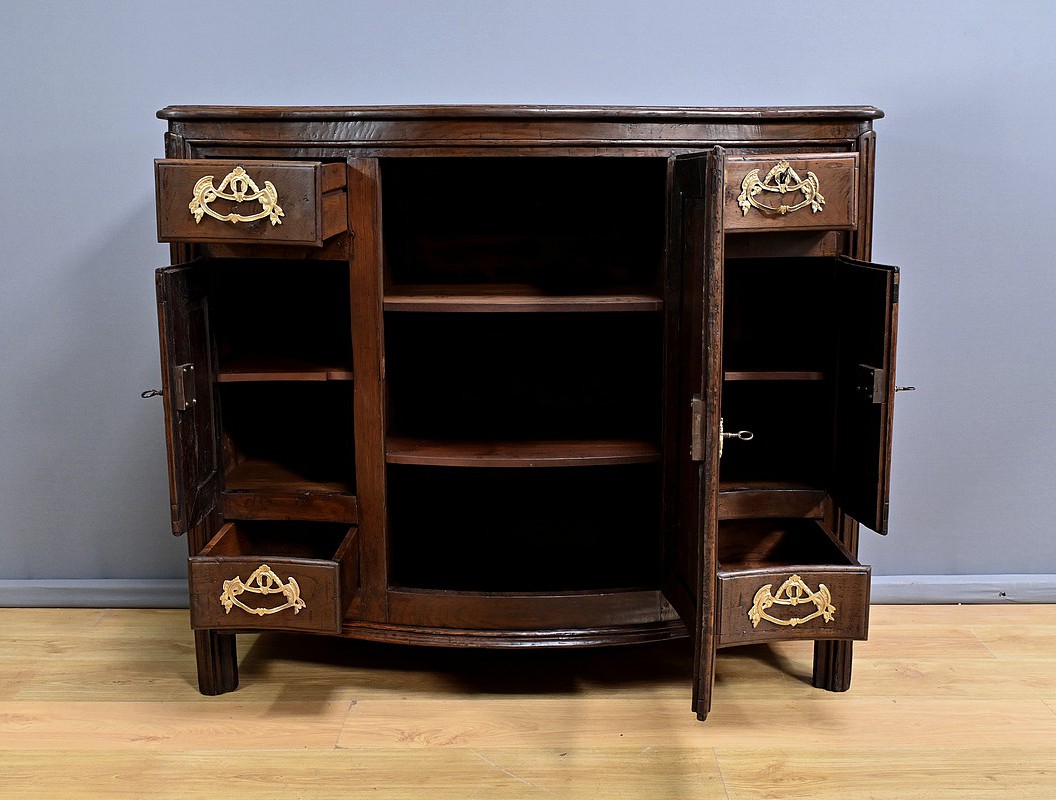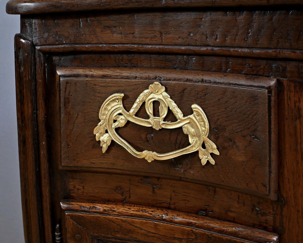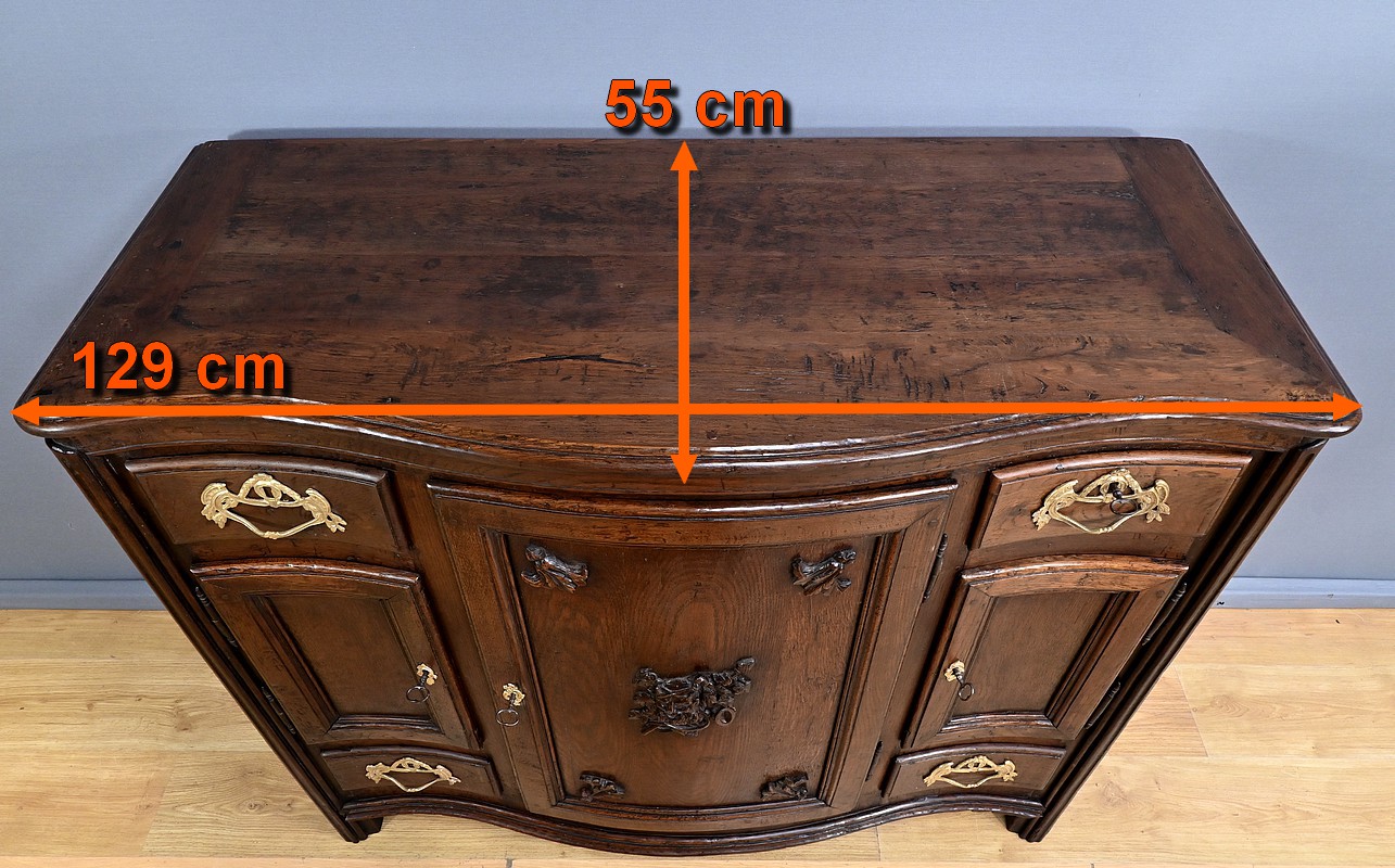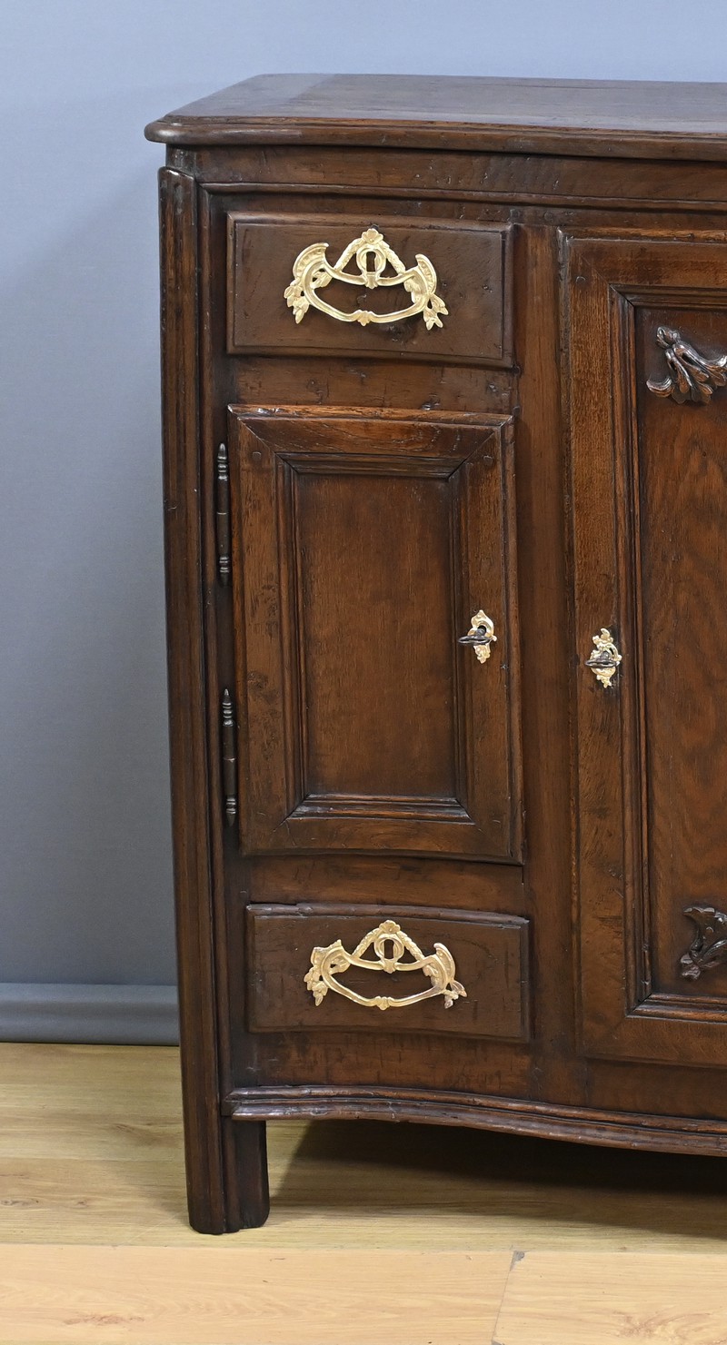 Ce magnifique buffet régional en chêne est une pièce de mobilier élégante et fonctionnelle qui apportera une touche de charme rustique à votre intérieur. Ce buffet à la façade bombée et mouvementée présente une finition soignée avec des détails sculptés et des poignées en bronze doré, ajoutant une note de sophistication à son allure traditionnelle. Il offre un espace de rangement généreux grâce à ses deux portes latérales moulurées, ses quatre tiroirs et sa grande porte centrale sculptée d’un grotesque au centre. Chaque porte est disposée sur gonds en fer et équipée d’une serrure fonctionnelle, d’une belle entrée en bronze accompagnée d’une clé. Les montants arrondis sont droits et cannelés. On appréciera ce buffet pour sa grande capacité de rangement et son authenticité.
