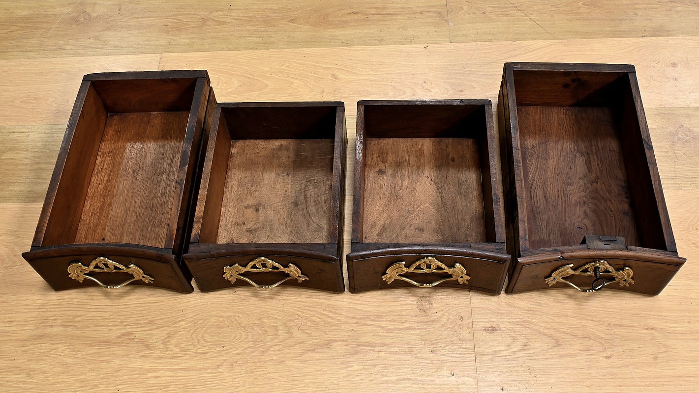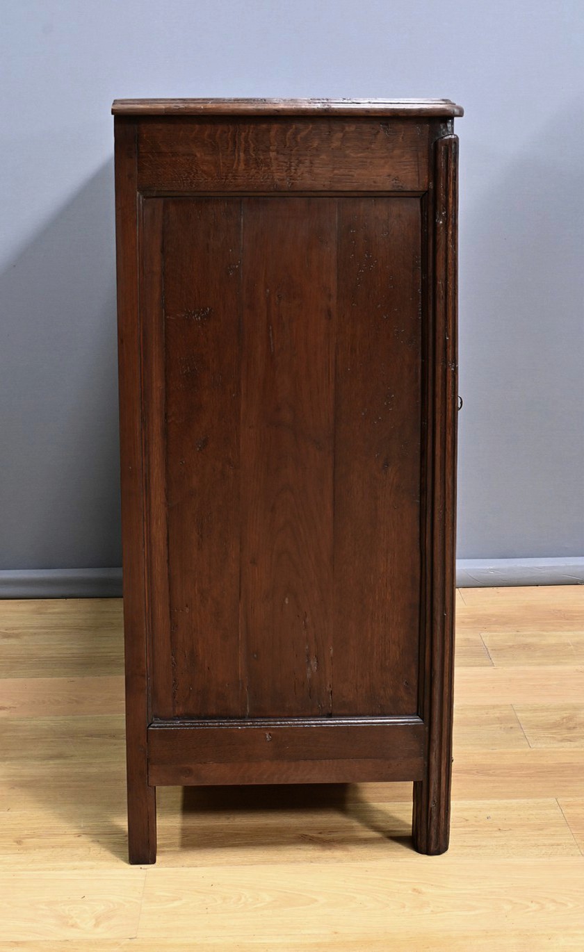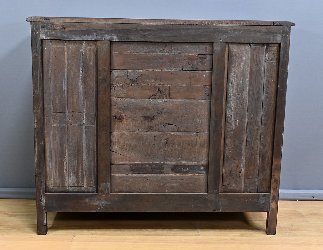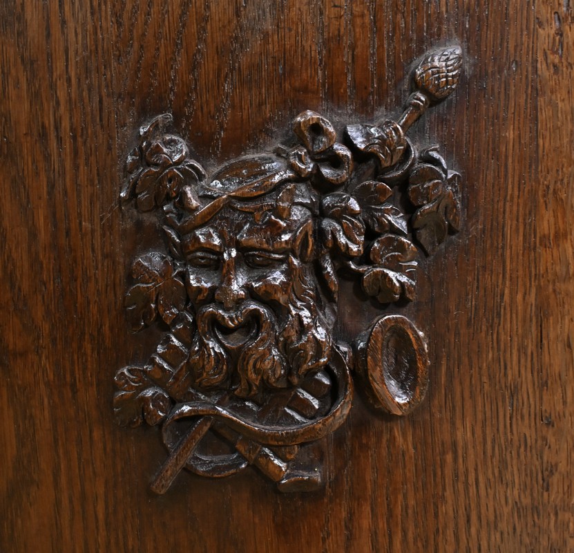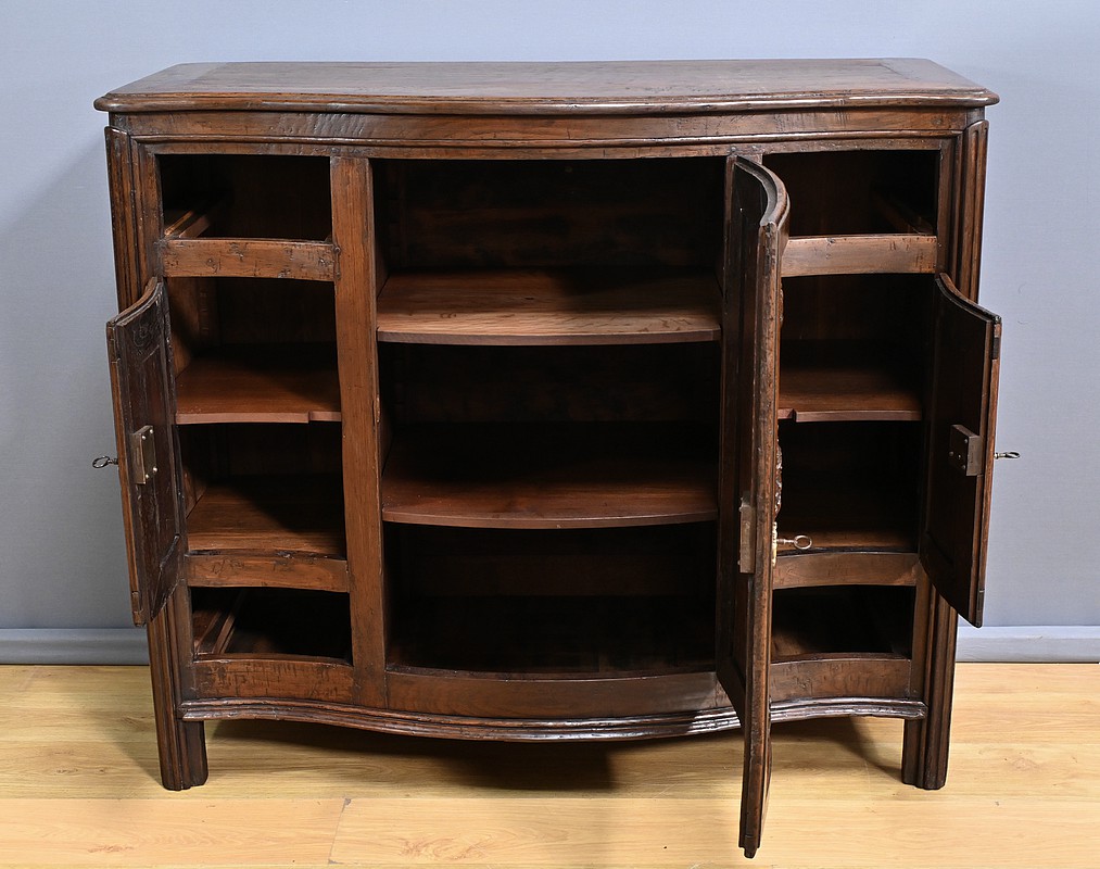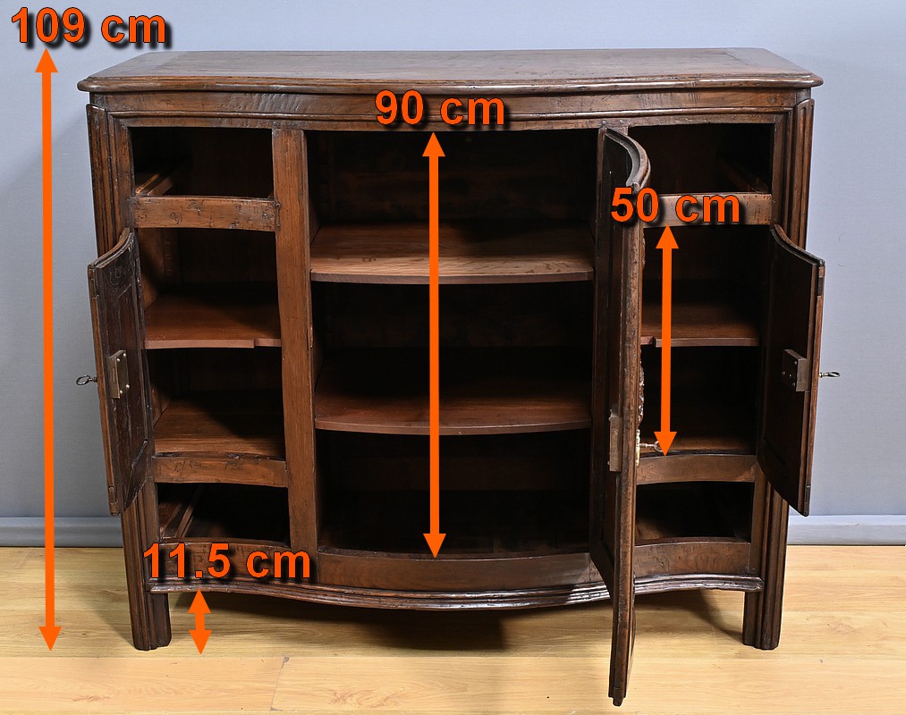 Ce magnifique buffet régional en chêne est une pièce de mobilier élégante et fonctionnelle qui apportera une touche de charme rustique à votre intérieur. Ce buffet à la façade bombée et mouvementée présente une finition soignée avec des détails sculptés et des poignées en bronze doré, ajoutant une note de sophistication à son allure traditionnelle. Il offre un espace de rangement généreux grâce à ses deux portes latérales moulurées, ses quatre tiroirs et sa grande porte centrale sculptée d’un grotesque au centre. Chaque porte est disposée sur gonds en fer et équipée d’une serrure fonctionnelle, d’une belle entrée en bronze accompagnée d’une clé. Les montants arrondis sont droits et cannelés. On appréciera ce buffet pour sa grande capacité de rangement et son authenticité.