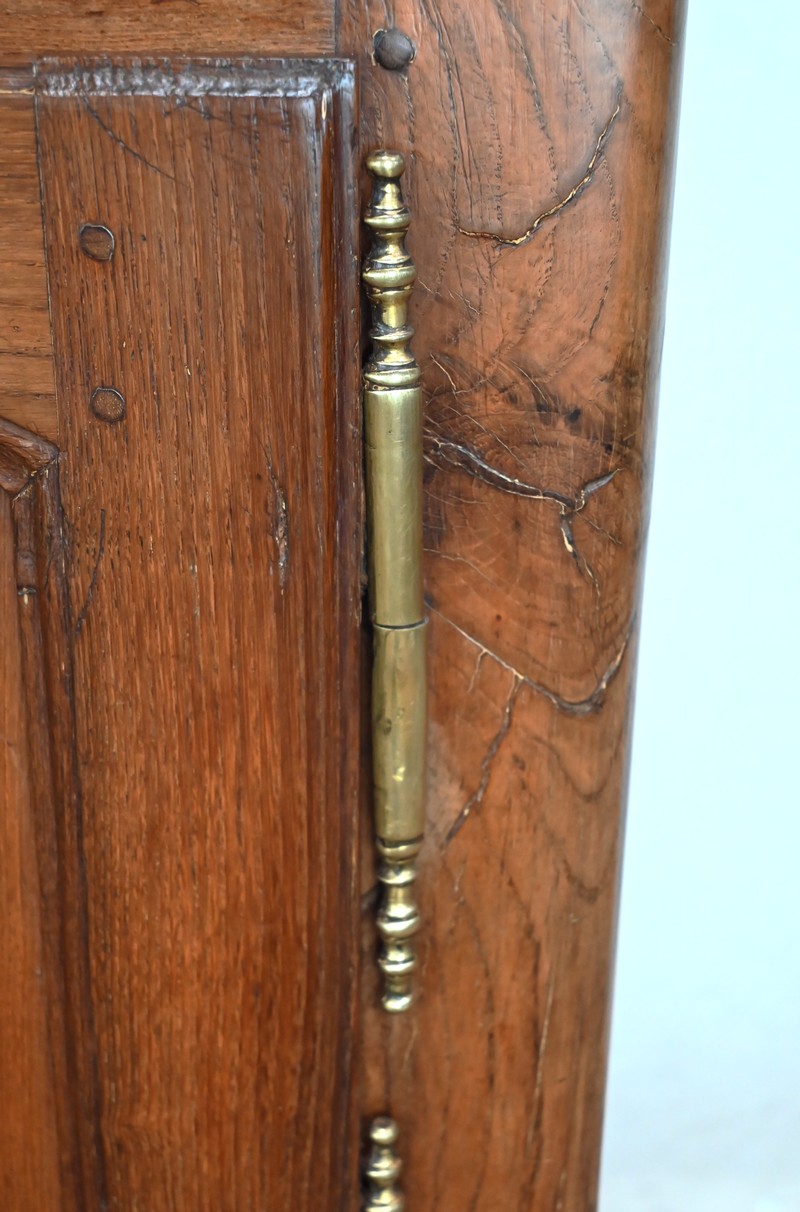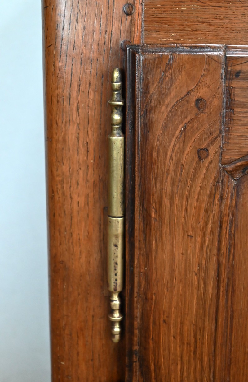 En dessous, ses deux portes à traverse haute sont mouvementées et à encadrement intérieur mouluré.