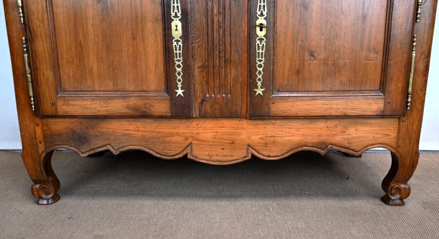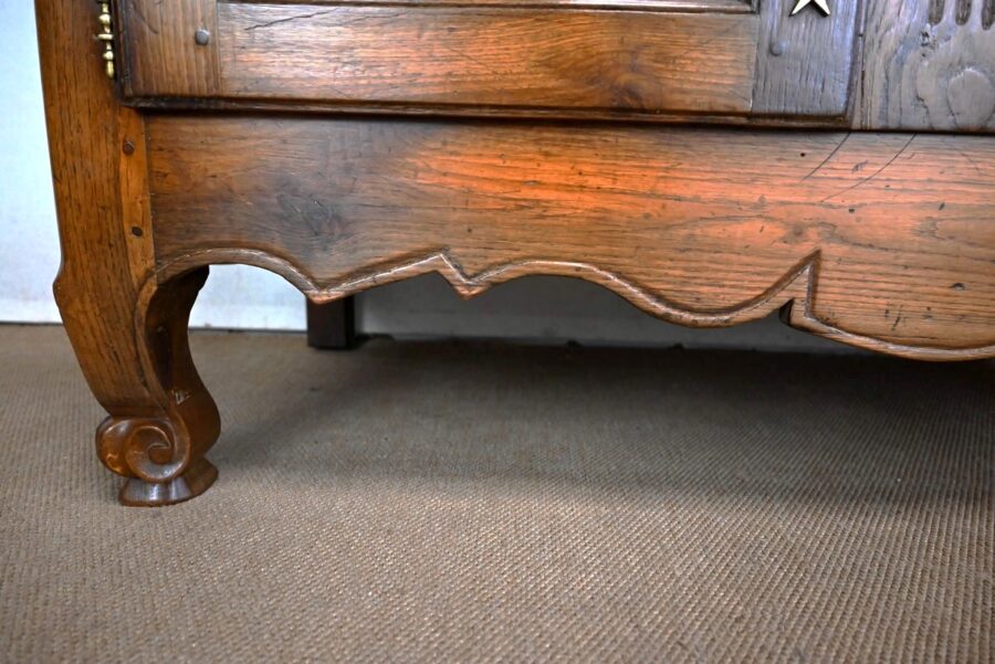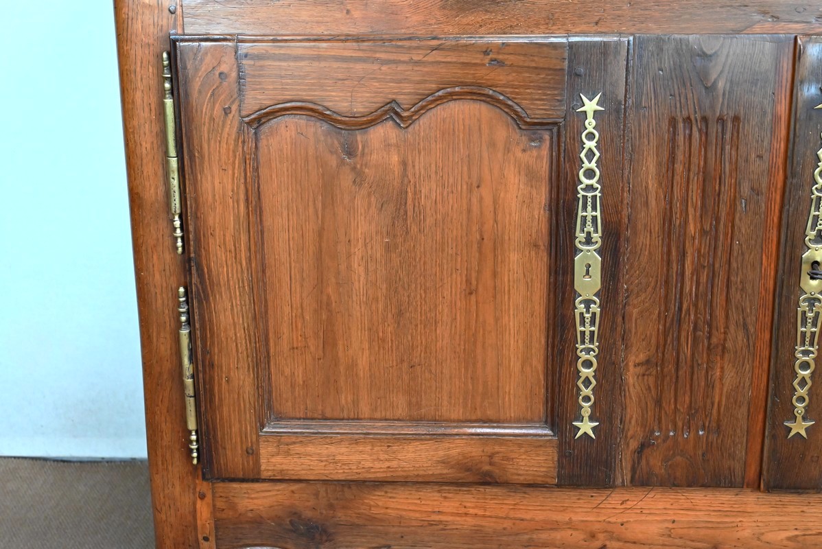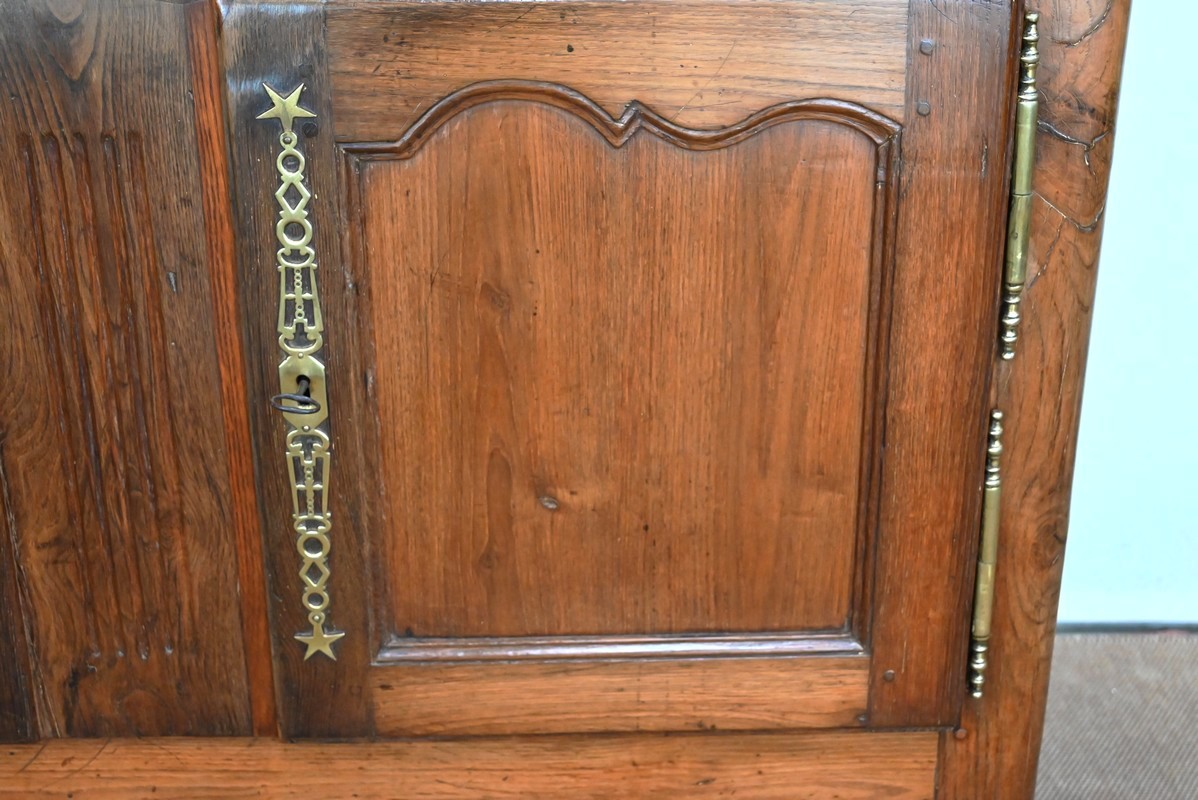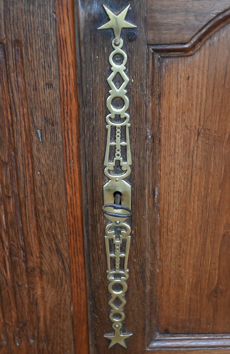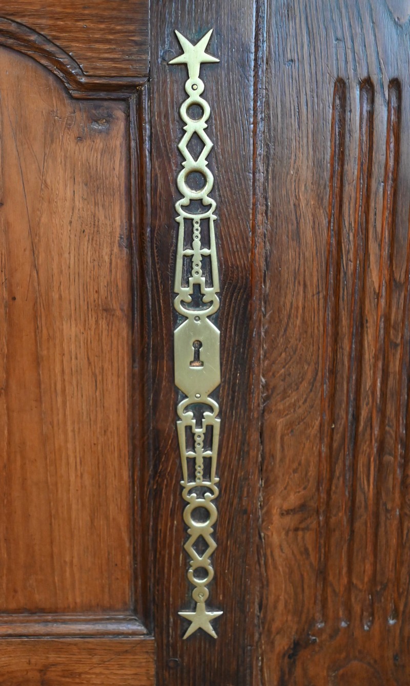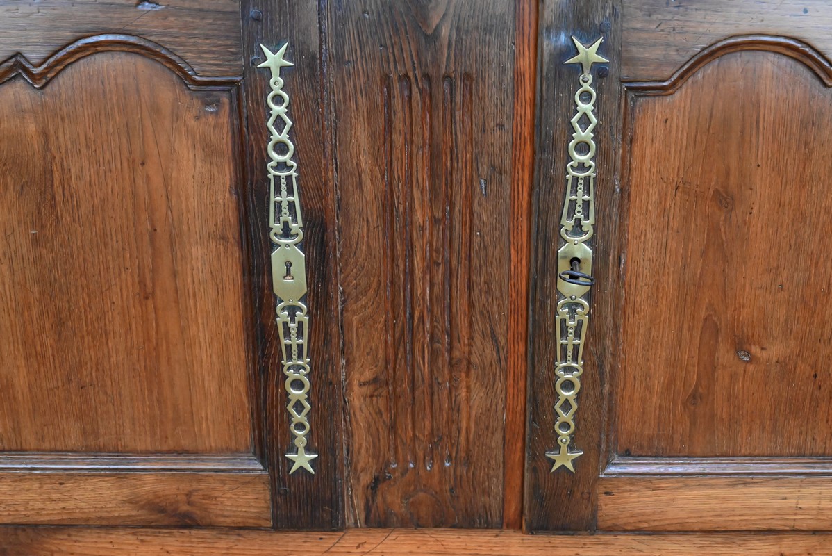 Elles s’ouvrent sur deux fiches en applique et sont munies d’une serrure fonctionnelle avec clé et d’une grande entrée étoile en laiton ajouré. Tous ces éléments sont d’origine.
