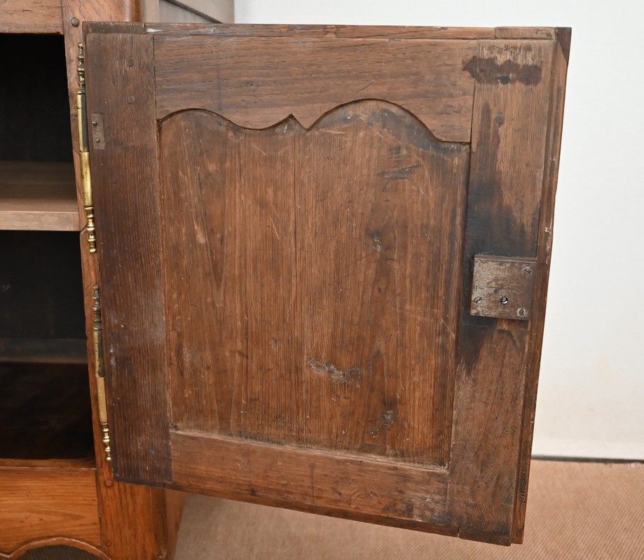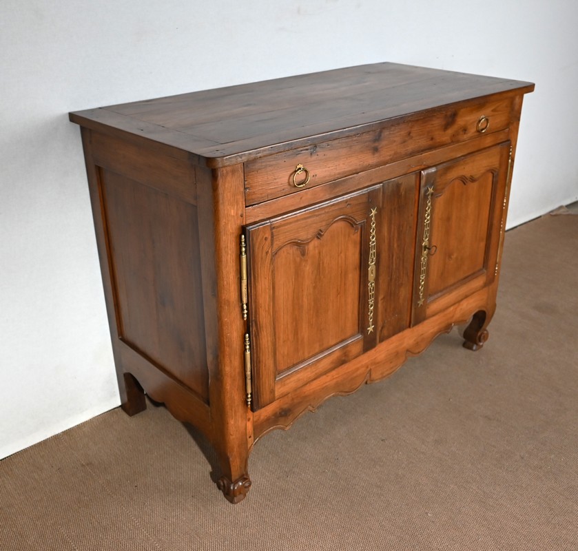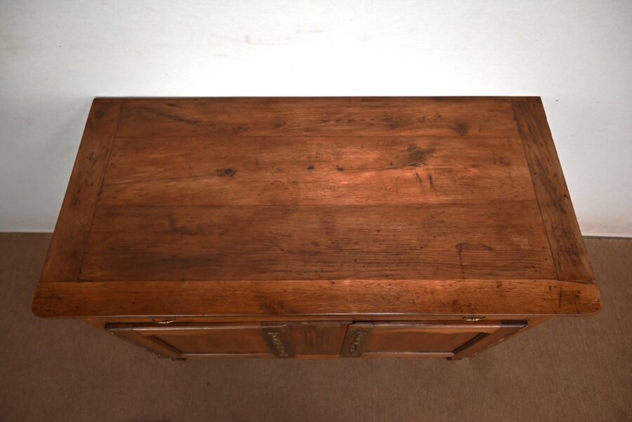 Ce buffet régional, en chêne clair massif, comporte en ceinture un long tiroir s’ouvrant par deux poignées anneaux en laiton.