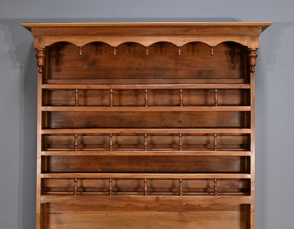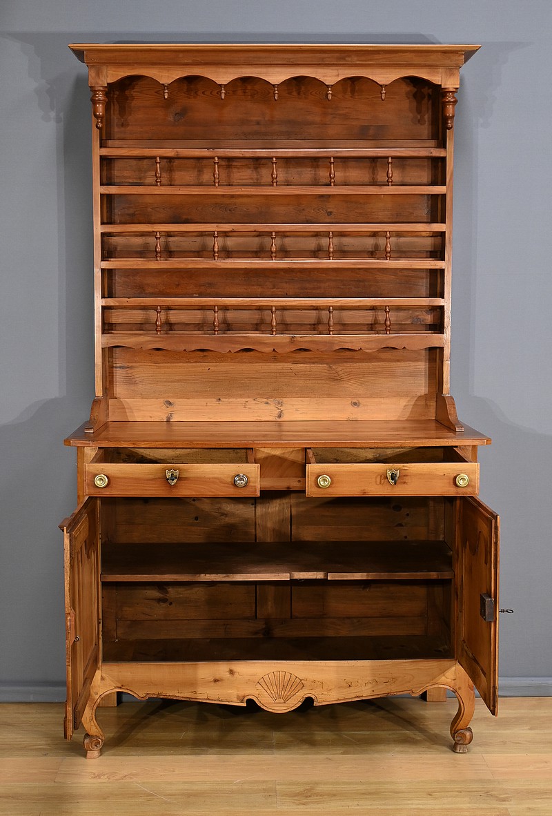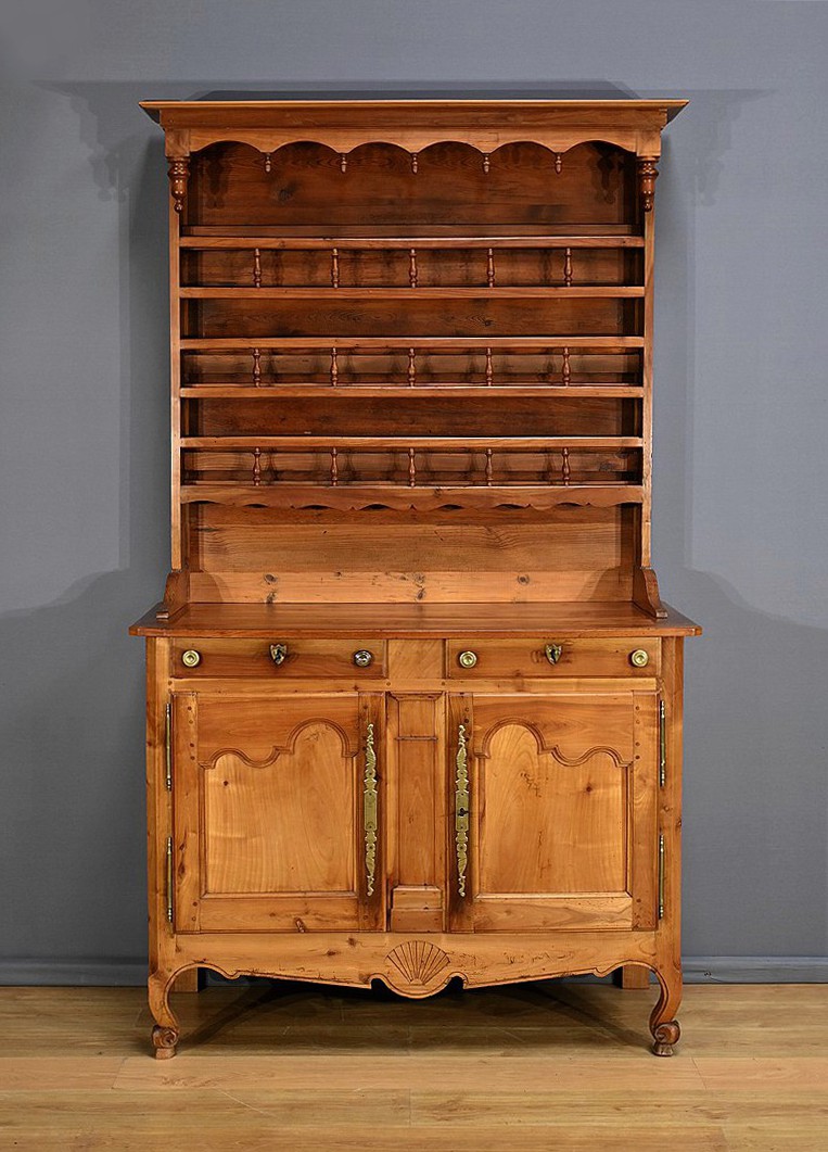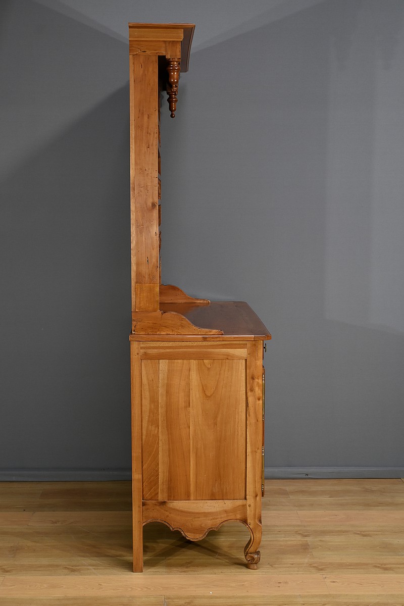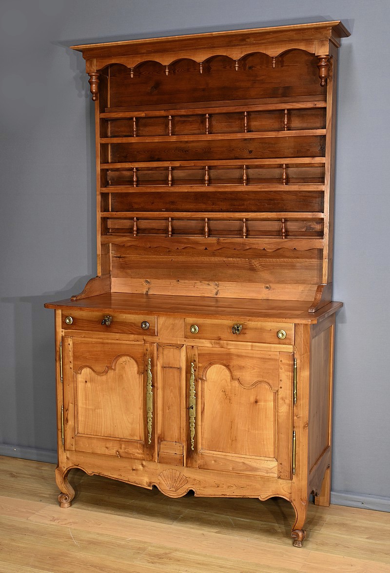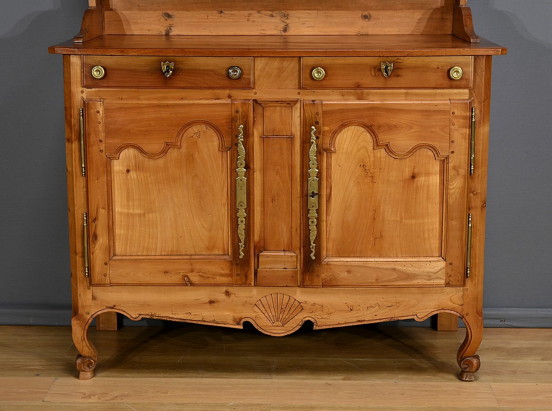 Buffet-vaisselier de style Louis XV en merisier massif de la région nantaise, dotée d’une partie haute munie de 3 étagères de présentation avec barres de bois et petites balustres. Le bas de la corniche est complété d’une traverse mouvementée agrémentée de petites toupies. Les angles hauts possèdent des éléments de bois tourné se terminant en boule. Une autre traverse mouvementée est présente en partie inférieure. Enfin, le buffet ouvre par deux tiroirs garnis de deux boutons laiton et d’une entrée cœur. Les clés et serrures sont fonctionnelles. Les portes élégamment moulurées avec panneau en défoncement au centre, sont agrémentées de longues entrées verticales et ciselées en laiton doré. Dessous, la traverse basse mouvementée et moulurée est sculptée d’une coquille en son centre. Ce meuble repose sur des pieds avant à enroulement et des pieds arrières droits.