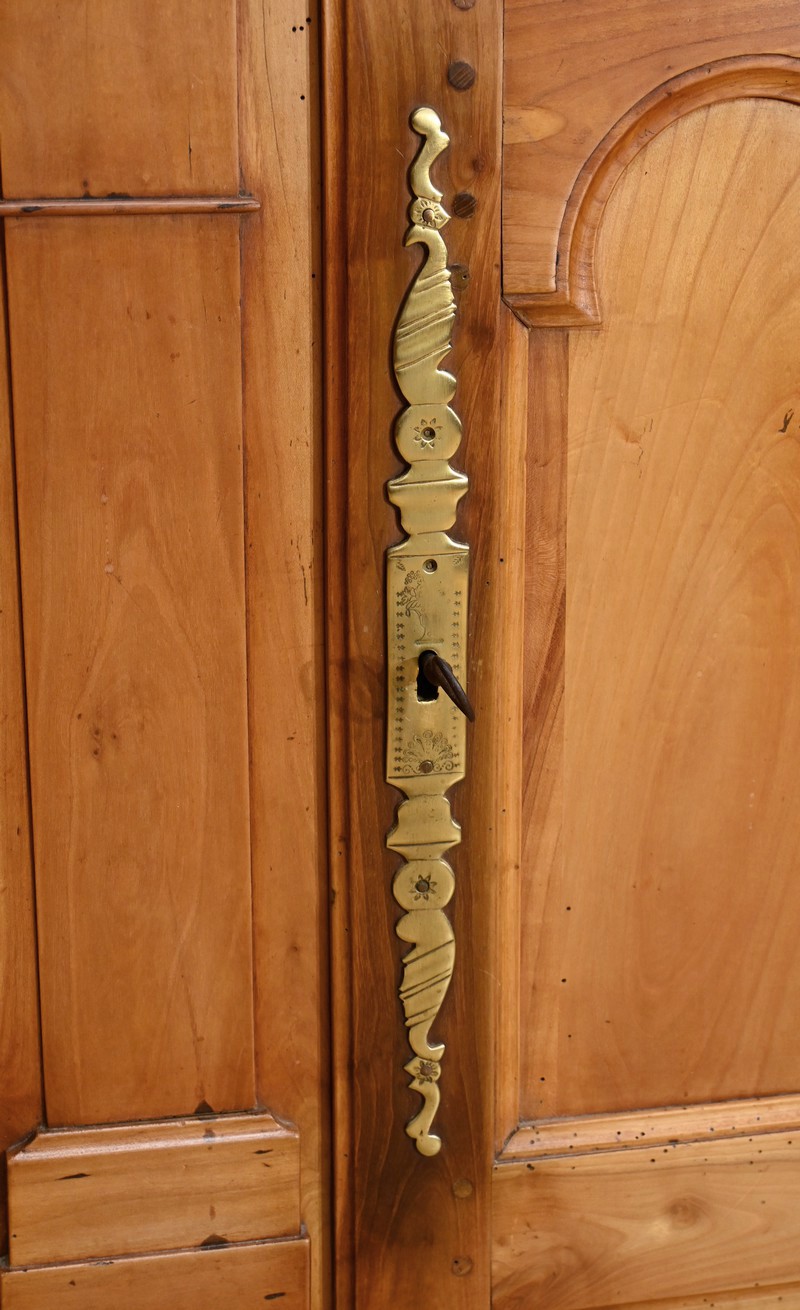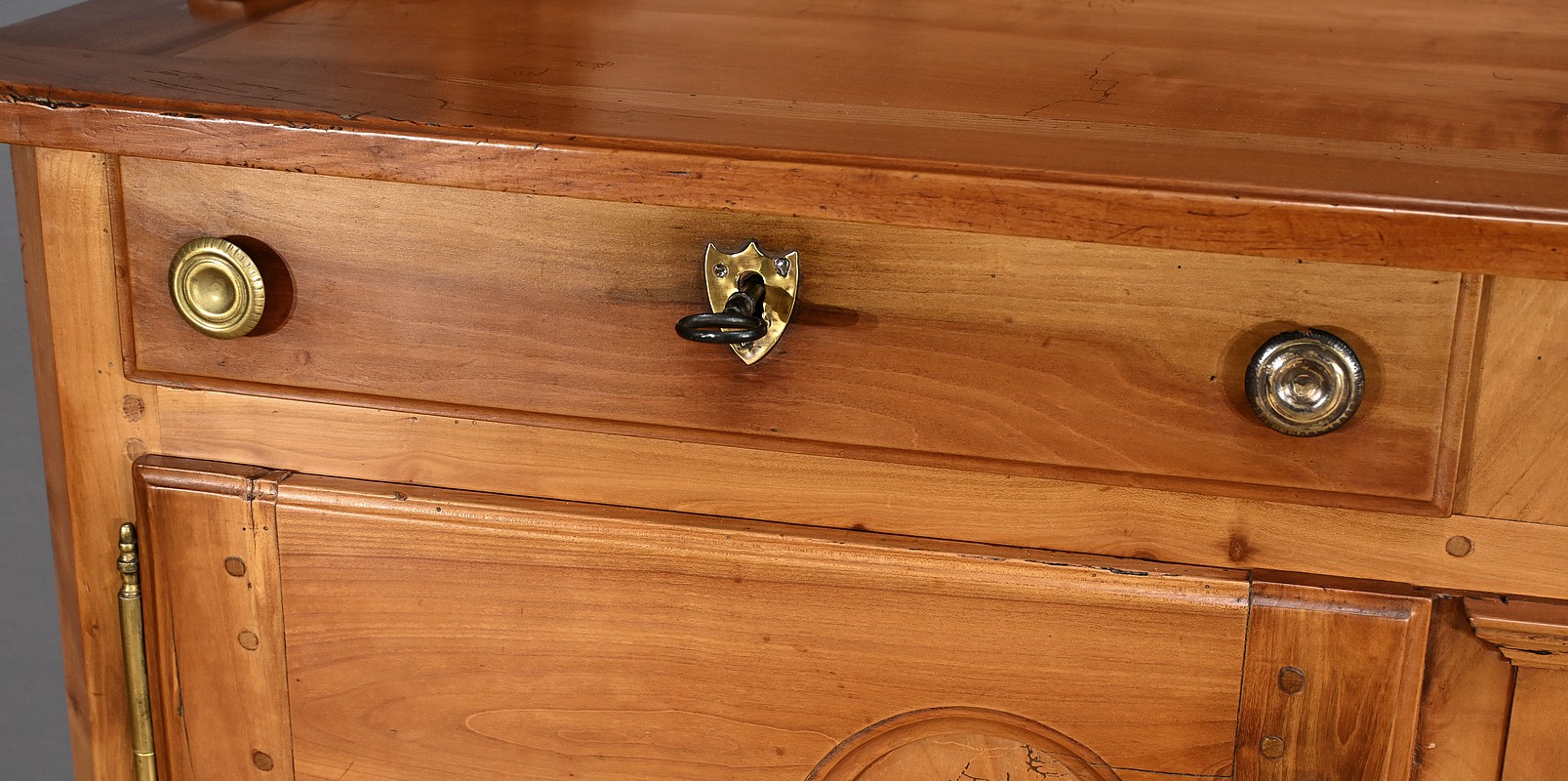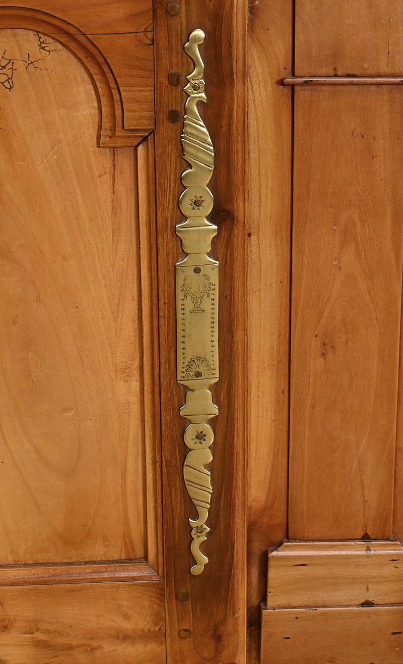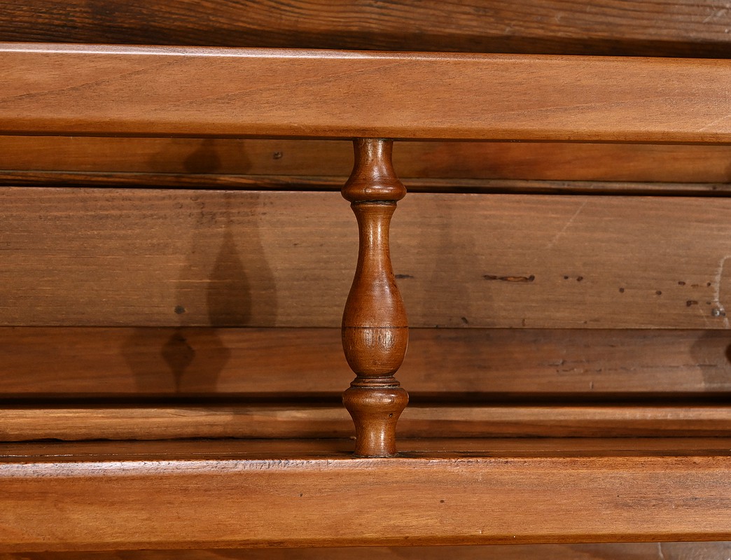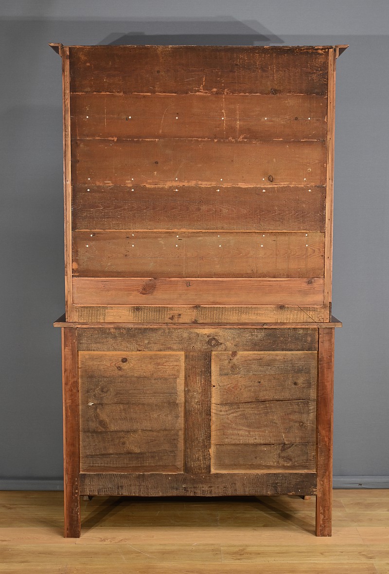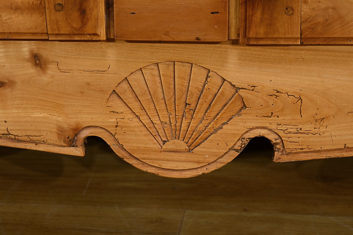 Buffet-vaisselier de style Louis XV en merisier massif de la région nantaise, dotée d’une partie haute munie de 3 étagères de présentation avec barres de bois et petites balustres. Le bas de la corniche est complété d’une traverse mouvementée agrémentée de petites toupies. Les angles hauts possèdent des éléments de bois tourné se terminant en boule. Une autre traverse mouvementée est présente en partie inférieure. Enfin, le buffet ouvre par deux tiroirs garnis de deux boutons laiton et d’une entrée cœur. Les clés et serrures sont fonctionnelles. Les portes élégamment moulurées avec panneau en défoncement au centre, sont agrémentées de longues entrées verticales et ciselées en laiton doré. Dessous, la traverse basse mouvementée et moulurée est sculptée d’une coquille en son centre. Ce meuble repose sur des pieds avant à enroulement et des pieds arrières droits.