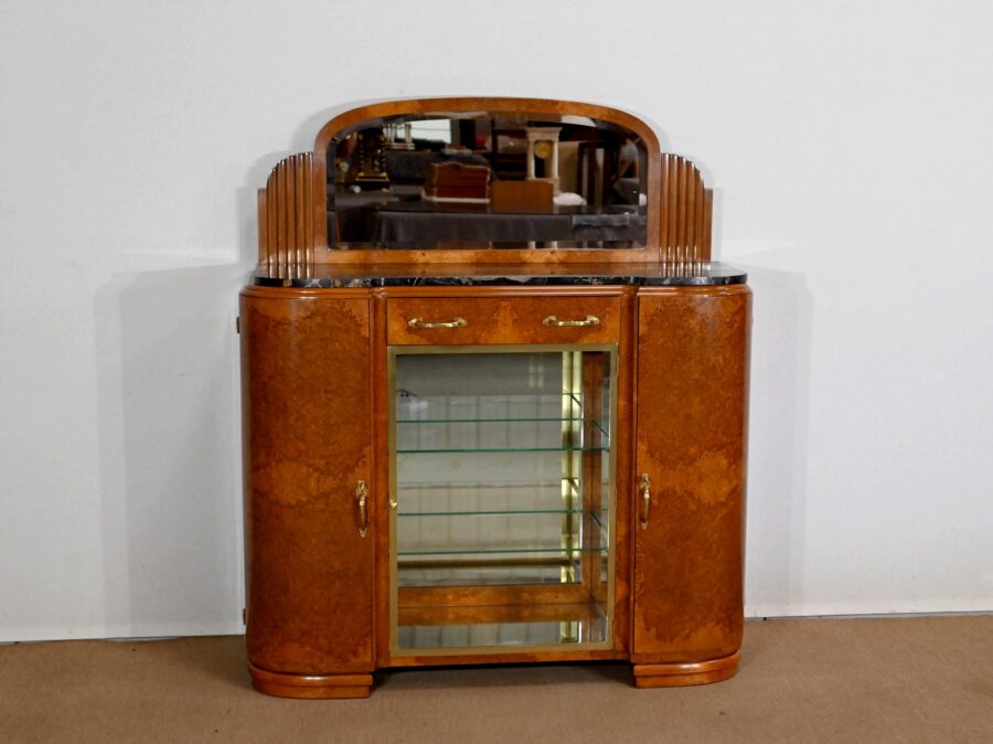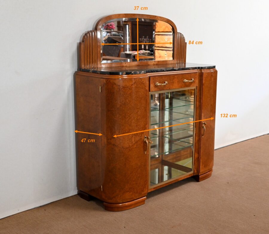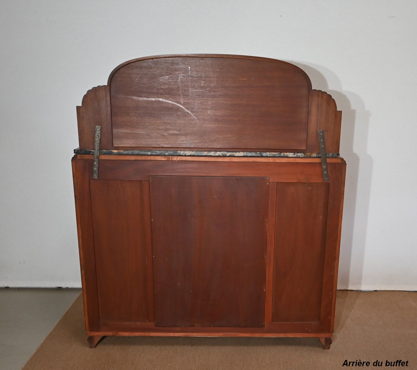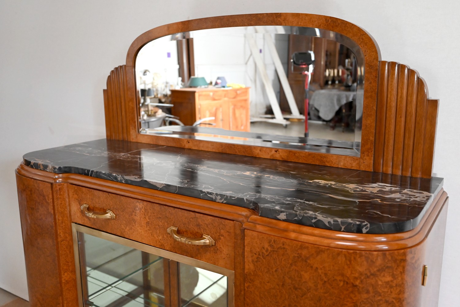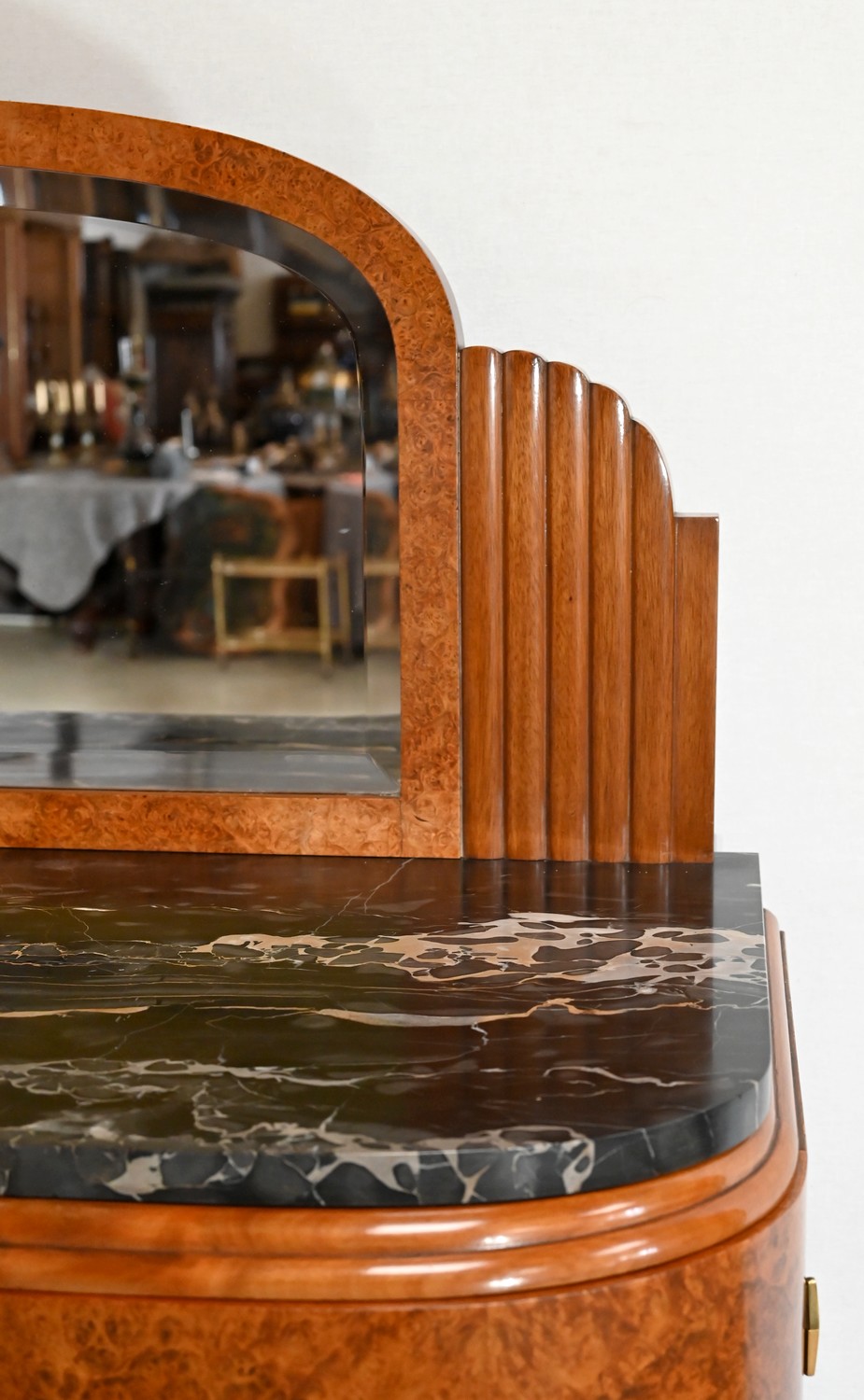 Ce buffet Art Déco, au dessus en marbre noir à veines blanches et orcres et aux pourtours à double moulure en acajou, est surmonté d’un dosseret. Sur ce dernier, on trouve un miroir au mercure, arrondi, à biseau, au cadre à placage de loupe de thuya, possédant sur chacune de ses extrémités des éléments godronnés en acajou.