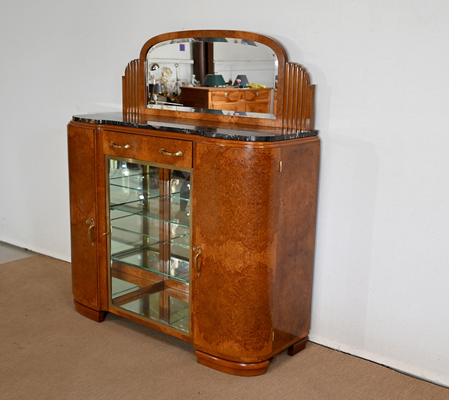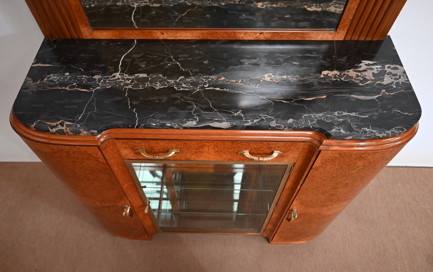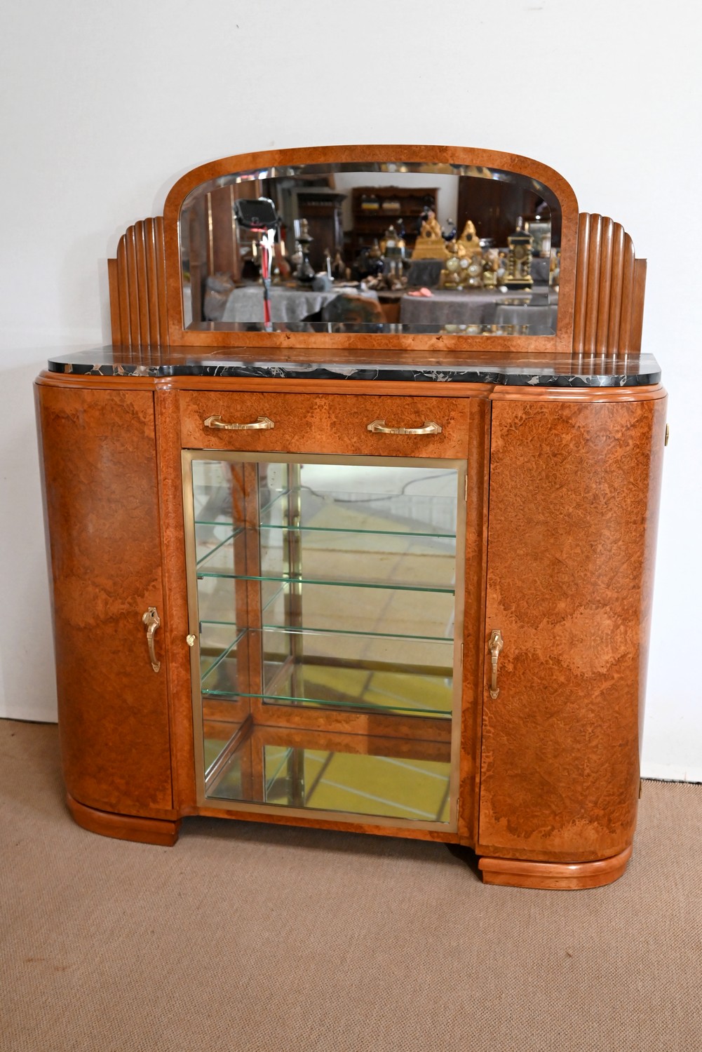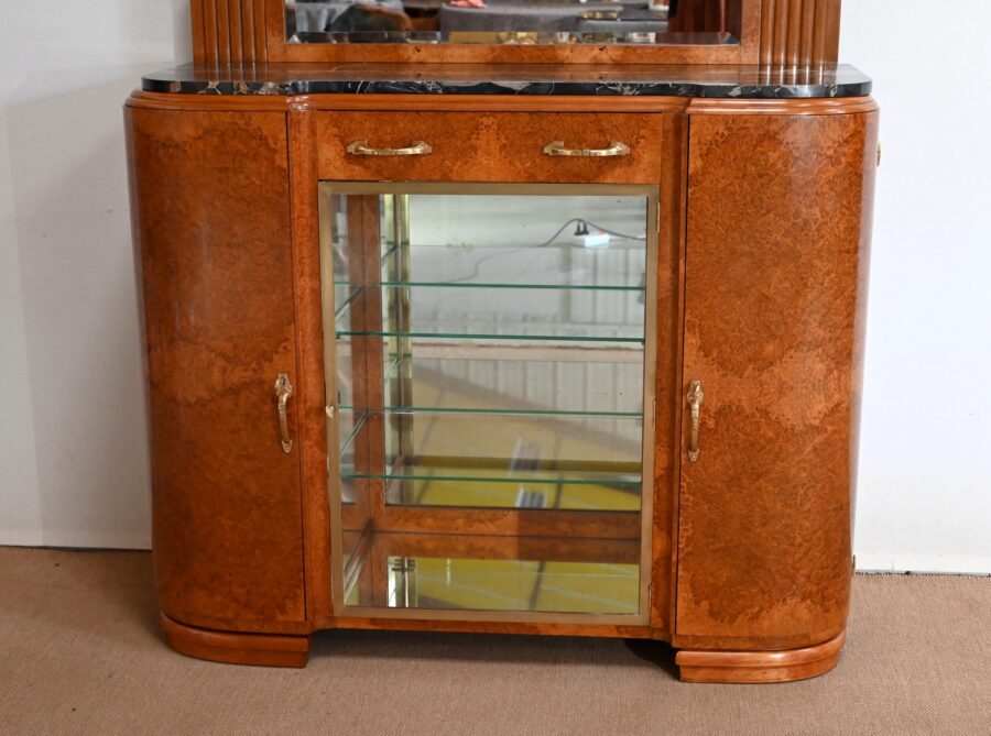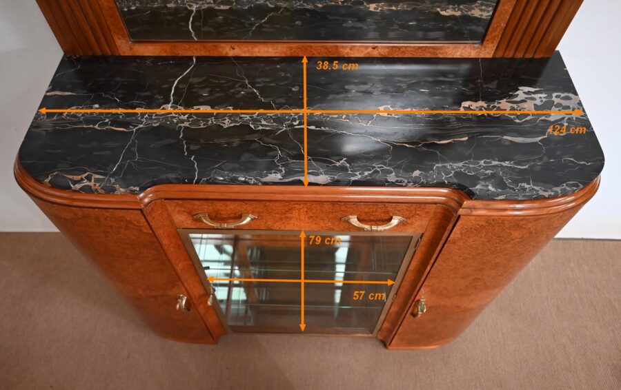 Ce buffet Art Déco, au dessus en marbre noir à veines blanches et orcres et aux pourtours à double moulure en acajou, est surmonté d’un dosseret. Sur ce dernier, on trouve un miroir au mercure, arrondi, à biseau, au cadre à placage de loupe de thuya, possédant sur chacune de ses extrémités des éléments godronnés en acajou.