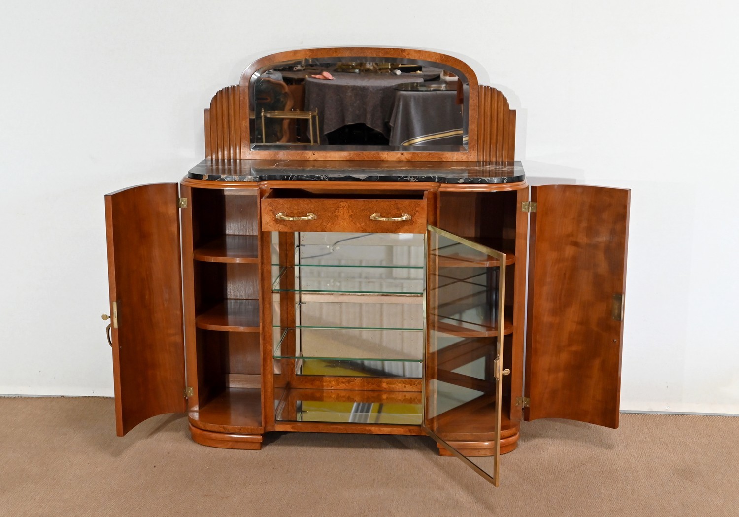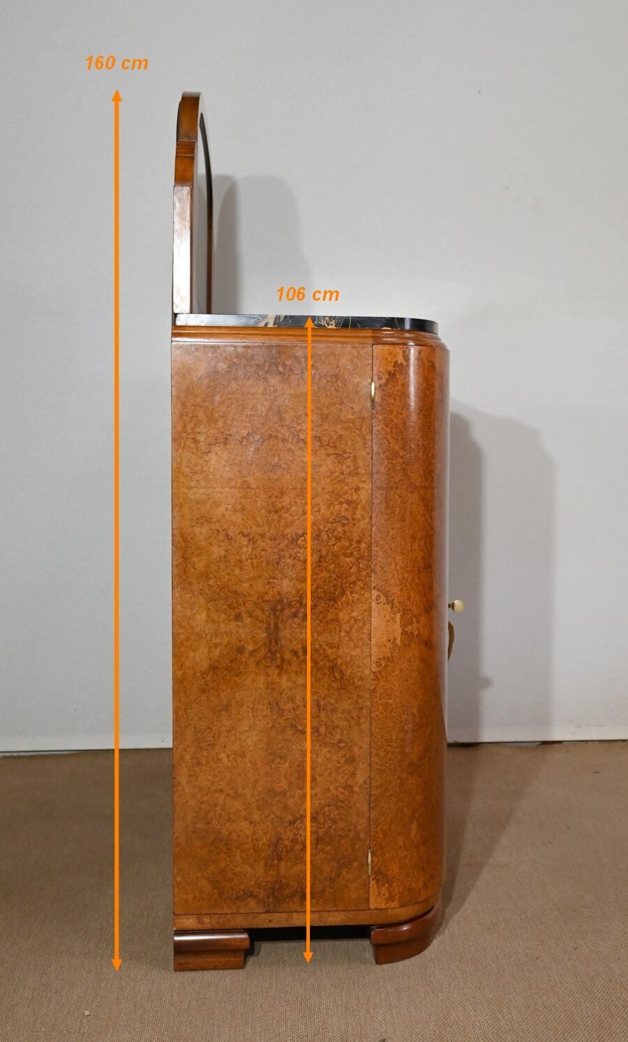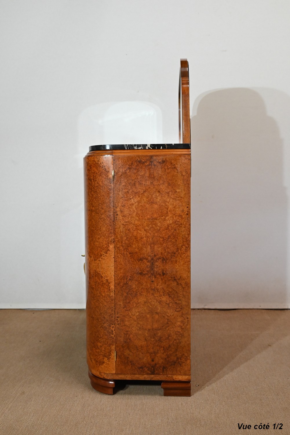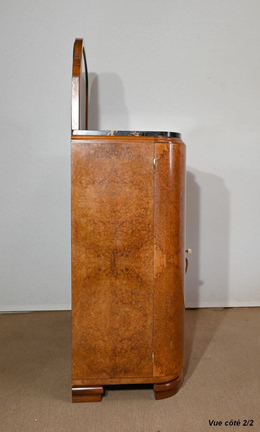 Ce buffet Art Déco, au dessus en marbre noir à veines blanches et orcres et aux pourtours à double moulure en acajou, est surmonté d’un dosseret. Sur ce dernier, on trouve un miroir au mercure, arrondi, à biseau, au cadre à placage de loupe de thuya, possédant sur chacune de ses extrémités des éléments godronnés en acajou.