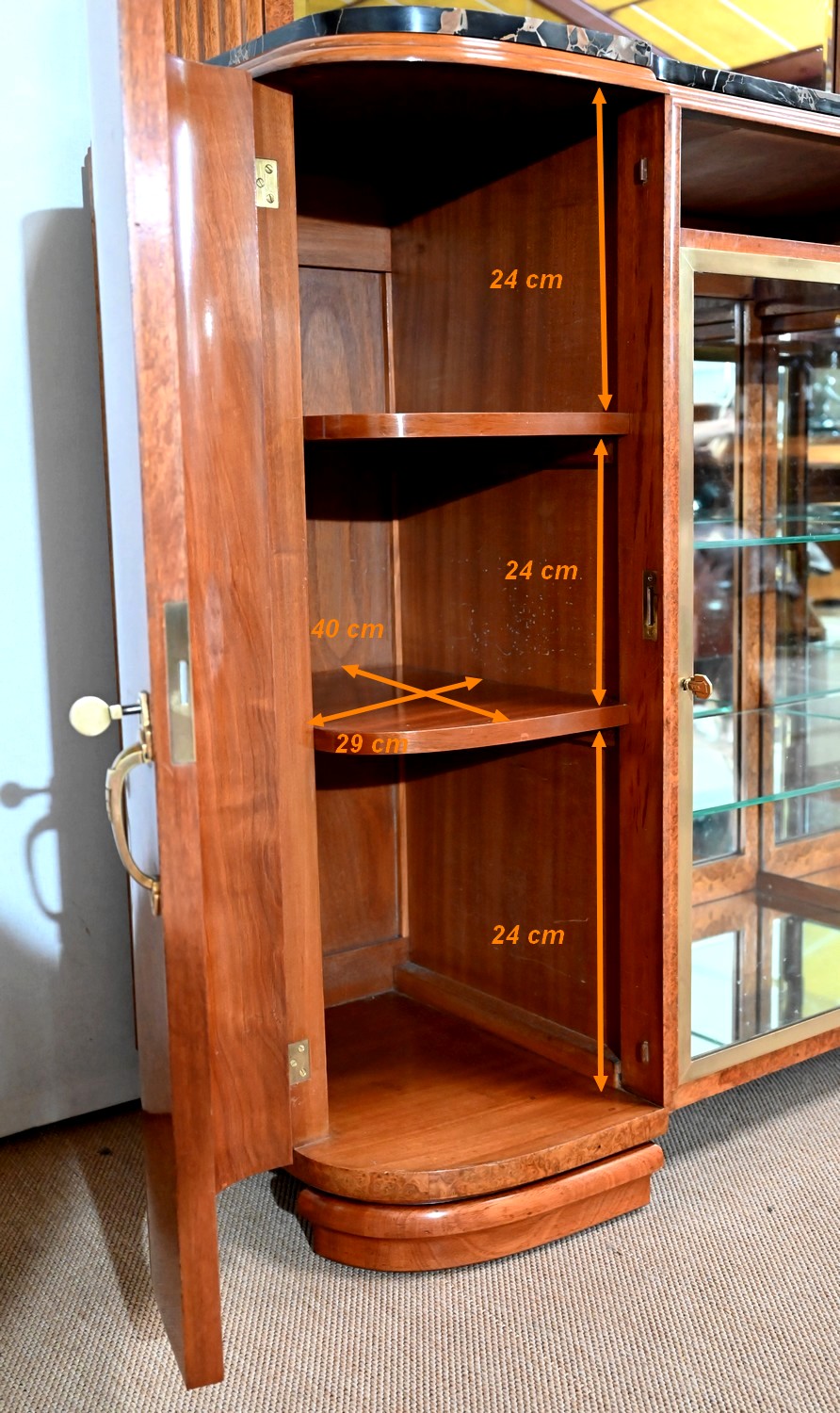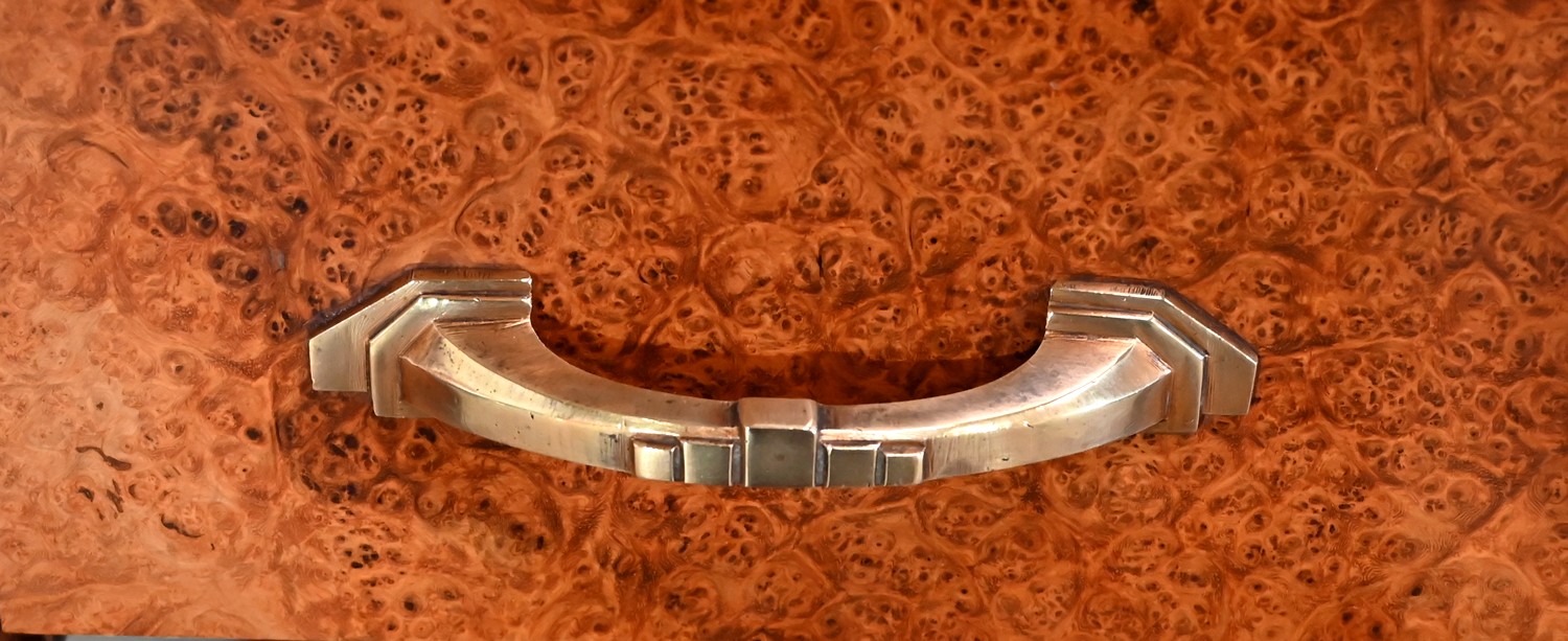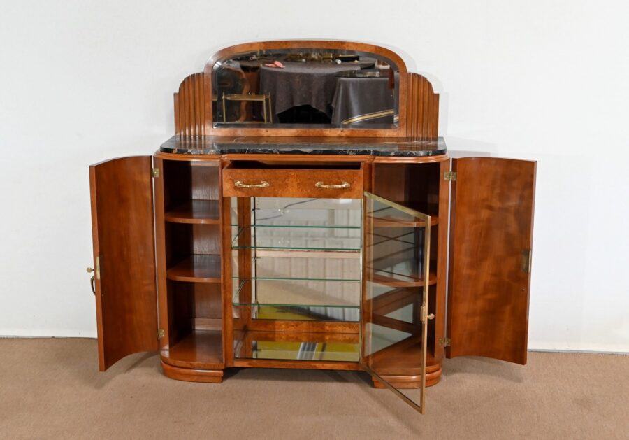 De chaque côté, ce Buffet ouvre par deux portes arrondies en placage de loupe de thuya, avec poignées en bronze dont la serrure et la clef sont d’origine et en état de fonctionnement. Elles découvrent deux étagères, formant trois espaces de rangement.