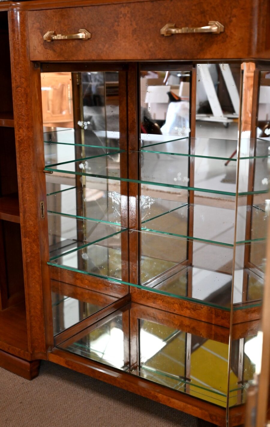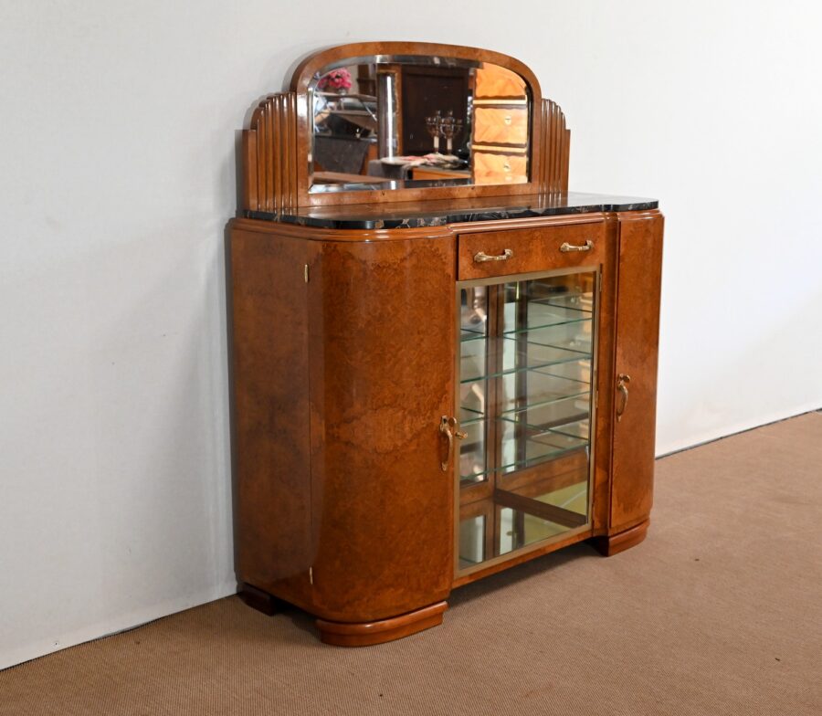De l’ancienne Maison Stourm à Paris, spécialisée dans l’ameublement d’Art, ce buffet vitrine est typique de l’époque Art Déco, avec ses formes arrondies et sa jolie couleur.