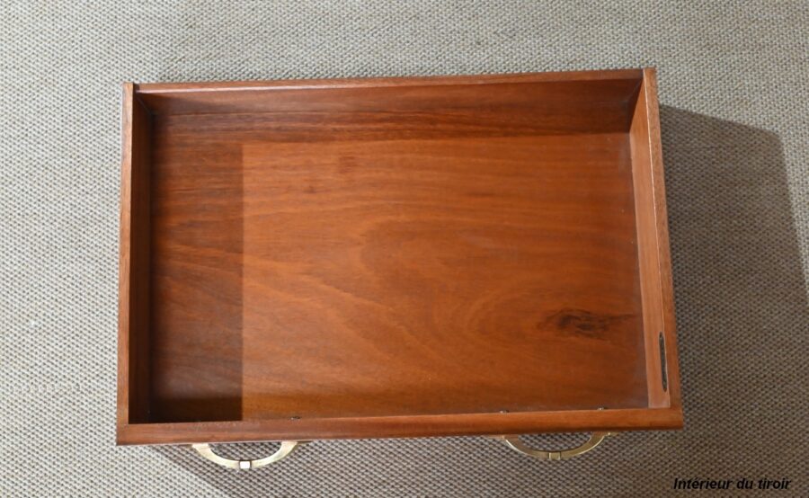 Dans la partie centrale, nous avons un tiroir à deux poignées en bronze. En dessous, une porte en verre à encadrement laiton. L’intérieur, garni de miroirs, forme une vitrine disposant de deux étagères en verre.