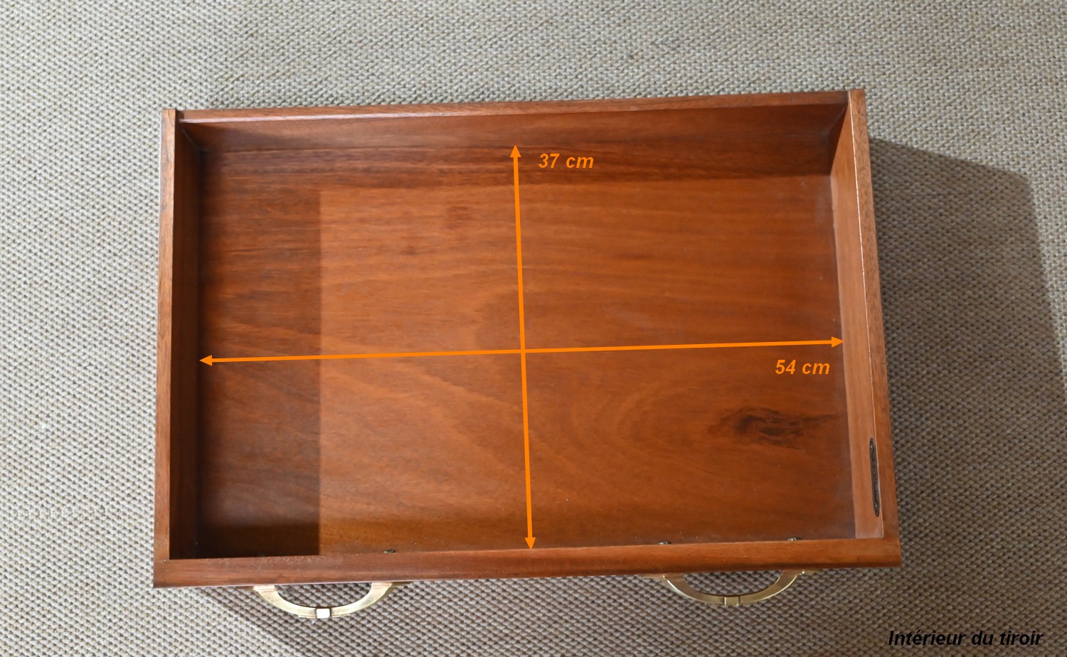 Son piètement se compose, à l’avant, de pieds en acajou à double moulure, qui suivent la courbe des portes, et de pieds droits à l’arrière.