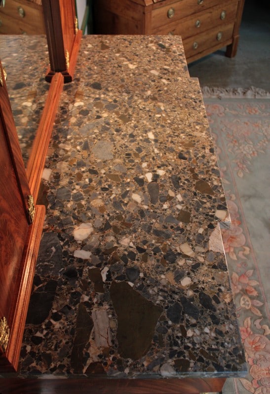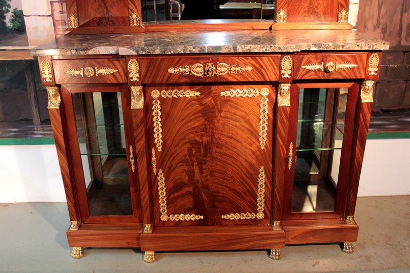 Desserte de style ‘Retour d’Égypte’ en ronce d’acajou avec dessus en marbre gris surmonté d’un miroir à encadrement. Elle ouvre par 3 tiroirs dans le bandeau et 3 portes en partie basse, celle du centre étant plus large et pleine, tandis que celles des côtés étant vitrées sur 2 faces. Fond miroir et étagère en verre à l’intérieur.
