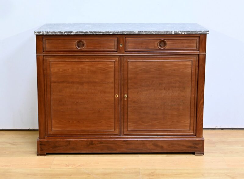 Composé d’un grand tiroir en ceinture ouvrant par une poignée avec attache en fer dans son centre, ce meuble de caractère est muni de deux portes à mouvement haut asymétrique se rejoignant au centre l’une sur l’autre sans pilastre. Ces portes présentent un intérieur à encadrement avec une légère moulure et de chaque côté des petits gonds en fer discret. Au centre deux entrées en fer élégamment ciselé bénéficient d’une serrure et d’une clé en état de fonctionnement. Cette ferronnerie est complètement authentique à cette époque. A l’intérieur de ce mobilier sobre nous découvrons une large étagère sur crémaillères.