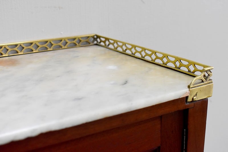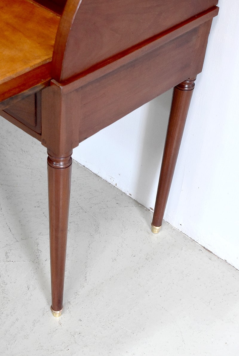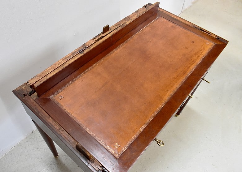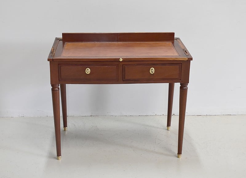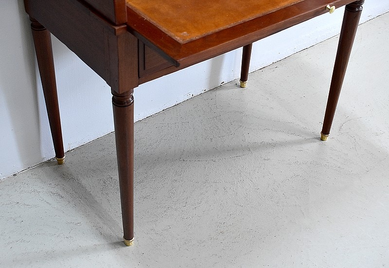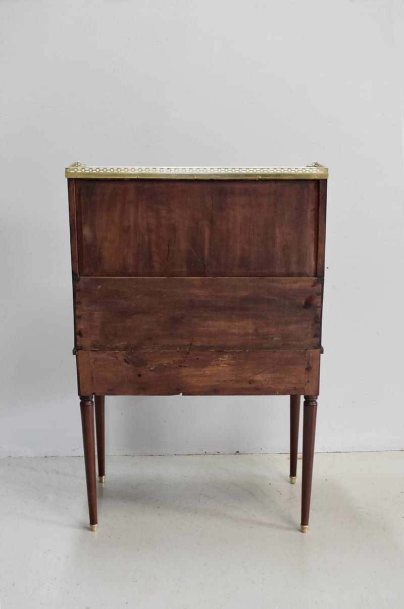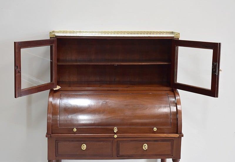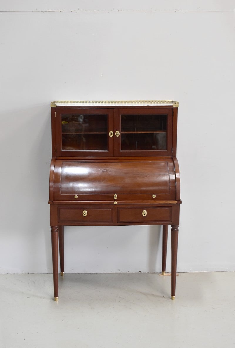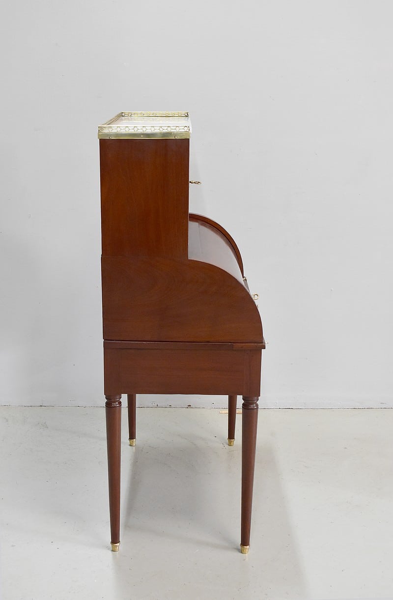 Bonheur du jour Louis XVI à Cylindre et à gradin en Acajou de Cuba massif et placage d’Acajou. Son dessus en marbre blanc avec ses marque d’usure est ceinturé d’une galerie en laiton ajourée.