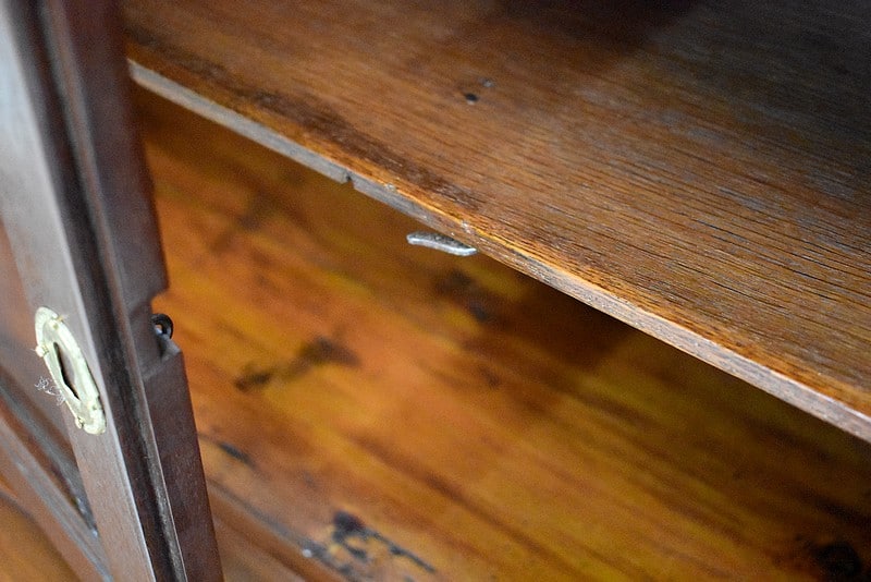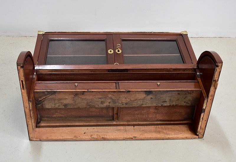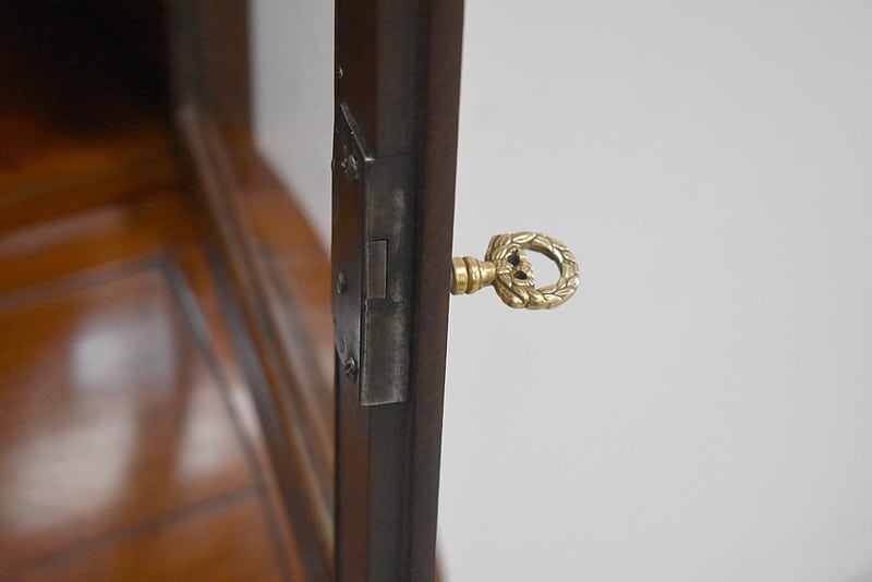La partie haute ouvre par deux petites portes vitrées fermant à clef donnant accès à l’intérieur à une étagère fixe.