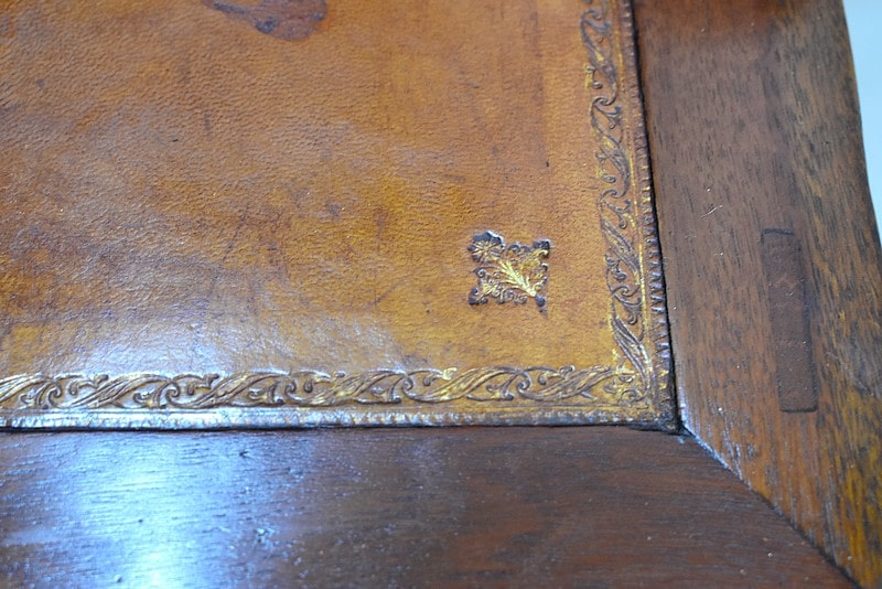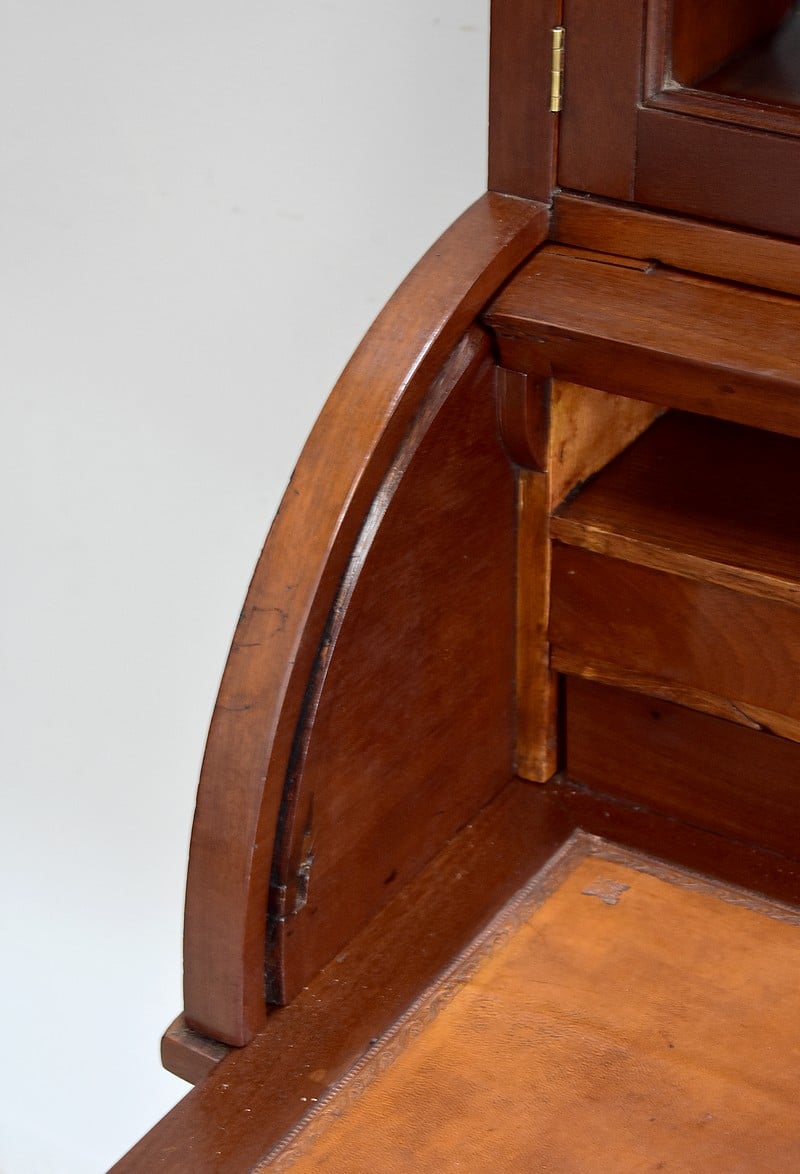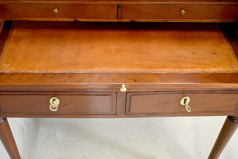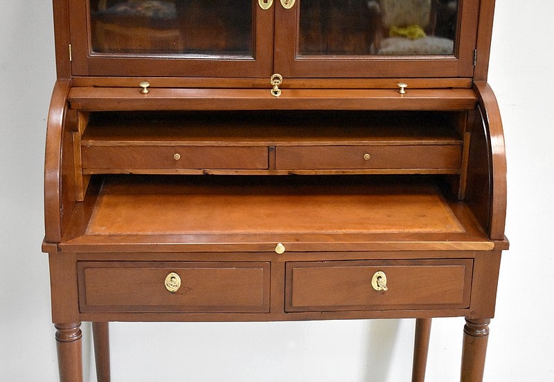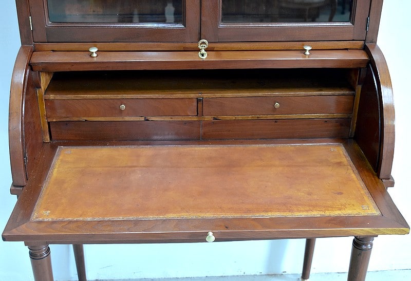 En partie médiane, le cylindre qui ferme à clef, s’ouvre sur un intérieur composé d’une niche en partie haute, de deux tiroirs en dessous et d’une tablette rétractable recouverte d’un cuir ancien couleur abricot.